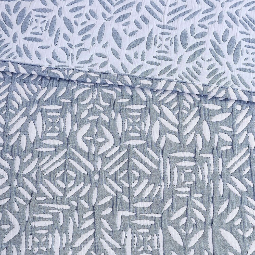 This beautiful matelasse set includes an oversized light weight quilt, two shams, and a square decorative pillow. The reverse applique style of the botanical motifs adds a delicate texture to the set, while the fully reversible design allows you to switch between two color schemes, both featuring blue and white. The embroidered decorative pillow have a removable cover with hidden zipper, and the hypoallergenic polyester pillow filling is dustproof and contains no allergens. This quilt set is also OEKO-TEX certified ensuring quality comfort and wellness.. Features Fully reversible - two modern botanical designs for the price of one, same pattern, different color schemes; Embroidered throw pillows have removable cover with hidden zipper; Machine washable for easy care; Hypoallergenic polyester pillow filling contains no allergens and is dustproof; OEKO-TEX labeled textile certified as safe on skin; 4 Piece; Material/Fabrication: Quilt/Sham: 90% polyester 10% cotton matelasse jacquard; Pillow: 100% cotton canvas, polyester filling; King/Cal King: 1 Quilt:110"W x 96"L; 2 King Shams:20"W x 36"L + 2"D (2); 1 Throw Pillow:18"W x 18"L; Care Instruction: Machine wash cold, gently and separately. Tumble dry low. Remove promptly. Do not iron.; Specifications Pattern Name: Harmony; Primary Color: Blue; Primary Life Style: Transitional; Size: King & California King Size; Product Height: 0.25"; Product Width: 110"; Product Length: 96"; Weight: 12.11 lbs; .