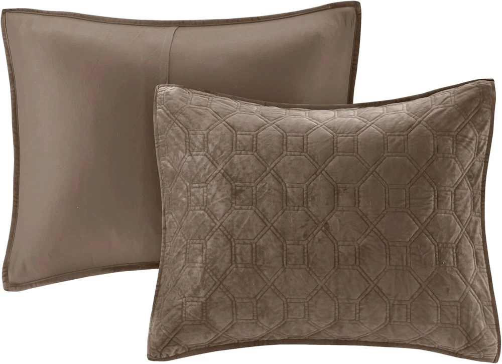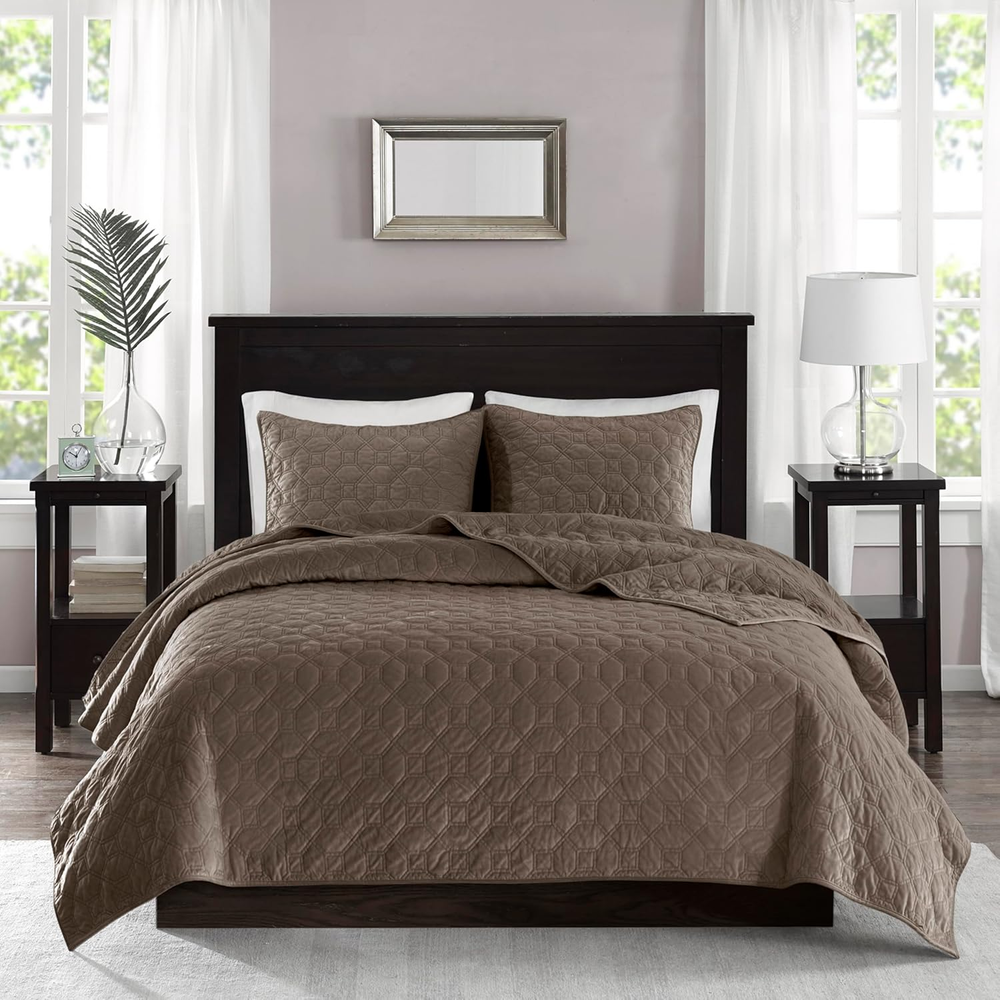 Polyester Elegant and soft velvet coverlet set in geometric quilting technique Great for added layer for extra warmth in cold season Set includes coverlet and 2 matching shams Cotton filling for comfort and durability Embelishment : Embroidered Coverlet/Shams: 100% polyester velvet with quilted face, 85gsm microfiber back, 240gsm 90%cotton, 10%other fiber filling, prewash. 1 Coverlet:104x94" 2 King Shams:20x36+0.5"(2) MACHINE WASH COLD, GENTLE CYCLE, AND SEPARATELY. DO NOT BLEACH. TUMBLE DRY LOW, REMOVE PROMPTLY, DO NOT IRON. IF THERE IS NO FREE MOVEMENT IN THE WASHER OR DRYER, USE LARGE CAPACITY COMMERCIAL WASHER/DRYER. The Madison Park Harper Velvet 3 Piece Coverlet Set offers a casual and comfortable update to your bedroom. The polyester velvet coverlet features a soft texture with a geometric quilted design, for a rich look and feel. Matching shams pair beautifully with the coverlet to complete the quilt set. Providing a charming layering piece to your bed.