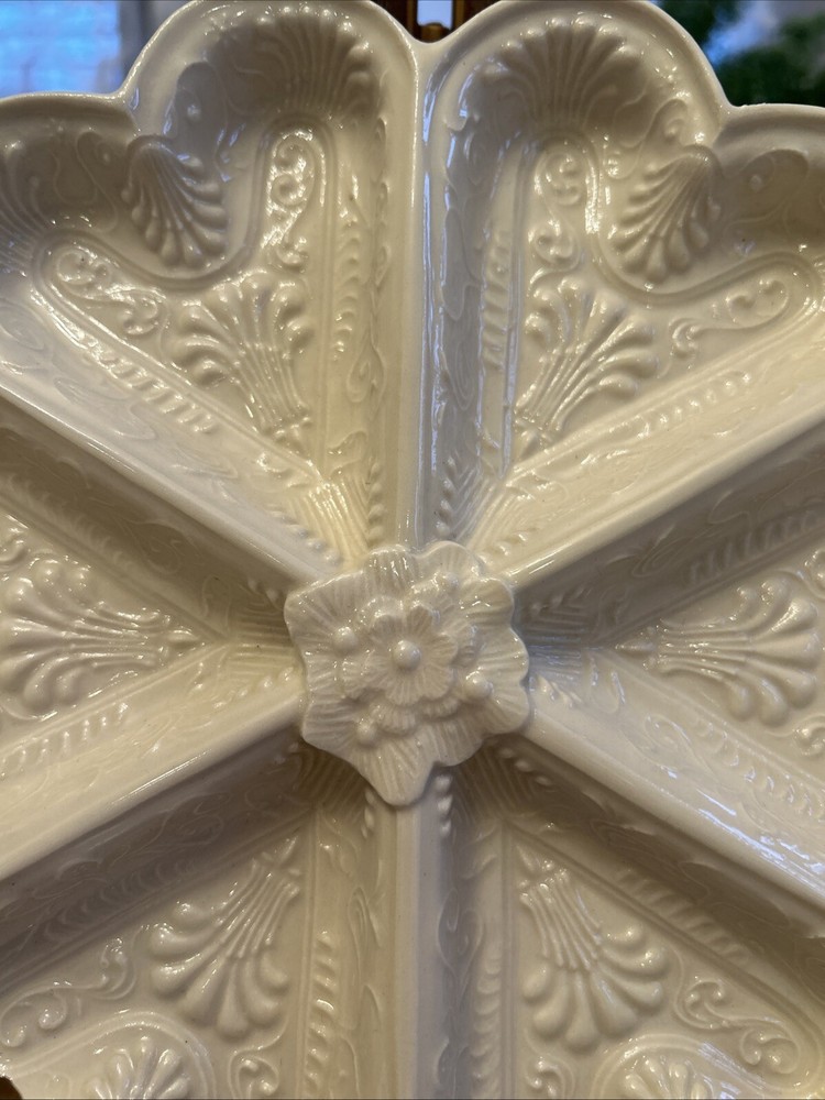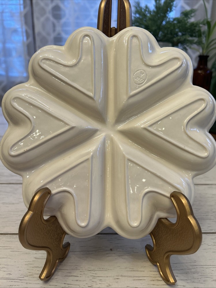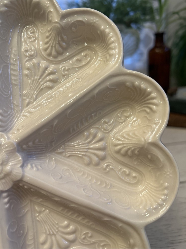 This beautiful Heart Shaped Cookie Dish is perfect for Valentine's Day or any day! The dish has 6 compartments and is made of porcelain with a glossy finish. The round dish measures 8.5 inches in diameter and weighs less than 1 pound. Crafted by WILLIAMSBURG Pottery, this original dish features a lovely heart pattern and is studio crafted in the United States. It's a perfect addition to any kitchen or dining room decor. Use it to serve cookies, candies or even small appetizers. Originally purchased at the Metropolitan Museum of Art. No cracks, chips or other imperfections. Cleaned and shiny, ready to go!