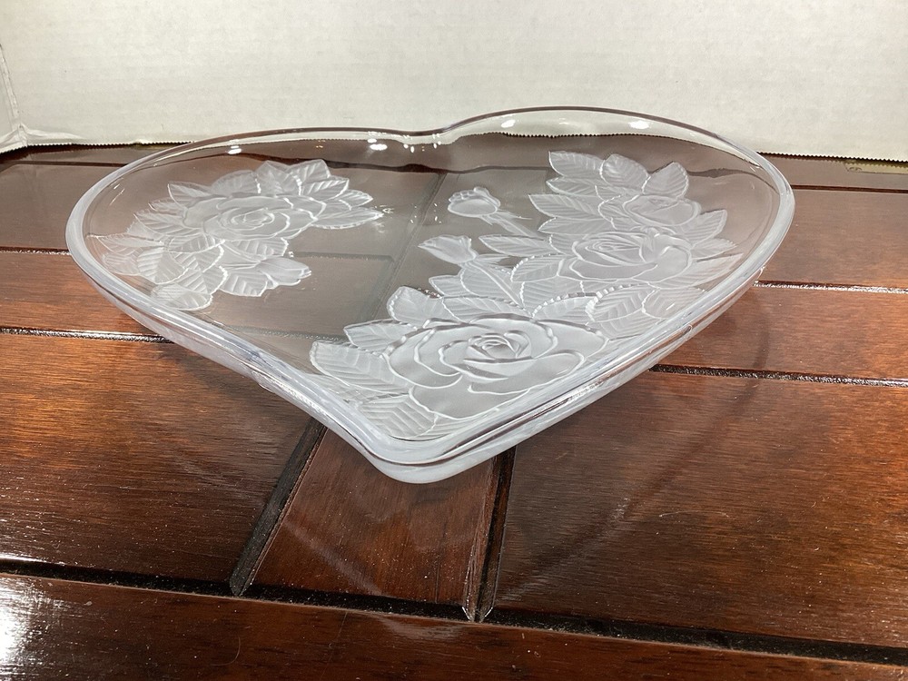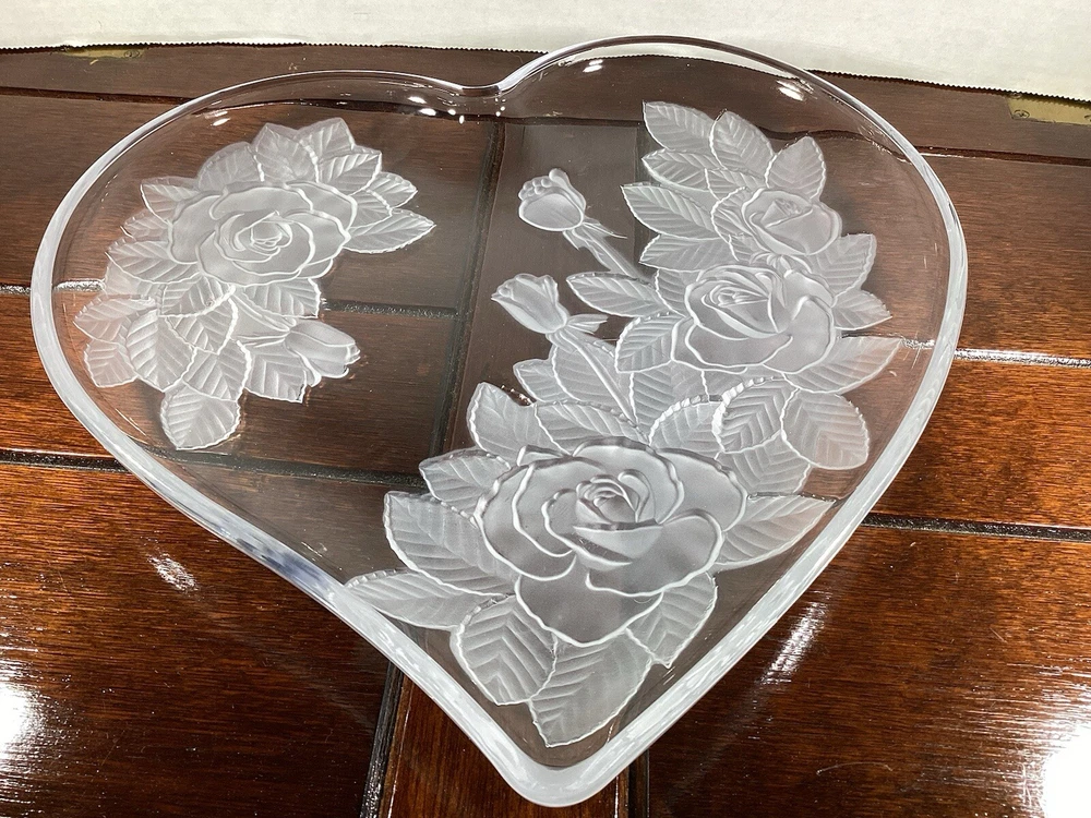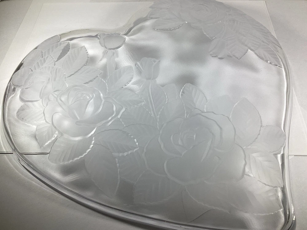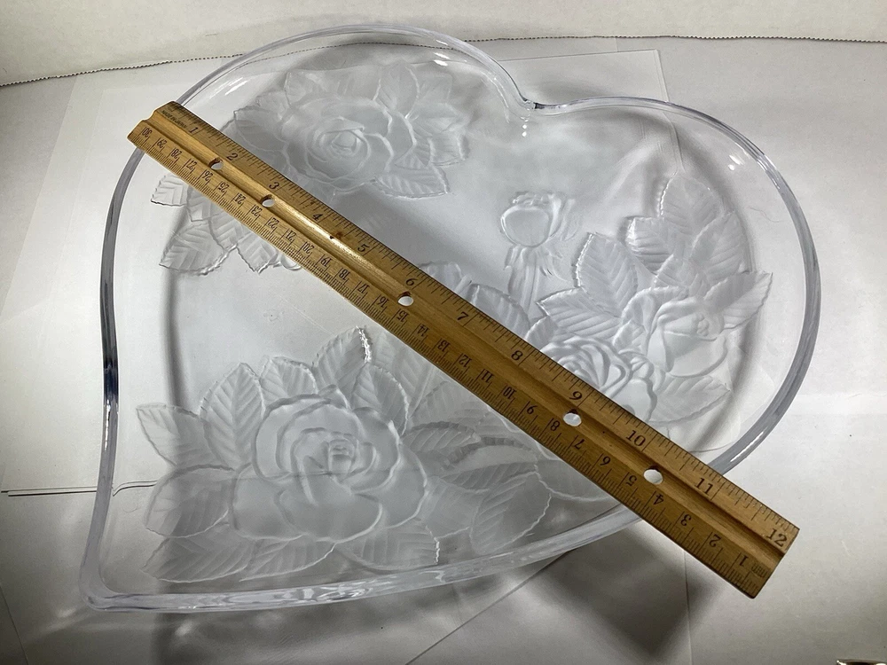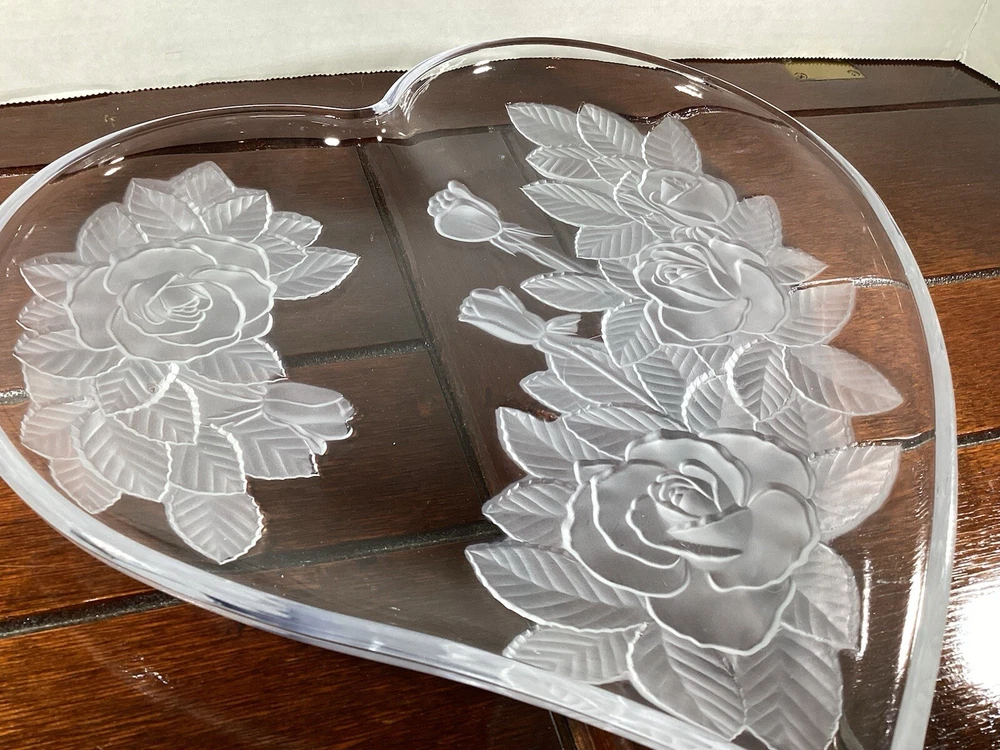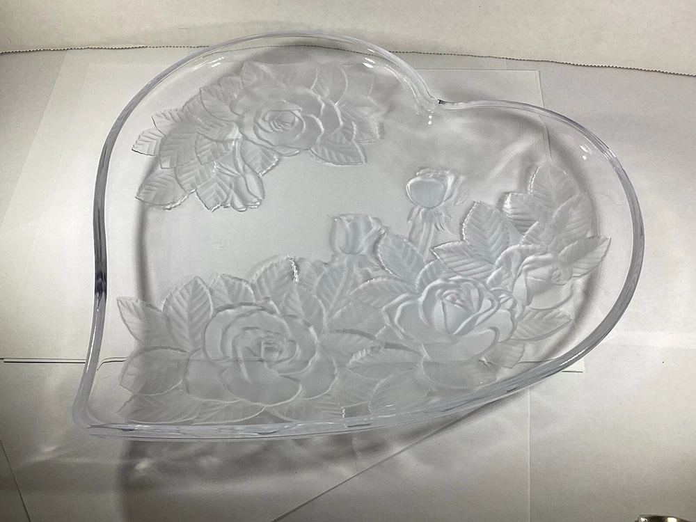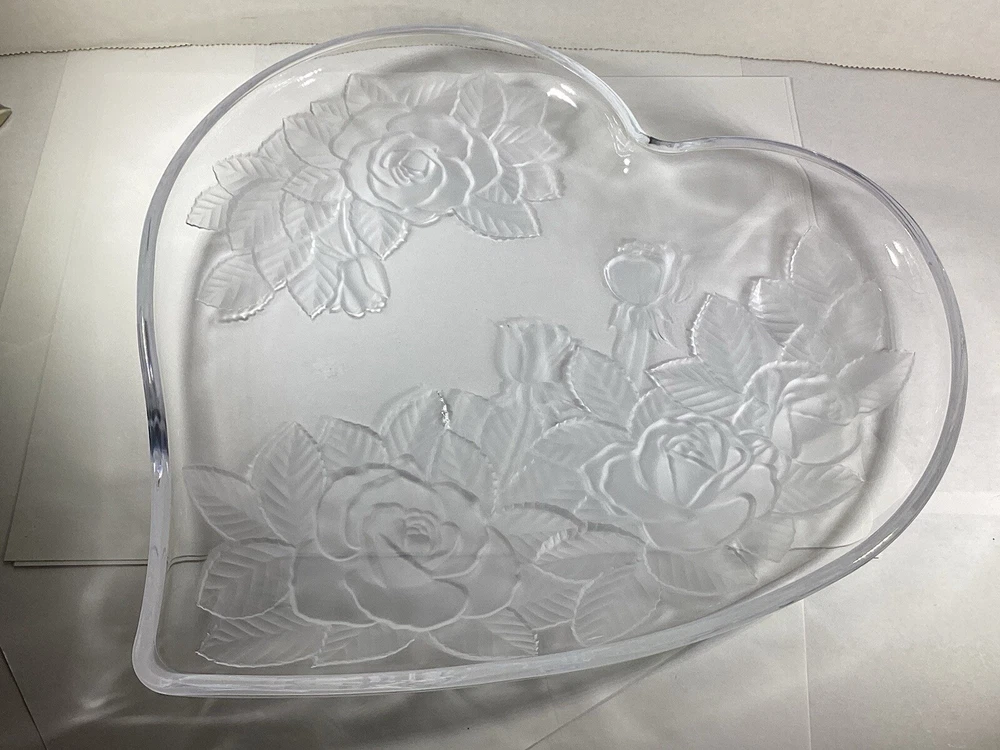 This beautiful tray plate from Studio Nova features a heart-shaped, textured roses design. The clear heavy thick crystal material adds a touch of elegance to any setting, and the tray is perfect for serving or displaying your favorite items. The Winter Rose product line and Love theme make it a unique addition to any collection. Measuring 11 inches in width, this tray plate is a high-quality original production from the 1990s?. The heart pattern and etched production technique make it a one-of-a-kind item that is sure to impress. Whether you're a collector or simply looking for a special piece to add to your home, this tray plate is a great choice. Preowned, great unused condition. See photos for more details and description. Thanks for looking! Check out my Store!