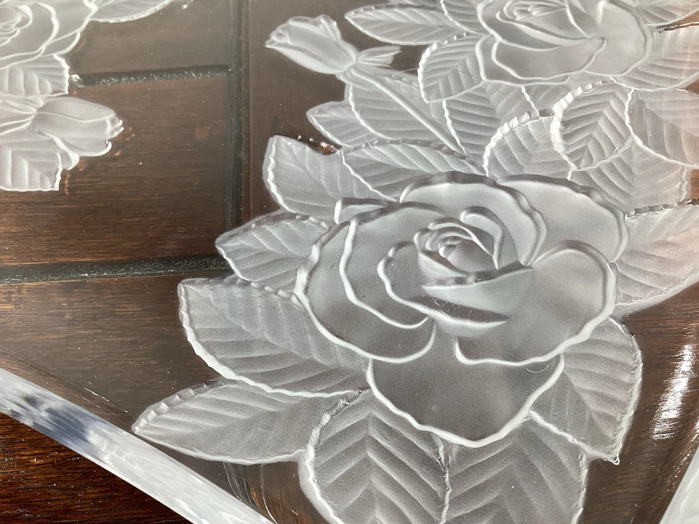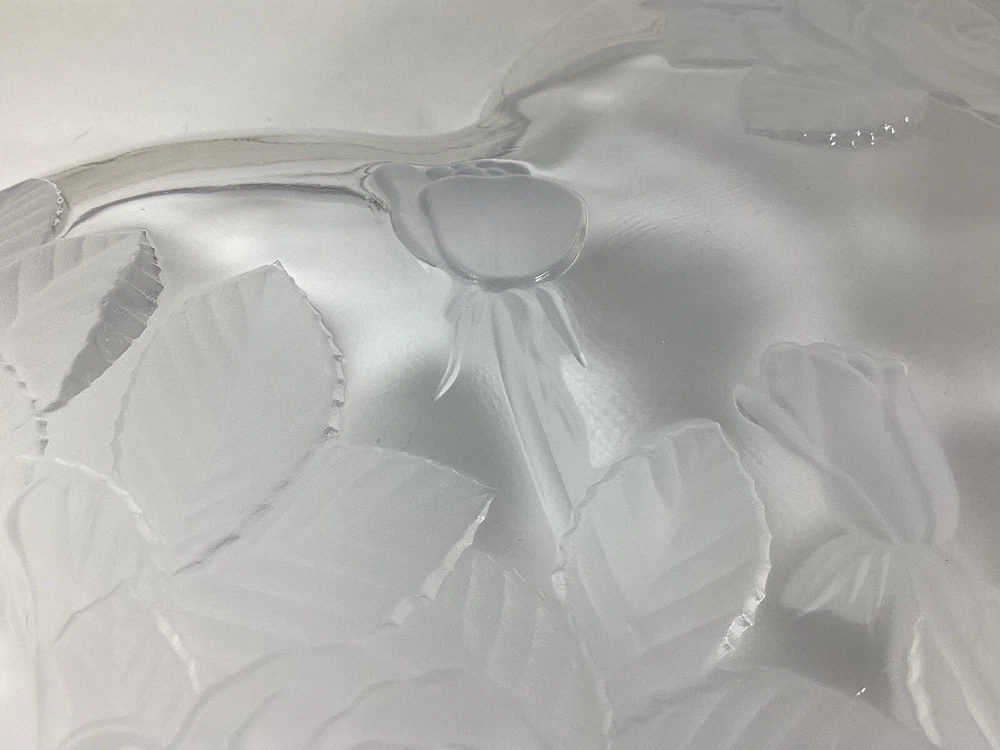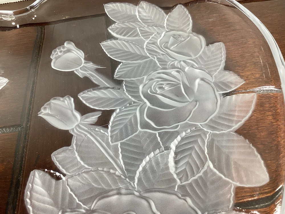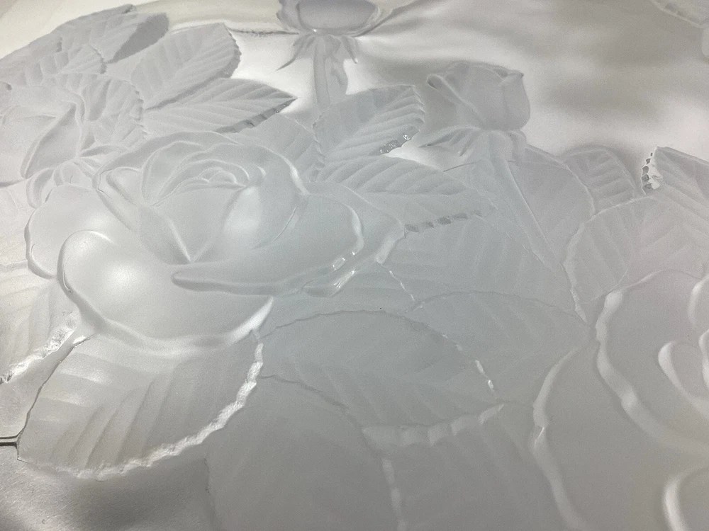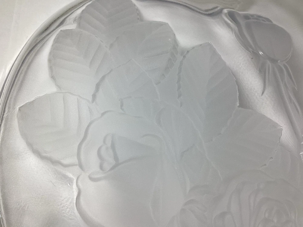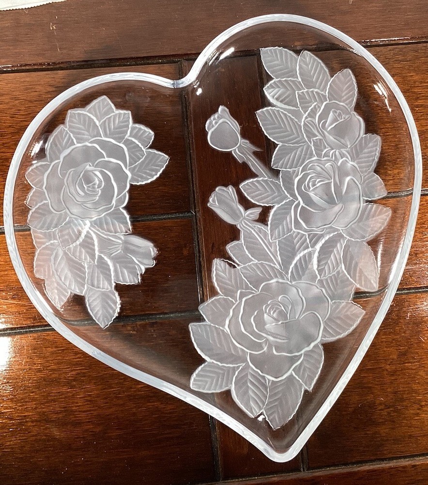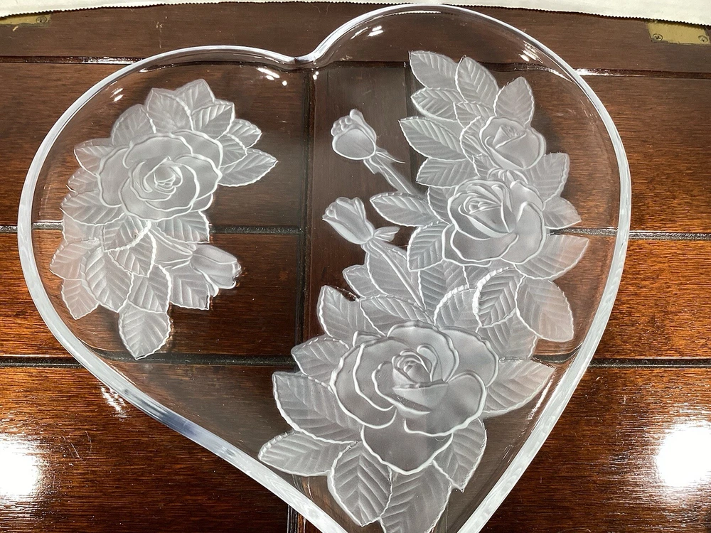 This beautiful tray plate from Studio Nova features a heart-shaped, textured roses design. The clear heavy thick crystal material adds a touch of elegance to any setting, and the tray is perfect for serving or displaying your favorite items. The Winter Rose product line and Love theme make it a unique addition to any collection. Measuring 11 inches in width, this tray plate is a high-quality original production from the 1990s?. The heart pattern and etched production technique make it a one-of-a-kind item that is sure to impress. Whether you're a collector or simply looking for a special piece to add to your home, this tray plate is a great choice. Preowned, great unused condition. See photos for more details and description. Thanks for looking! Check out my Store!