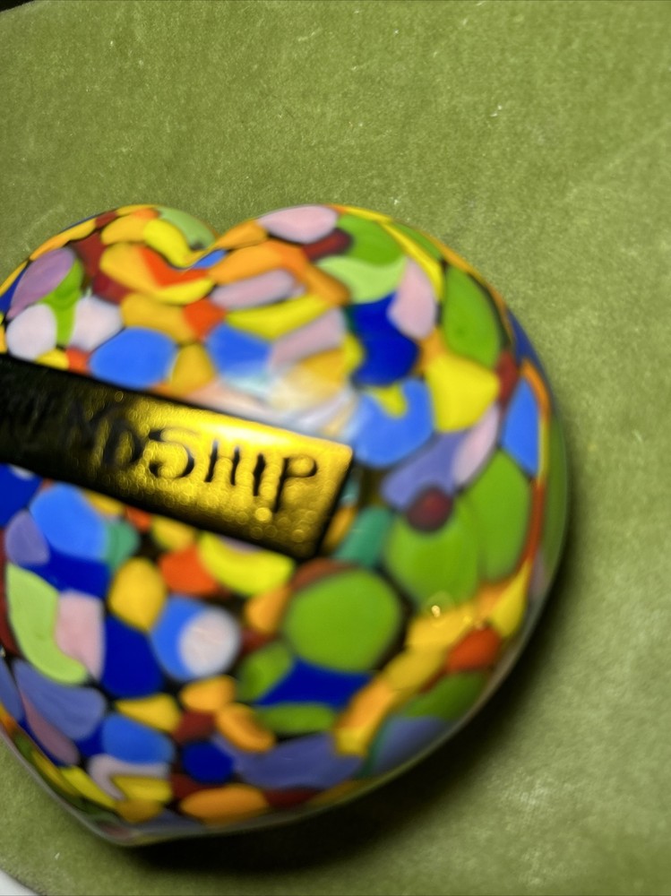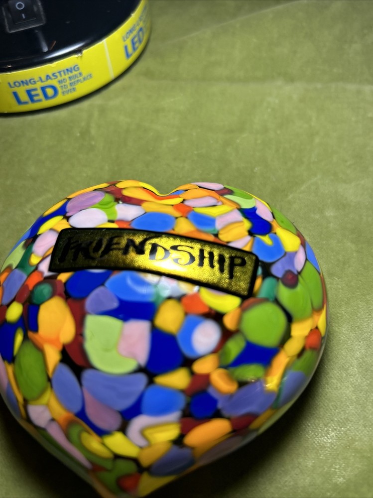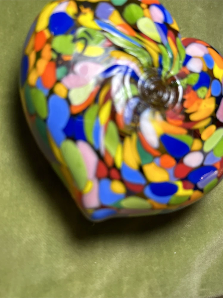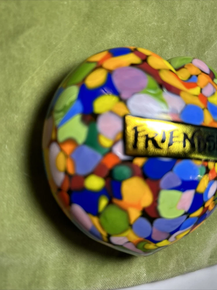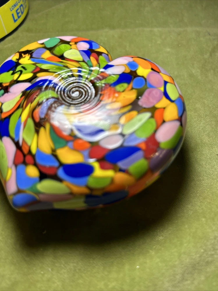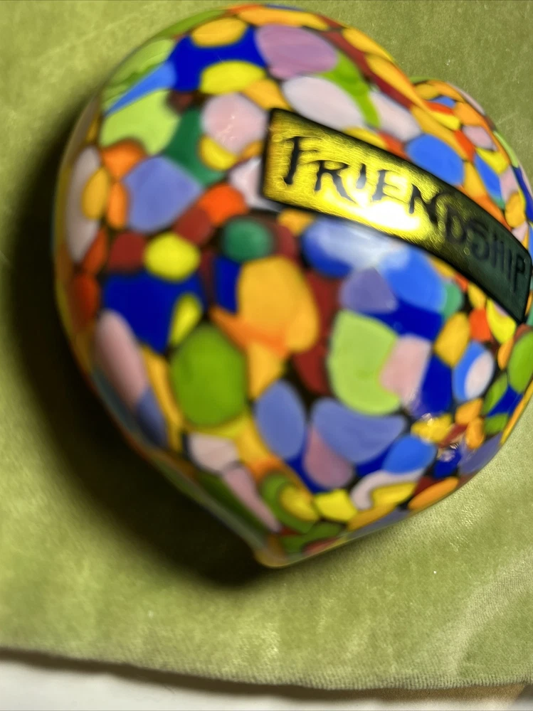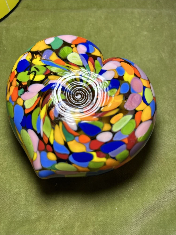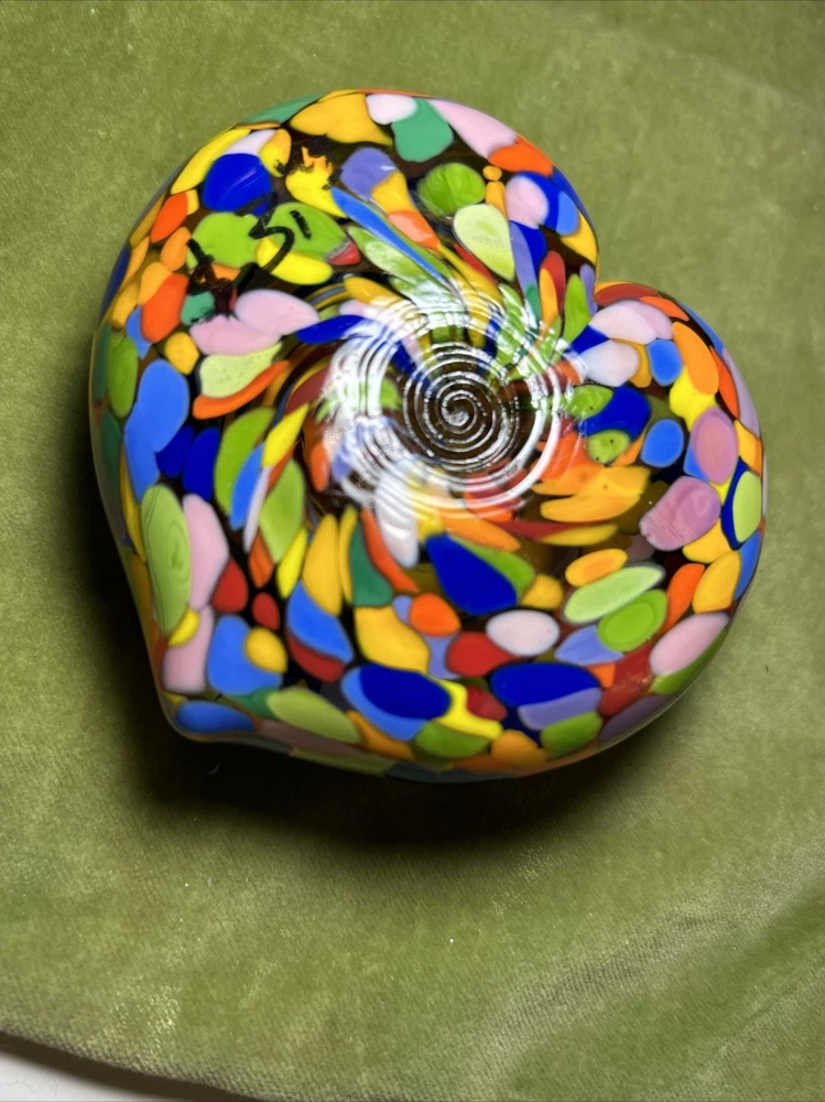 Add a touch of love and color to your workspace with this beautiful paperweight from MAD ART STUDIOS. Handmade in California, this heart-shaped glass paperweight features a stunning Millefiori pattern in a variety of colors. The glossy finish gives it a contemporary look that will complement any desk or bookshelf. Designed by RINA FEHRENSEN & MICHAEL MADDY, this original piece of art glass is perfect for paperweight collectors or as a thoughtful gift for a friend. Its unique shape and pattern make it a great conversation starter. Bring some love into your workspace with this beautiful, one-of-a-kind paperweight. Perfect gift for a FRIENDSHIP FRIEND