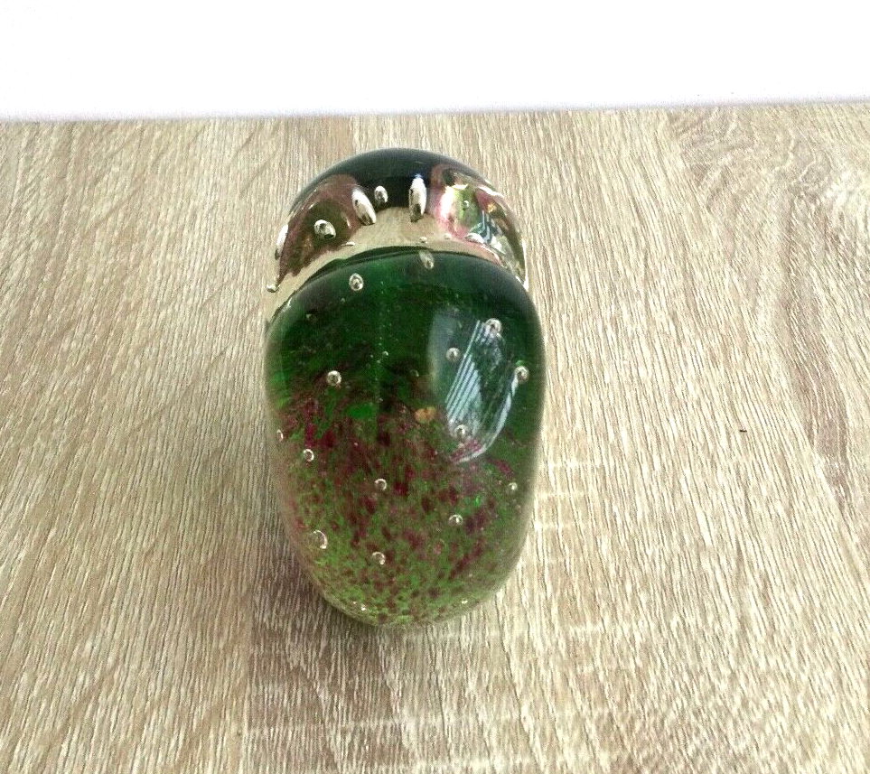 Hello! Please excuse the reflection from my window blinds in some of the pictures. It almost looks as if the glass is scratched, but it is not, it's the glare from the window. This is a stunning and unique art glass paperweight in excellent condition. The colors are pink and green and it is made with at the controlled bubble technique. Handblown and made in Italy. Approx. 3.25" high, 3" wide and 1.75" deep