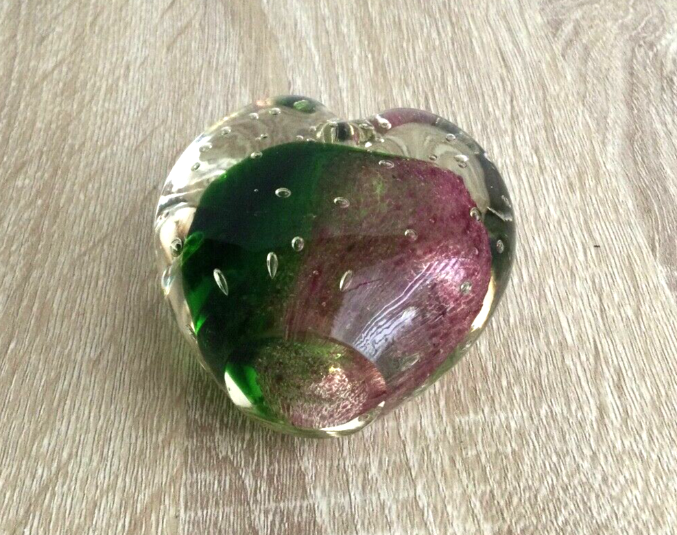 This beautiful heart-shaped paperweight is a true work of art—the swirling pink and green colors combined with the delicate bubble technique make it a standout piece. The craftsmanship is amazing, and you can tell it’s handblown with care. Perfect as a desk accent or a meaningful gift! The size is just right, and the quality feels luxurious. Love the Murano-style touch—definitely worth it!