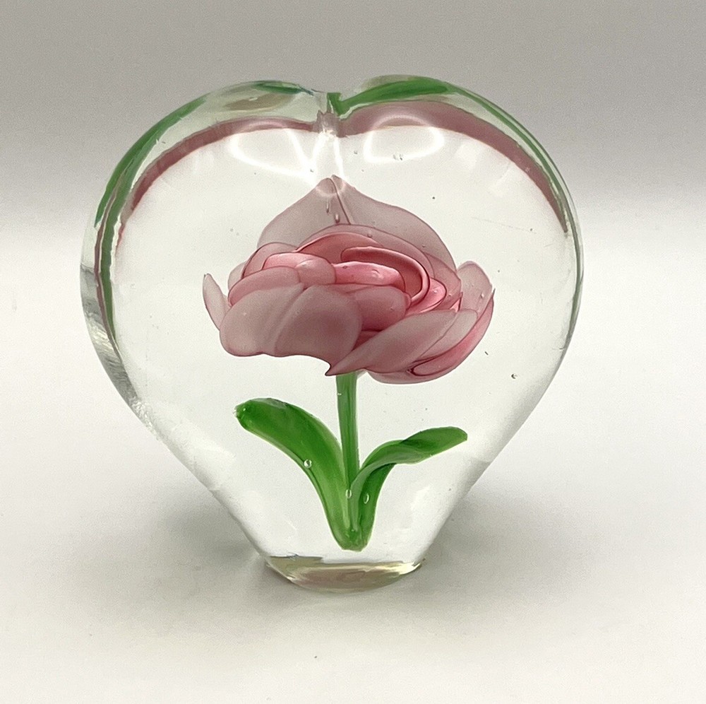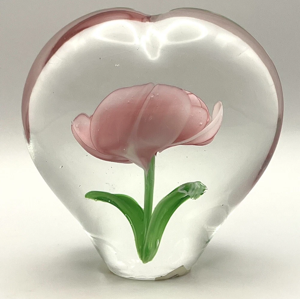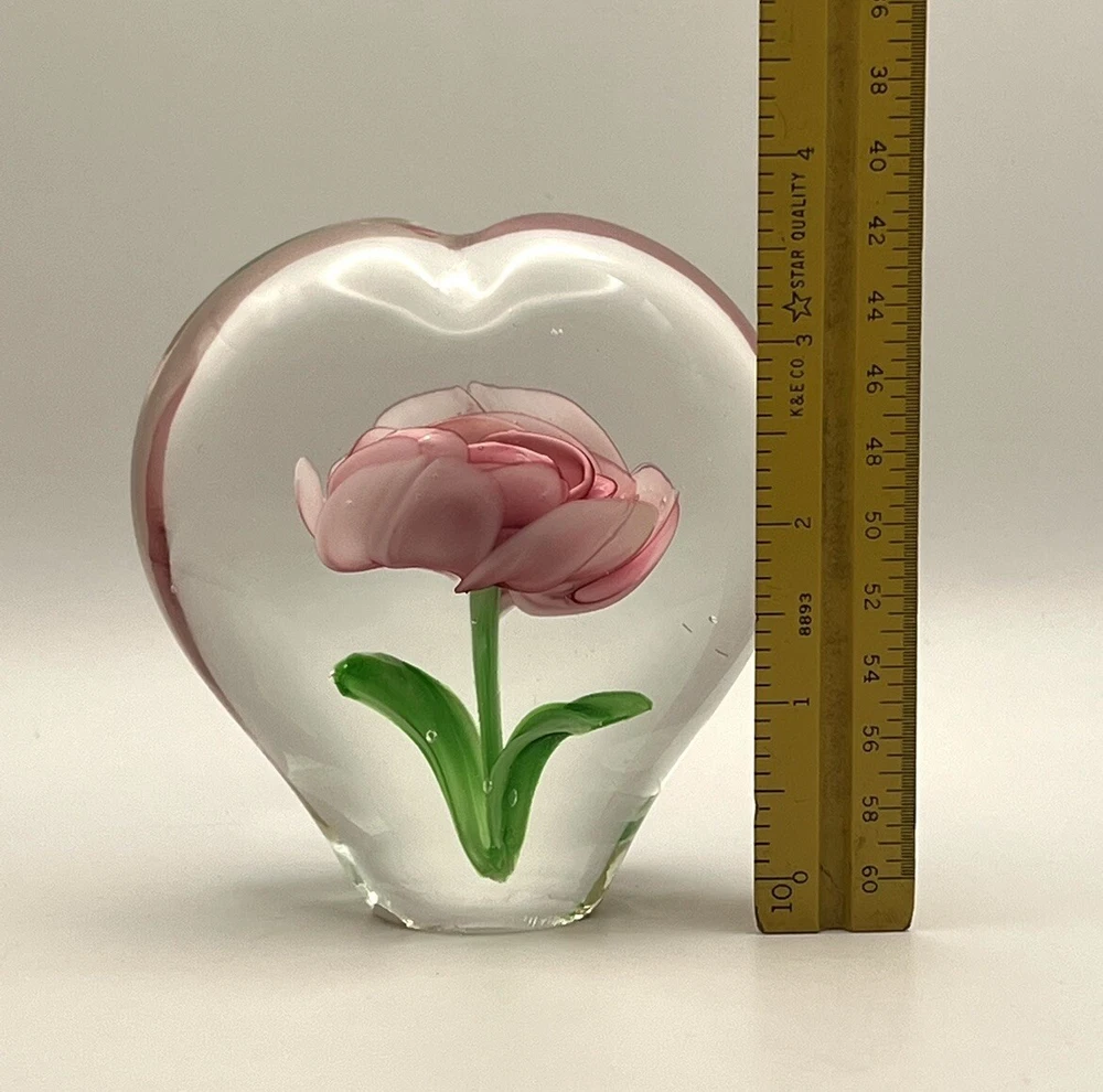 Heart Shaped Studio Art Glass Paperweight Clear Glass Pink Flower Green 4” Tall. Perfect condition with original stickers! Ships quickly! 10% of all sales benefit The Lovelady Center In Birmingham, AL. https://www.loveladycenter.org