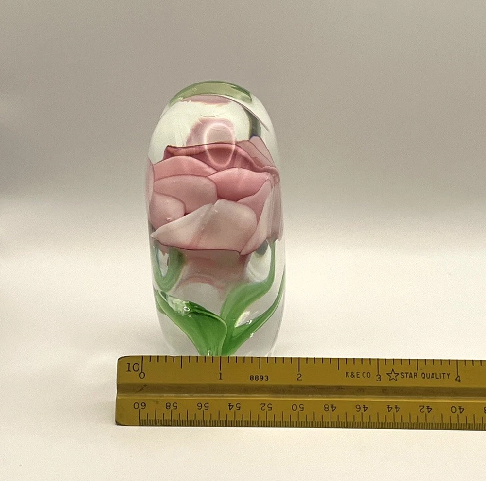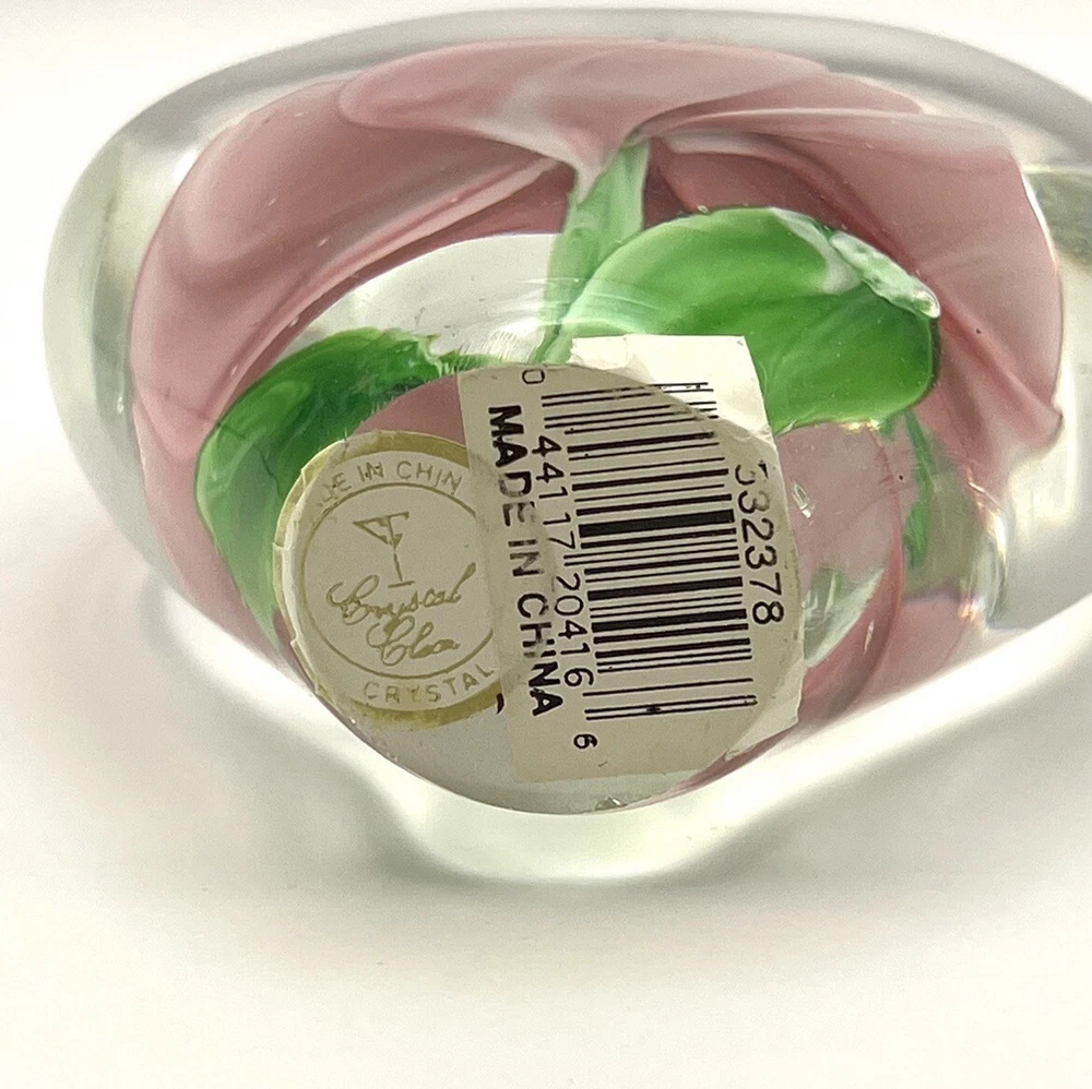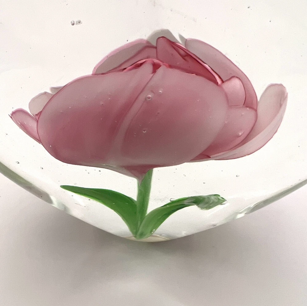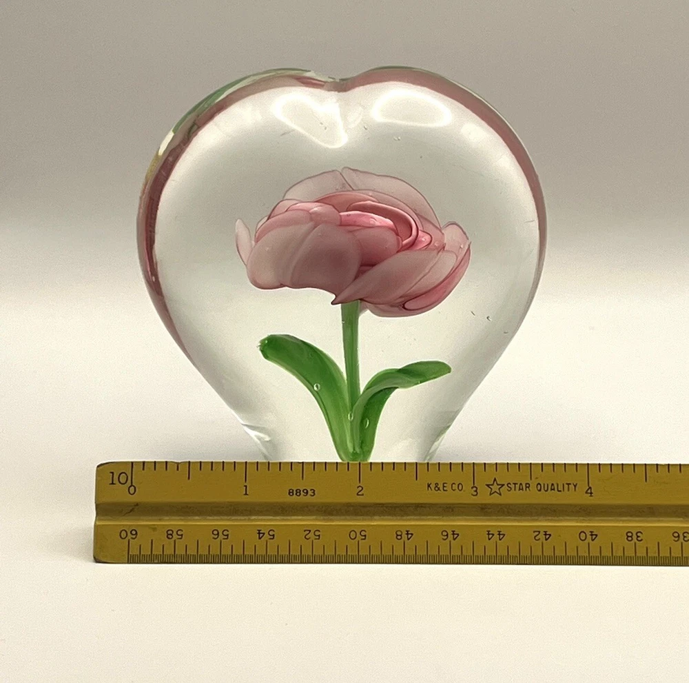 Heart Shaped Studio Art Glass Paperweight Clear Glass Pink Flower Green 4” Tall. Perfect condition with original stickers! Ships quickly! 10% of all sales benefit The Lovelady Center In Birmingham, AL. https://www.loveladycenter.org