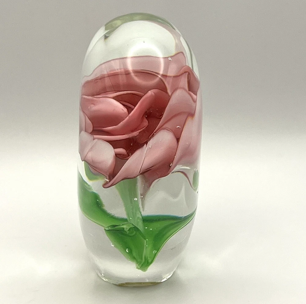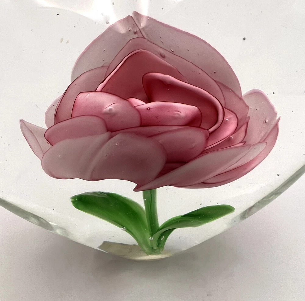 Heart Shaped Studio Art Glass Paperweight Clear Glass Pink Flower Green 4” Tall. Perfect condition with original stickers! Ships quickly! 10% of all sales benefit The Lovelady Center In Birmingham, AL...