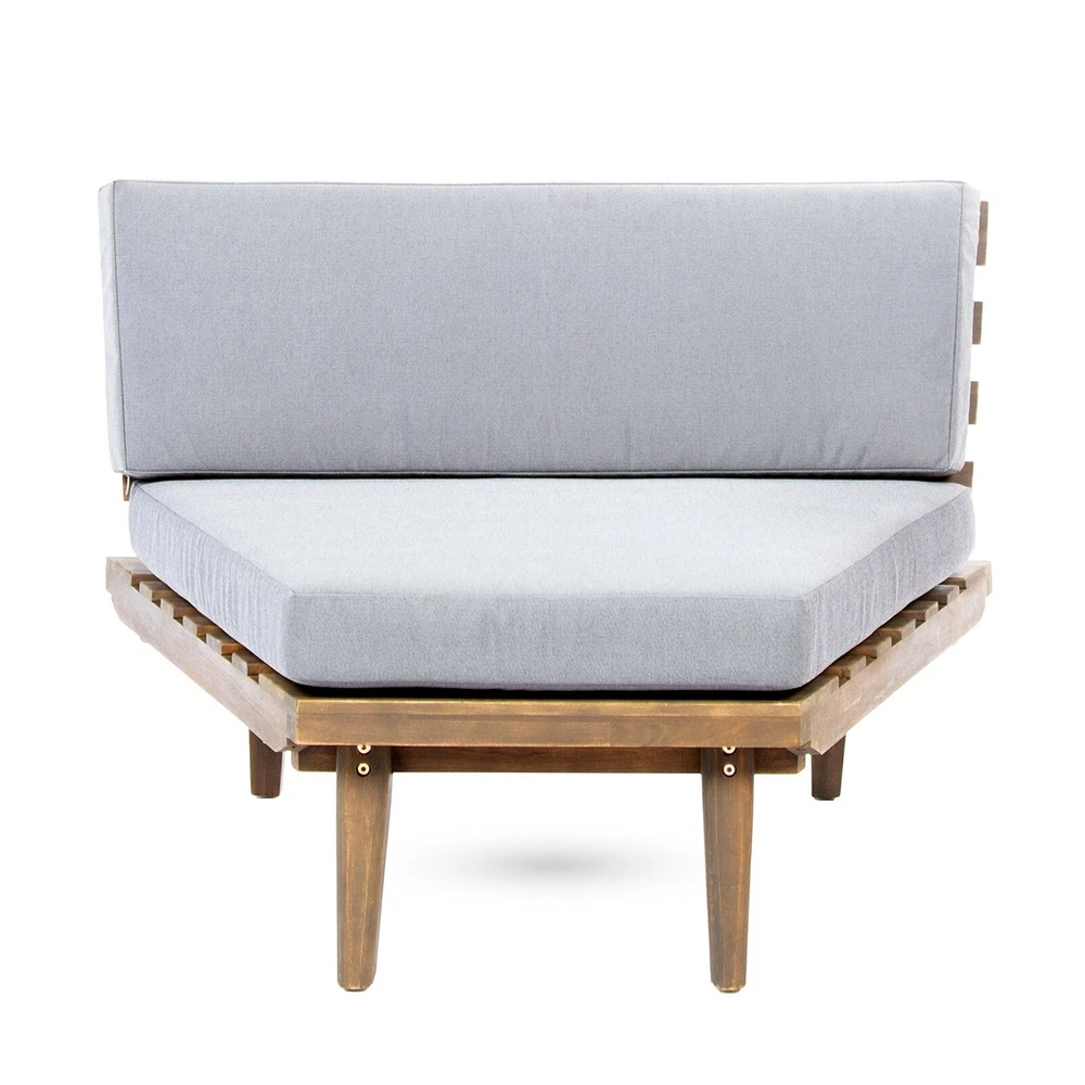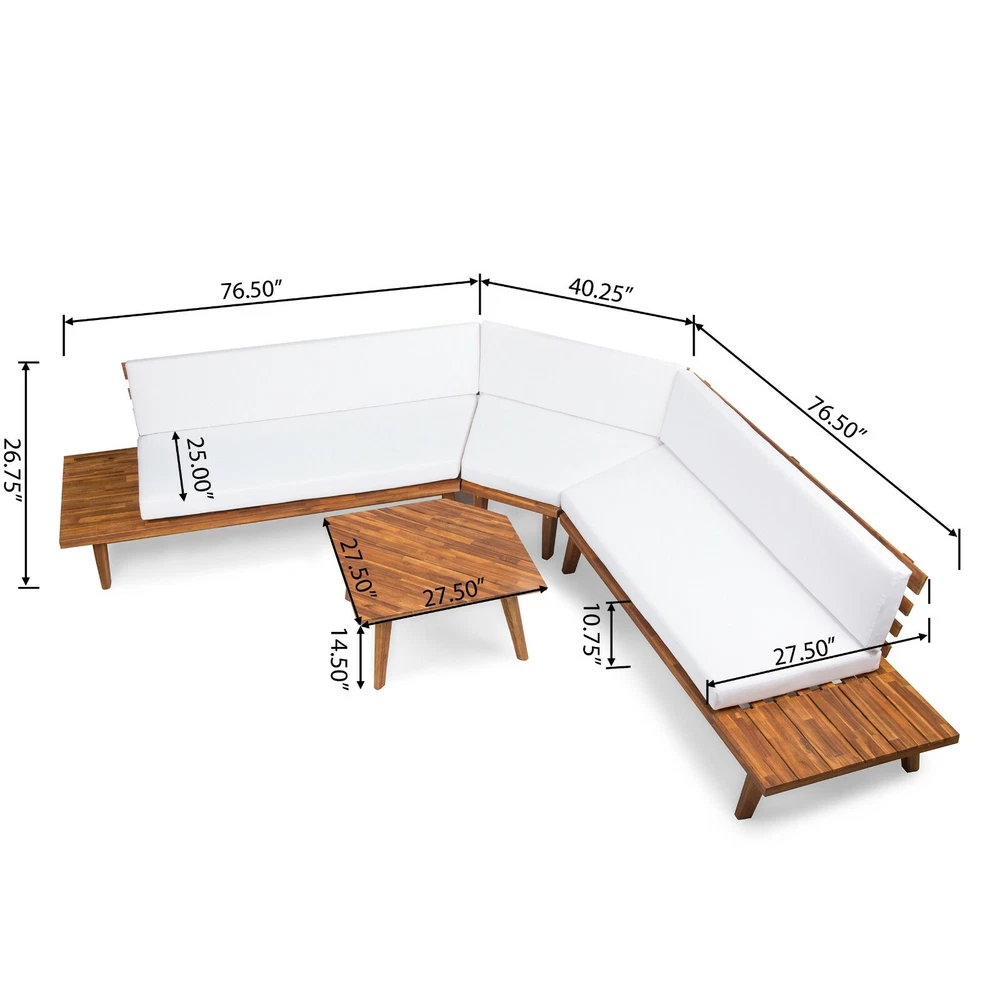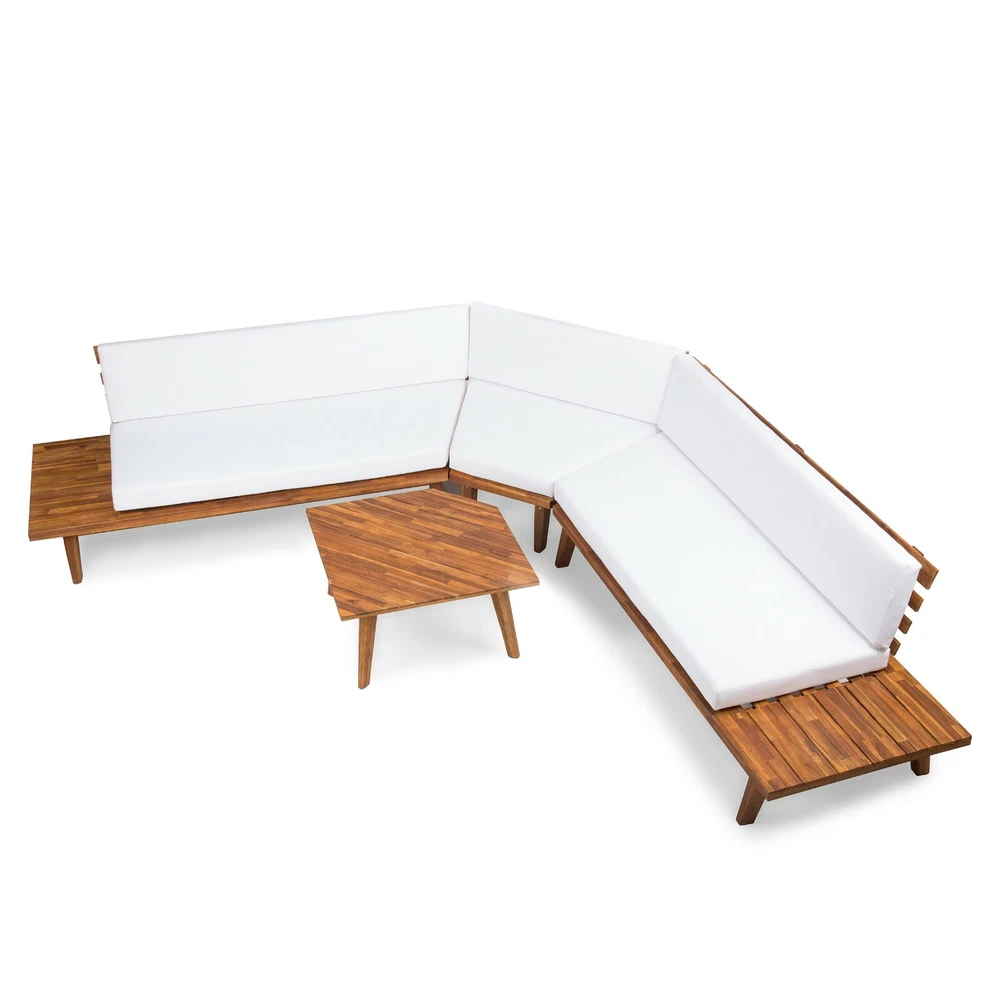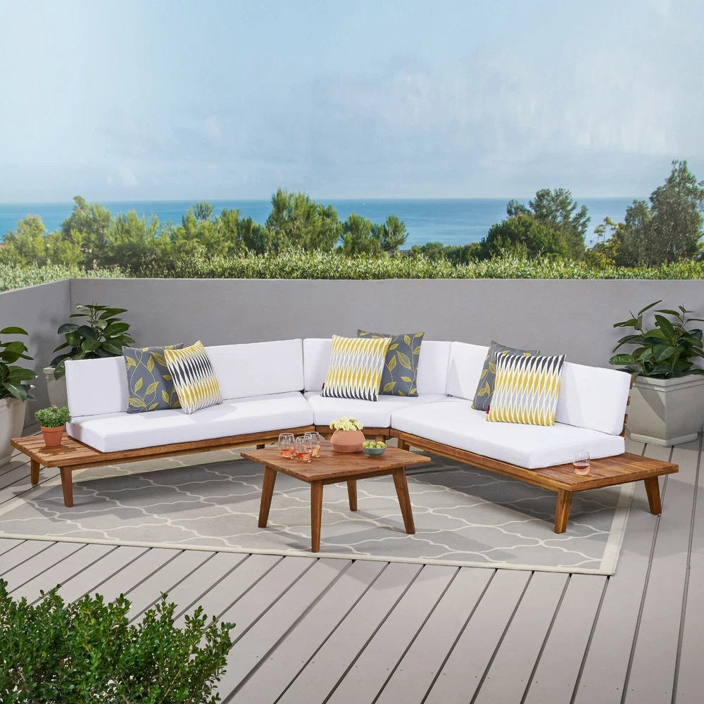 Entertain, lounge, and make the most of every moment in your backyard with our breathtaking outdoor chat set. This unique collection includes one sectional sofa with built-in side tables and a coordinating coffee table. Bursting with retro, mid-century modern beauty and topped with water-resistant cushions, this comfortable set is a showstopper. Durable, warm, and beautiful acacia wood construction lends natural charm to the set, while the side table design is unexpectedly chic. Create a conversational outdoor living space with this incredible collection. ACACIA WOOD: Made with acacia wood that brings a sleek and exotic look to your space, this durable hardwood naturally withstands the elements and will not darken over time. Acacia wood is perfect as a solid, heavy frame that resists wear and tear. BUILT-IN SIDE TABLES: This set features built-in side tables, offering extra space to set down drinks or other items. This gives this piece a unique look that also provides convenient functionality. WEATHER RESISTANT: This sectional set is designed and tested to resist mild weather conditions. We always advise covering, storing, or providing other protection to our furniture in the event of heavy or repeated exposure to the elements, including water and UV rays. DIMENSIONS: Choose an accessory that is the perfect size for you and your furniture. This sectional is 104.75" W x 104.75" D x 26.75" H with a coffee table of 27.50" W x 27.50" D x 14.75" H. You will love how much your space can transform with the simple addition of this charming sectional sofa. ASSEMBLY REQUIRED: Some assembly is required for this set. All of the instructions and tools needed for assembly are included. This set includes one left arm sectional, one right arm sectional, one corner seat, and one coffee table. Includes: One (1) Left Side 2 Seater Sofa, One (1) Right Side 2 Seater Sofa, One (1) Corner Seat and One (1) Coffee Table Material: Acacia Wood Cushion Material: Water Resistant Fabric Multiple Color Options Assembly Required All Dimensions Exclude Cushion Measurements Left and Right Sofa Dimensions: 28.75 inches deep x 75.75 inches wide x 26.75 inches high Seat Dimensions: 25.00 inches deep x 64.25 inches wide x 10.75 inches high Weight Capacity: 600lbs Corner Seat Dimensions: 28.75 inches deep x 40.00 inches wide x 26.75 inches high Seat Dimensions: 25.00 inches deep x 38.00 inches wide x 10.75 inches high Weight Capacity: 400 lbs Seat Cushion Thickness: 4.50 inches Table Dimensions: 27.50 inches deep x 27.50 inches wide x 14.75 inches high Weight Capacity: 210 lbs