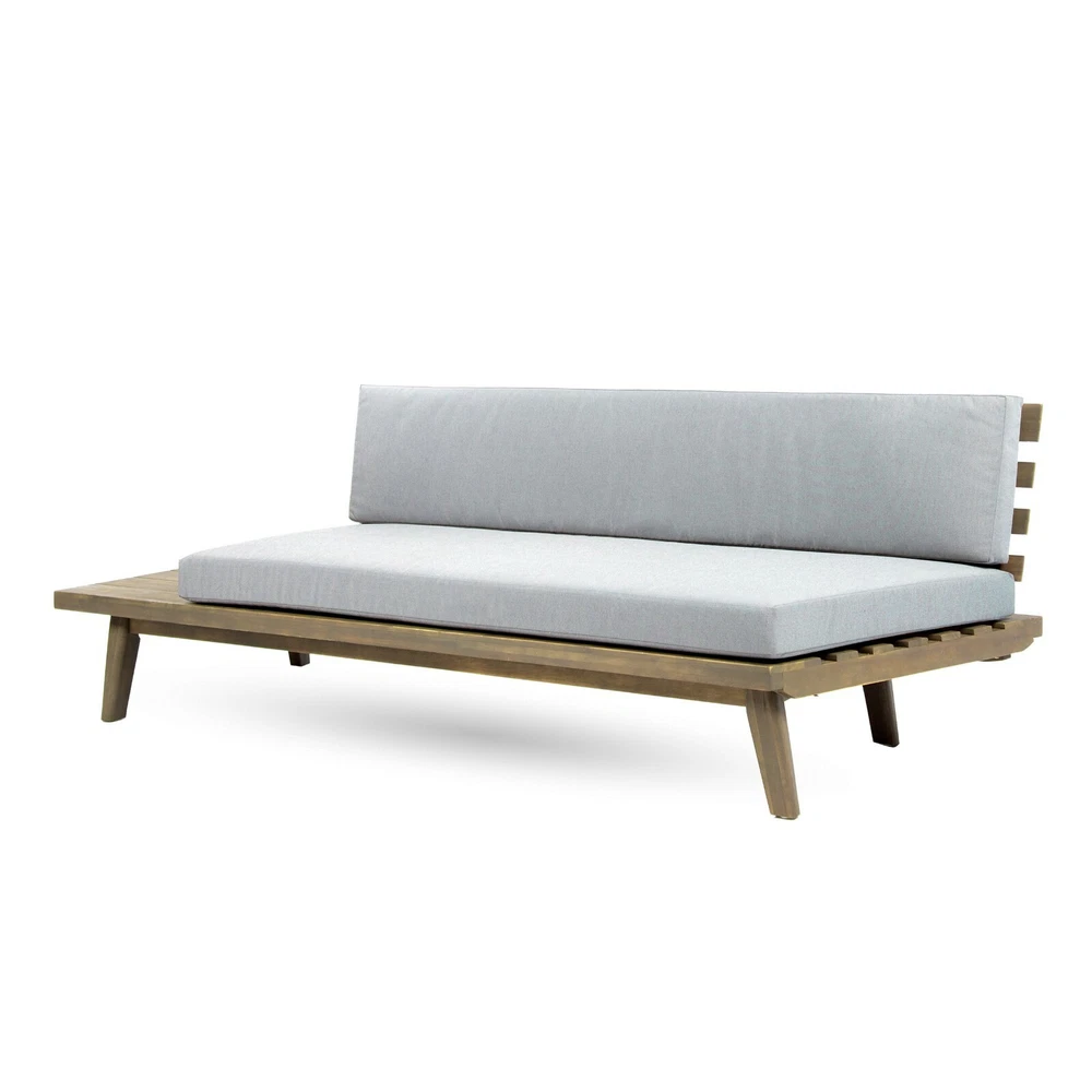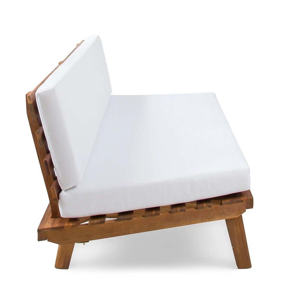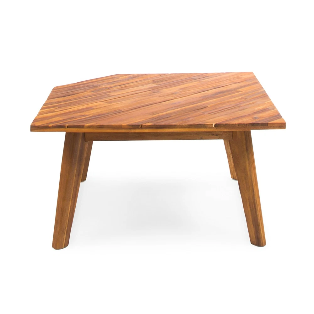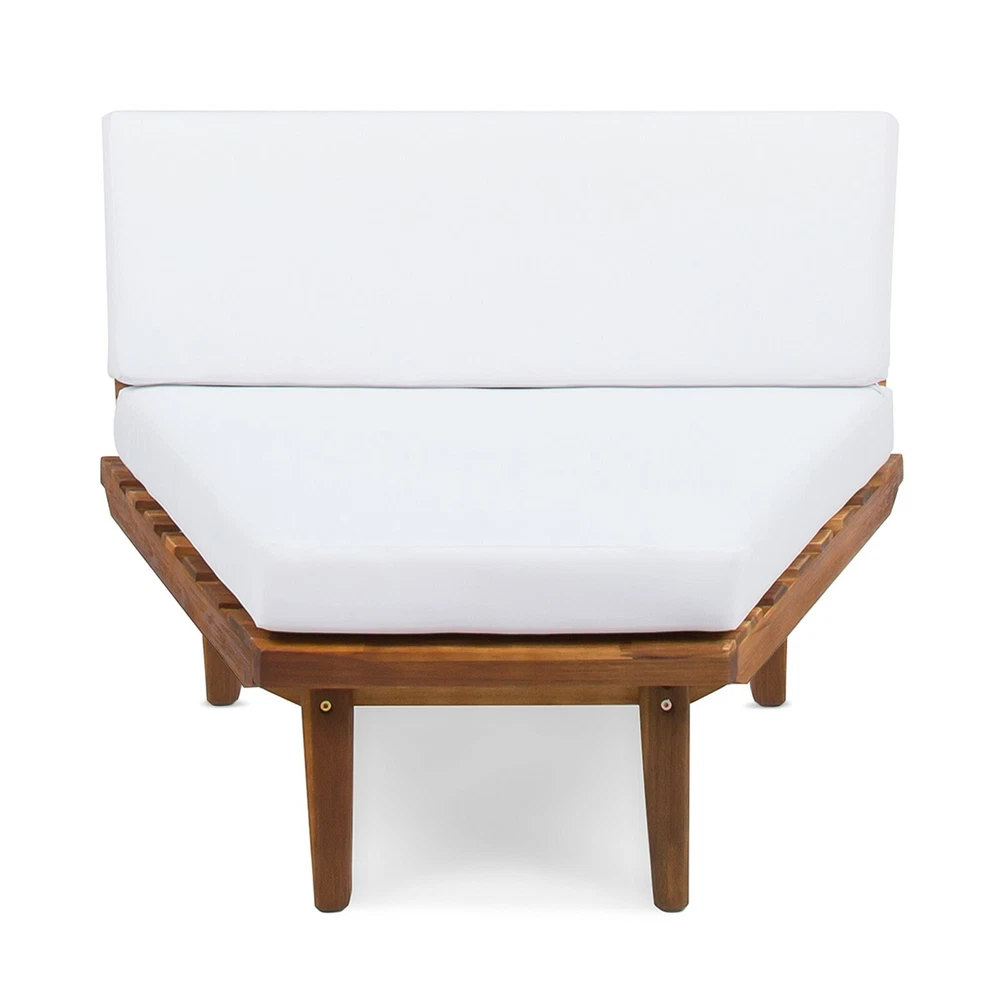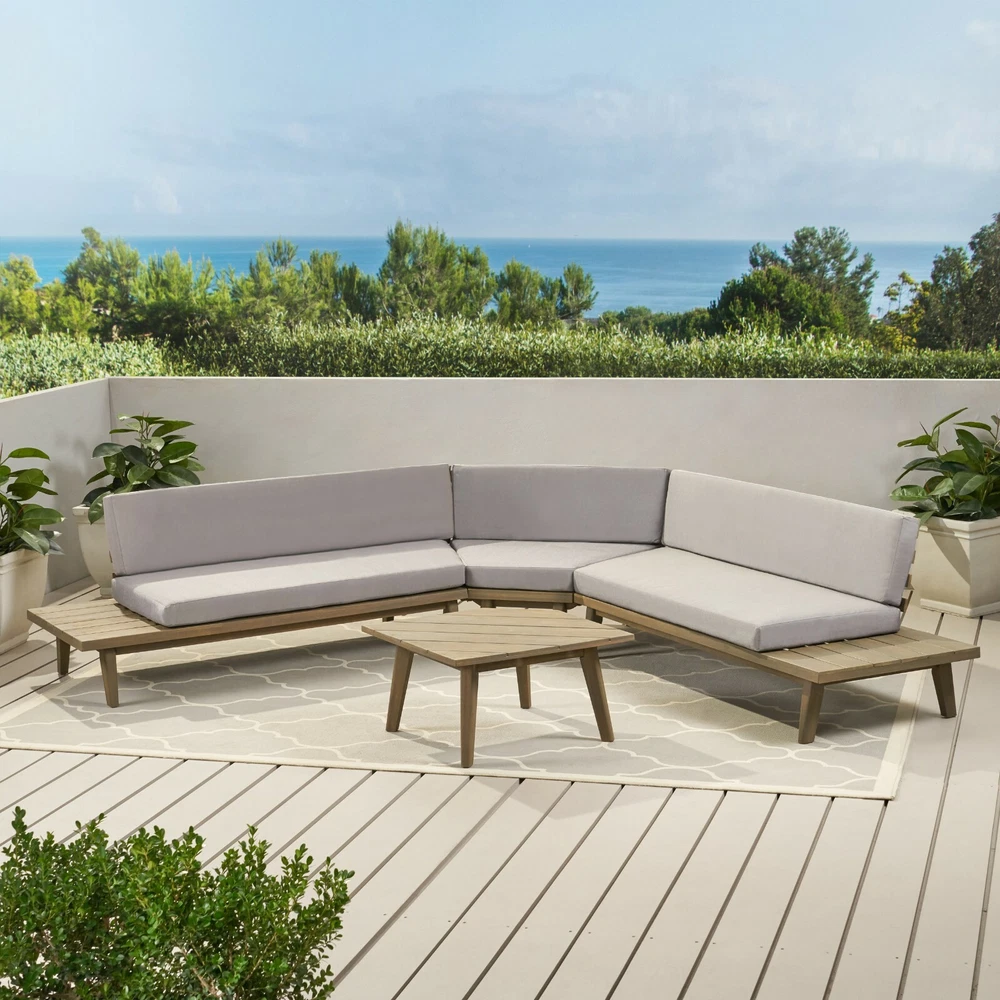 Entertain, lounge, and make the most of every moment in your backyard with our breathtaking outdoor chat set. This unique collection includes one sectional sofa with built-in side tables and a coordinating coffee table. Bursting with retro, mid-century modern beauty and topped with water-resistant cushions, this comfortable set is a showstopper. Durable, warm, and beautiful acacia wood construction lends natural charm to the set, while the side table design is unexpectedly chic. Create a conversational outdoor living space with this incredible collection. ACACIA WOOD: Made with acacia wood that brings a sleek and exotic look to your space, this durable hardwood naturally withstands the elements and will not darken over time. Acacia wood is perfect as a solid, heavy frame that resists wear and tear. BUILT-IN SIDE TABLES: This set features built-in side tables, offering extra space to set down drinks or other items. This gives this piece a unique look that also provides convenient functionality. WEATHER RESISTANT: This sectional set is designed and tested to resist mild weather conditions. We always advise covering, storing, or providing other protection to our furniture in the event of heavy or repeated exposure to the elements, including water and UV rays. DIMENSIONS: Choose an accessory that is the perfect size for you and your furniture. This sectional is 104.75" W x 104.75" D x 26.75" H with a coffee table of 27.50" W x 27.50" D x 14.75" H. You will love how much your space can transform with the simple addition of this charming sectional sofa. ASSEMBLY REQUIRED: Some assembly is required for this set. All of the instructions and tools needed for assembly are included. This set includes one left arm sectional, one right arm sectional, one corner seat, and one coffee table. Includes: One (1) Left Side 2 Seater Sofa, One (1) Right Side 2 Seater Sofa, One (1) Corner Seat and One (1) Coffee Table Material: Acacia Wood Cushion Material: Water Resistant Fabric Multiple Color Options Assembly Required All Dimensions Exclude Cushion Measurements Left and Right Sofa Dimensions: 28.75 inches deep x 75.75 inches wide x 26.75 inches high Seat Dimensions: 25.00 inches deep x 64.25 inches wide x 10.75 inches high Weight Capacity: 600lbs Corner Seat Dimensions: 28.75 inches deep x 40.00 inches wide x 26.75 inches high Seat Dimensions: 25.00 inches deep x 38.00 inches wide x 10.75 inches high Weight Capacity: 400 lbs Seat Cushion Thickness: 4.50 inches Table Dimensions: 27.50 inches deep x 27.50 inches wide x 14.75 inches high Weight Capacity: 210 lbs