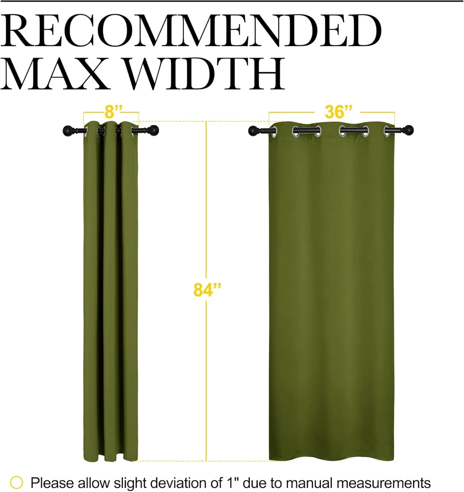 Menu Other Items Feedbacks About Us Contact Us Add To Favorites Holiday Christmas Decor Thermal Insulated Solid Grommet Blackout Curtains/Drape for Living Room (1 Pair, 42 by 84 Inches, Olive Green) Polyester READY MADE: Set includes 2 BLACKOUT PANELS of 42" wide x 84" length with 6 grommets top each. Quality fabric without liner feels soft and heavy. SERVE WELL: Curtains impede 85%-99% light and UV rays(Dark color curtains work well). Noise-reducing, better TV viewing thanks to the innovative triple weave technology. ENERGY SMART: Triple weave blackout fabric balances room temperature by insulating against summer heat and winter chill. Protect your furniture, floors, and artwork from the ravages of the sun, the drapes will pay for themselves off over time. GOOD TO GO: Thread trimmed and wrinkle-free, ring (1.6-inch inner diameter) fits easily with standard curtain rods. All sets for you to put them up right away. EASY TO MAINTAIN: NICETOWN blackout curtains are made to last. Machine washable in cold water, tumble dry. Quick ironing or steam clean when needed. Visiting the NICETOWN store, find out your favorite curtains. Product Description HEAVY-DUTY SILVER RING Suitable for most curtain rods, and easily for hanging and sliding. HIGH DENSITY SUTURE The curtain fabric looks more exquisite and worthwhile. SAME FABRIC FRONT AND BACK The same fabric for both sides makes the curtain a simple style. TRIPLE WEAVE TECHNOLOGY Provide you with a perfect shading performance of about 50%-99% Blackout. DO WELL IN THERMAL INSULATED After insulating with the curtain, the temperature drops a lot. 1 SILVER GROMMET 2 HIGH DENSITY SUTURE 3 FRONT AND BACK 4 TRIPLE WEAVE FABRIC 5 THERMAL INSULATED TYPES OF CURTAIN TOP FOR NICETOWN BLACKOUT CURTAIN GROMMET TOP Make curtain orderly, easy to install and slide, so that let the room elegant. Recommended with no greater than a 1.6-inch rod for maximum movement. ROD POCKET Make some small pleats that give a feeling of cozy and classic. Recommended with no greater than a 1.7-inch rod for maximum movement. BACK TAB Give 3 options to hang curtains which is a perfect choice for window decoration. Recommended with no greater than a 1.7-inch rod for maximum movement. TOP TAB Creates casual elegance for your house, which makes the curtains easy to install and slide. Recommended with no greater than a 1.9-inch rod for maximum movement. TWIST TAB Not only creates rich, deep folds for a professional look, but also makes this panel easy to hang, open and close. Recommended with no greater than a 1.9-inch rod for maximum movement. PINCH PLEATED More gathered than other headings and have permanent sewn-in pleats for a more luxurious. Recommended with no greater than a 1.9-inch rod for maximum movement. CLASSIC AND POPULAR COLOR RECOMMENDATIONS COLOR SHADING DISPLAY THE COLOR OF THE ACTUAL ITEM MAY VARY SLIGHTLY IN DIFFERENT ENVIRONMENT The video showcases the product in use. The video guides you through product setup. The video compares multiple products. The video shows the product being unpacked. The video showcases the product in use. The video guides you through product setup. The video compares multiple products. The video shows the product being unpacked. Item Specification Style Contemporary Number of Items 2 Pattern Solid Material Type Polyester, Polyester Blend Theme Art Opacity Blackout Inches Unit Count 1.0 Count Room Type Kitchen, Bedroom, Living Room, Home Office, Dining Room Product Dimensions 84"L x 42"W Material Polyester, Polyester Blend Top Style Grommet Model Name NTGMBLKSLD2-42ALL3 Curtain Hanging Method Grommet Seasons Summer Fits Rod Size 1.6 Inches Item Package Weight 1.27 Kilograms Specific Uses For Product Living Room, Bedroom, Home Theater Curtain Form Drapes Occasion Type Christmas Item Weight 1100 Grams Special Features Thermal Insulated, Soundproof, Wrinkle Free, Blackout Item Dimensions L x W 84"L x 42"W Color Olive Recommended Uses For Product daytime sleep, home theaters, energy efficiency, light-sensitive individuals, noise reduction, temperature balance Included Components Grommets, Curtain Rod Fabric Type Polyester Product Care Instructions Machine Wash in Cold Water, Tumble Dry Size 42"W x 84"L (Pack of 2) Dimensions Shipping Returns Additional Info Product Dimensions: 42.0 "w x 84.0 "w. Weight: 1100.0 grams Fast shipping is very important for us. Our standard shipping service is FREE. Your order will be shipped within 1-3 business days upon full payment received. Most items are delivered within 3-5 business days, however, please allow 3-10 business days. We are shipping only to USA. We only ship to the confirmed Paypal address. We reserve the right to cancel any order for any reason at any time. We are not responsible for undeliverable addresses. We offer a 30 day return policy from checkout winning date. Your satisfaction is guaranteed! If for any reason you are unhappy with your item, just return it within 30 days for a full refund, minus shipping cost. Please contact us prior to initiating a return so that we can issue you a refund authorization. Items defective upon receipt must be packaged in their retail packaging as if new and returned with a detailed description of the problem. Return shipping fees are not refundable. We reserve the right to decline any returns if the above guidelines are not followed. All of our items, unless otherwise stated, will only run on 120 volts. Please check to make sure your country complies with these specifications. If you have a problem or question regarding your transaction please contact us before leaving any type of feedback. We will work with you to resolve any problem you may have.