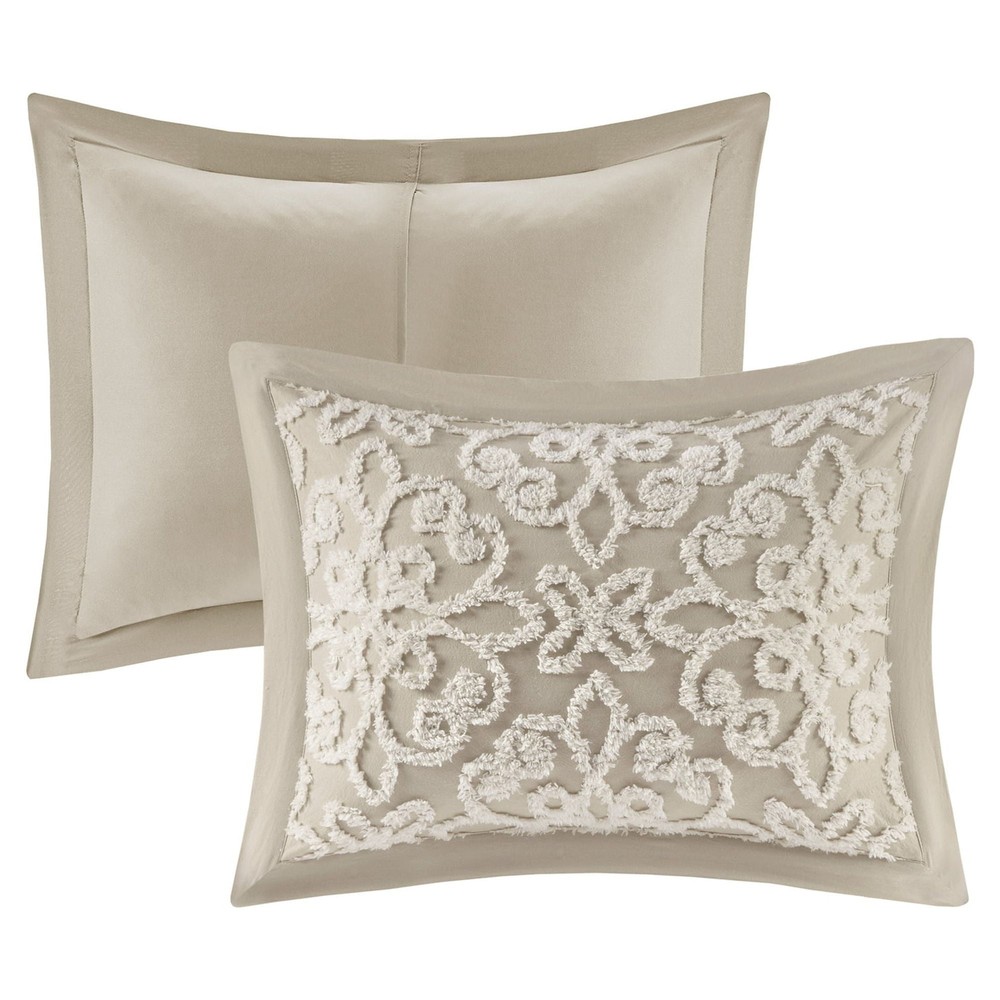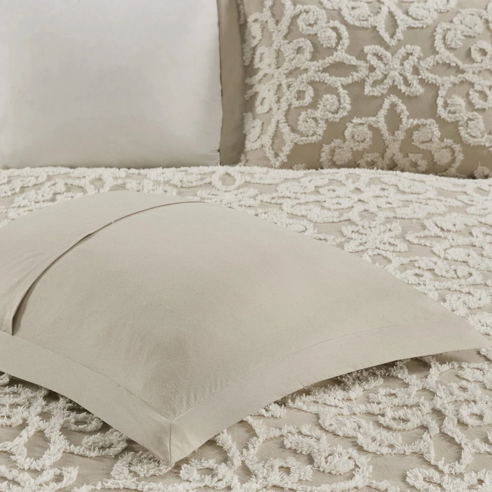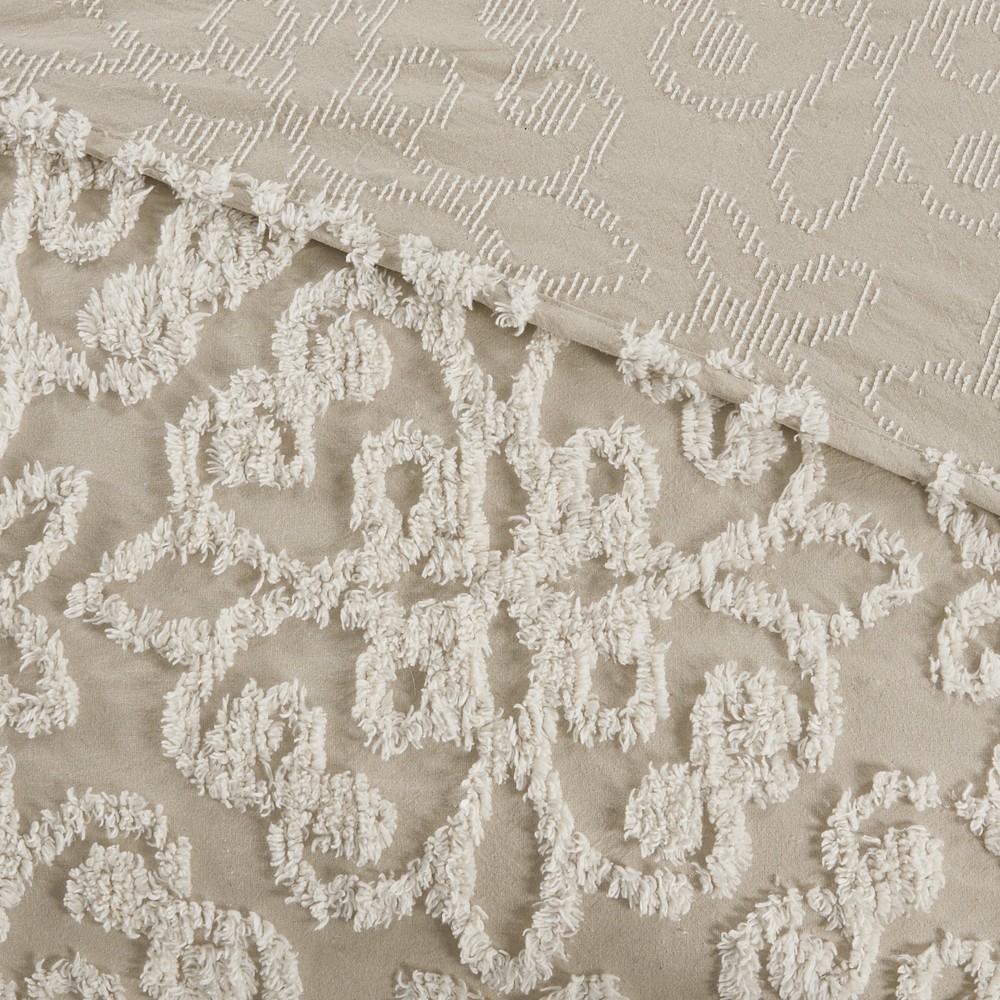 Home Essence Amber 3 piece Tufted Cotton bedspread set: Full/Queen Set Includes: 1 Bedspread (102"W x 118"L), 2 Standard Shams (20"W x 26"L + 2") King/Cal King Set Includes: 1 Bedspread (120"W x 118"L), 2 King Shams (20"W x 36"L + 2") Bedspread/Sham: Tufted cotton chenille with hemmed finish, cotton chenille reverse Shabby chic cotton chenille bedspread set in floral medallion Oversized to have better draping coverage for the entire bed Bedspread is not filled or quilted Oeko-Tex Certified, includes no harmful substances or chemicals (# 19.HIN.73178) Sham Closure: Overlap Machine washable for easy care