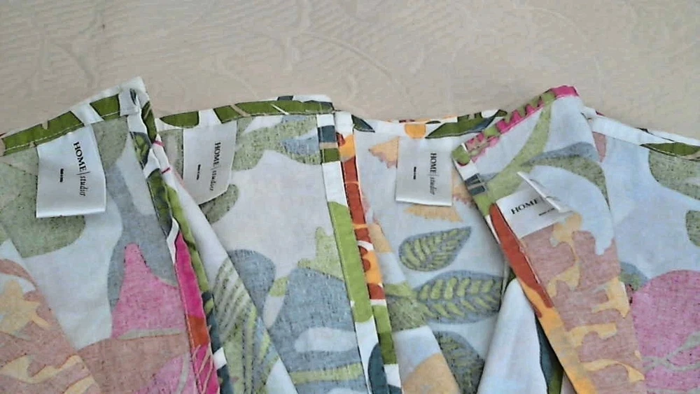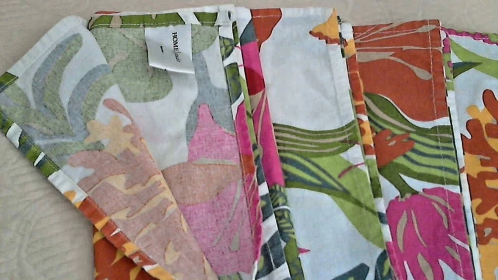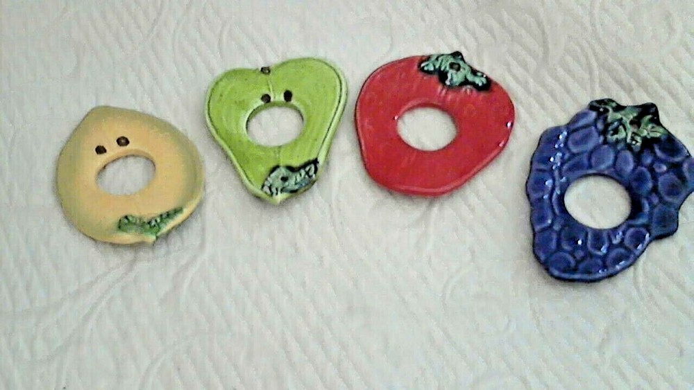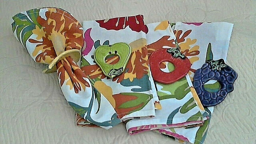 Set of 4 100% Cotton Brite Print Napkins and added 4 Fruit Ceramic Concave Napkin Rings that match the colors in the napkins. (The napkin rings are 2 - 2.5" x 3" and there is a lemon, pear, grapes, and strawberry.) They measure 18.5" x 18.5" and have folded and sewn borders and a right and wrong side. It is a very brite print of leaves and flowers. They are New by Home Studios as all the tags are crisp and new. Made in India. Machine wash cold like colors, non chlorine bleach when needed, tumble dry low. Very nice. Weight: 11.2 oz for all. *The colors are brite but they could be colors to use anytime since they include darker greens and orange as well as pinks and greys on a white background. The napkin rings enhance the brite colors in the napkins. It makes a very nice brite dinner set. USA Seller..................................... Happy Shopping Always.......................