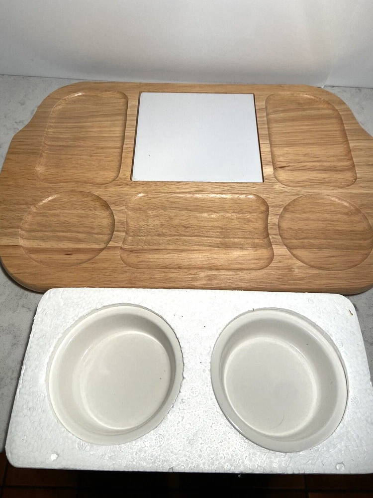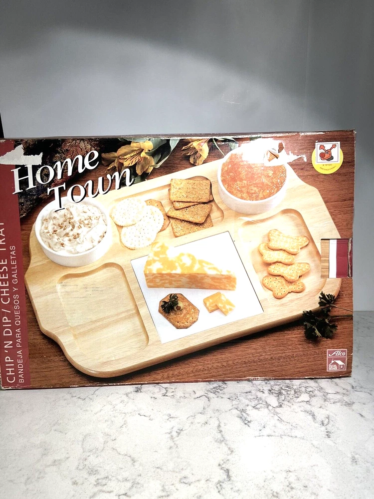 Presenting a beautiful Hometown chip and dip/cheese wooden board with a touch of vintage elegance. This serving tray features a marbled pattern with two compartments, perfect for all occasions. The large rectangle shape with lt wood tones and shiny finish, measures 18 inches in length, 12 inches in diameter, and 1 inch in width. Crafted from high-quality wood and marble materials, this contemporary-style tray comes with two white bowls, making it the perfect addition to your kitchen, dining, or bar area. The item weighs 4 lb and is manufactured in China. Impress your guests with this versatile and functional tray, ideal for serving chips, dips, cheese, and more.