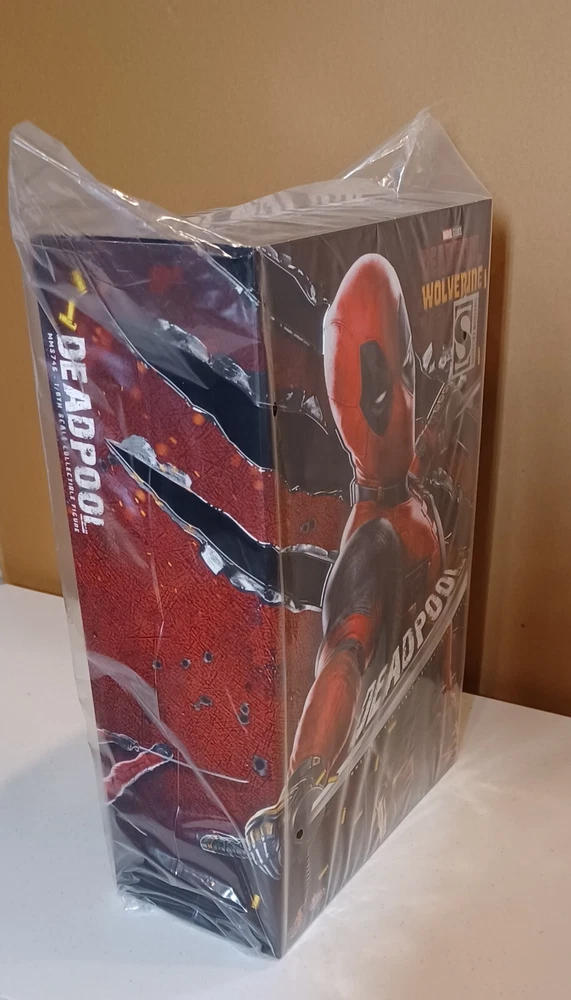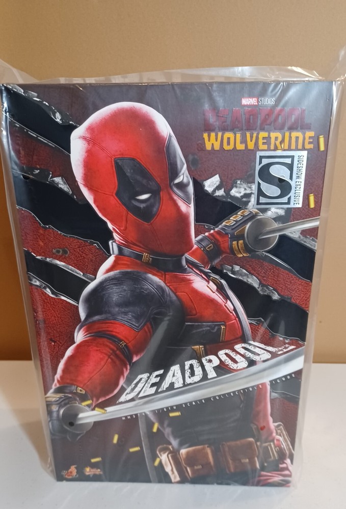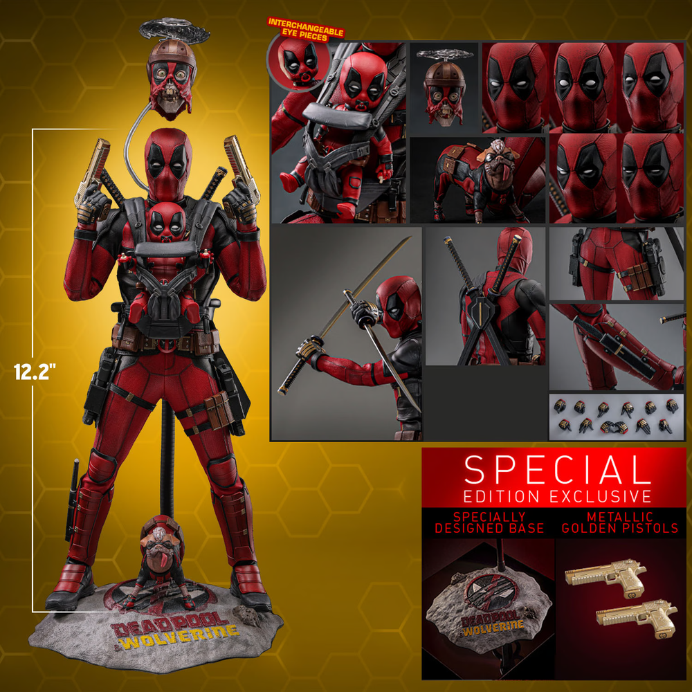 What's in the Box!! The Deadpool (Special Edition) Sixth Scale Figure features: Authentic and detailed likeness of Deadpool in Deadpool & Wolverine movie One (1) newly developed masked head with five (5) pairs of interchangeable eye pieces that can create numerous combinations of Deadpool’s expressions Approximately 31 cm tall Newly developed body with over 30 points of articulation Twelve (12) pieces of interchangeable gloved hands including: One (1) pair for pistol holding hands One (1) pair of dagger/katana holding hands One (1) pair of open hands One (1) pair of finger pointing hands One (1) pair of heart gesture hands One (1) thumb-up right hand One (1) OK-sign left hand Costume: One (1) newly tailored red and black-colored Deadpool suit One (1) brown-colored utility belt with pouches and metallic red colored buckle One (1) pair of thigh gun holsters One (1) dagger sheath on shin One (1) pair of metallic red and black-colored boots Weapons: One (1) dagger Two (2) katanas Two (2) pistols Accessories: One (1) Babypool (rotatable head, articulated arms and legs) with two (2) pairs of interchangeable eye pieces and two (2) removable baby bottles One (1) baby carrier strap One (1) Headpool with movable jaw and two (2) styles of interchangeable fan (still and motion) One (1) Dogpool with goggles (moveable head, articulated front legs) One (1) katana sheath