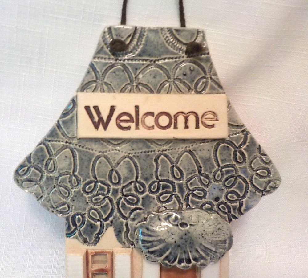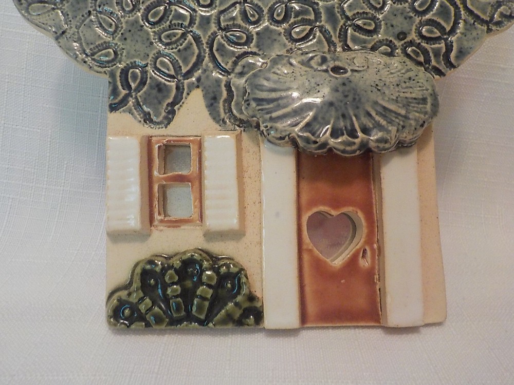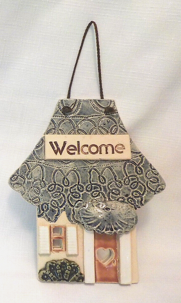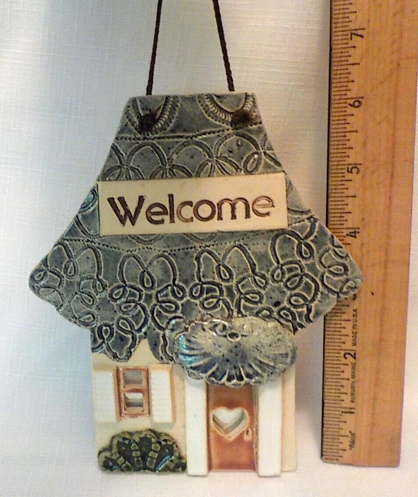 House Shaped Studio Art Glazed Ceramic Hanging Wall Decor WELCOME Plaque = = = = So perfect for your entryway of your house! Ready to hang. Or give as a gift to someone who is moving to a new house! Approximately 6.25" tall by 5.25" wide. No chips, cracks, crazing, or stains. A wonderful handcrafted art ceramic wall hanging of a cute house with a "Welcome" plaque on the roof. There is a tiny mirror that is attached to the back and it shines thru the open window & also thru the heart in the door for a touch of sparkle! Former owner removed a sticker on the back. Shipped in a box to protect your purchase. Enlarge my photos & check my "Item Specifics" to see all the details. Our mailing costs are based on weight of item, dimensional size of box/envelope & proper packaging materials. We do NOT offer "free" shipping. We do not falsely hide the shipping costs in the price of our items. USPS mail cost is based on your zip code. I have no control over the shipping charges. If you have any questions about the color, please ask before purchasing. Pictures are part of my description. Review them carefully. If you need more photos – just ask. SHIPPING DAMAGES & DELAYS: I carefully package each item, so you receive the item exactly as pictured in my listing. However, circumstances happen during the shipping & handling after I mail, such as: damage, delay or lost items. If any of those situations occur, the buyer is responsible to take up any issue with their USPS carrier or local PO directly. USPS want to see the condition of the shipping box and all of the contents in order to issue a refund. RETURNS are accepted for an item, if it doesn’t match the listing description. If buyer changes their mind, the color is slightly different (there are different dye lots for pottery, clothing, wallpaper or fabric) or if you ordered the wrong item or size – the buyer pays for return shipping. THANKS FOR LOOKING!
