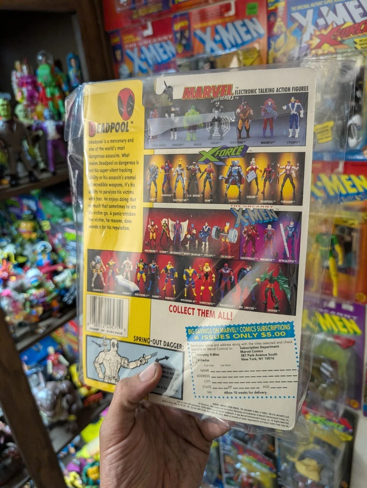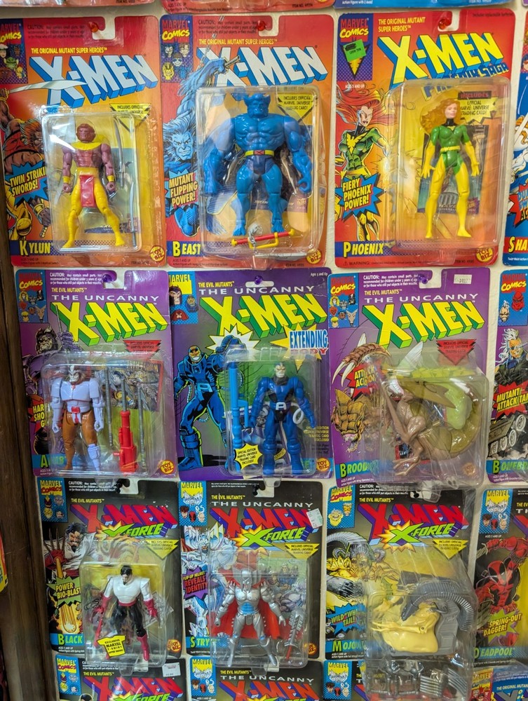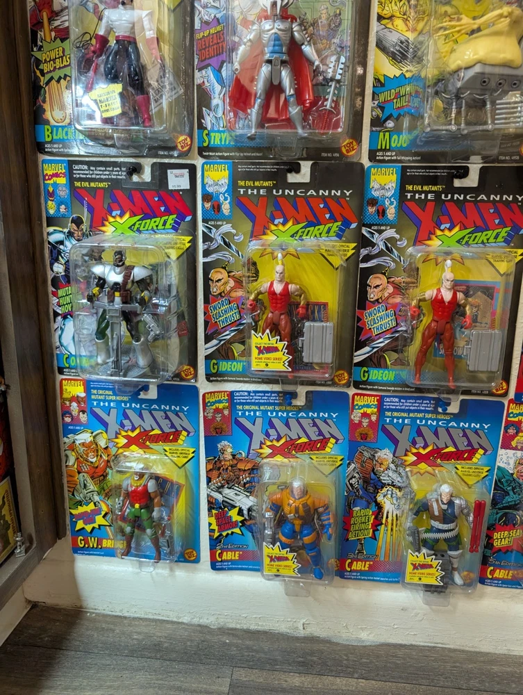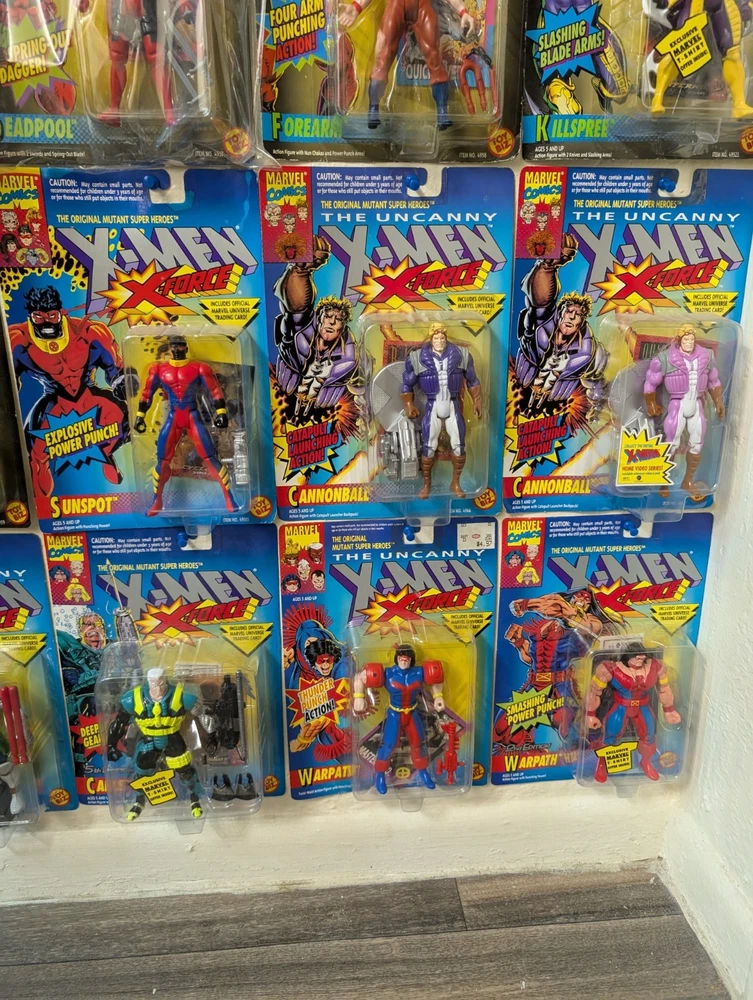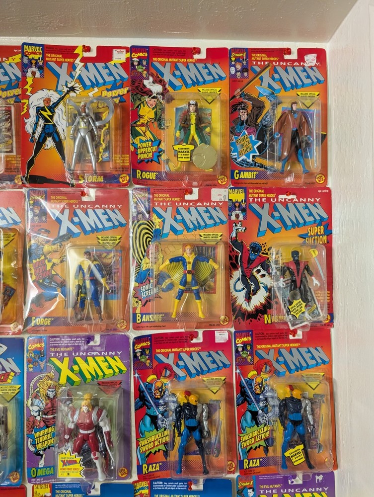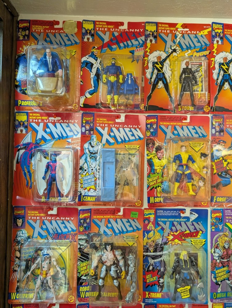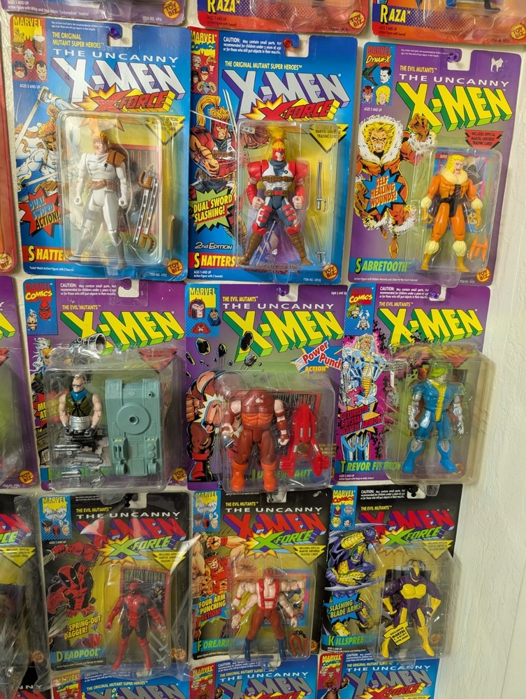 I'm letting go of my X-Men toybiz collection. For sale are 48 unique carded figures, no doubles. Multiple sets of variants of the same character though. There is a very very nice condition Deadpool that's been kept in plastic since purchase included, slight bending on that card otherwise mint and i think would grade well. If you would like condition for any figures or individual pictures please ask. These will be shipped safely by UPS, and it's a HUGE box, so the charge is unfortunately accurate. Professor X Cyclops Storm (black) Storm (silver) Rogue Gambit Archangel Iceman Morph Forge Banshee Nightcrawler Wolverine (4th edition) Wolverine (6th edition) X-Treme Omega Red Raza Raza (t-shirt sticker variant) Kylun Beast Phoenix Shatterstar (first edition) Shatterstar (second edition) Sabertooth Ahab The Sentinel Brood Bonebreaker Juggernaut Trevor Fitzroy Black Tom Stryke Morph Deadpool Forearm Killspree Comm Cast Gideon Gideon (t-shirt sticker variant) Sunspot Cannonball (purple) Cannonball (pink) GW Bridge Cable (2nd Edition) Cable (3rd Edition) Cable (5th Edition) Warpath (1st edition) Warpath (2nd edition)