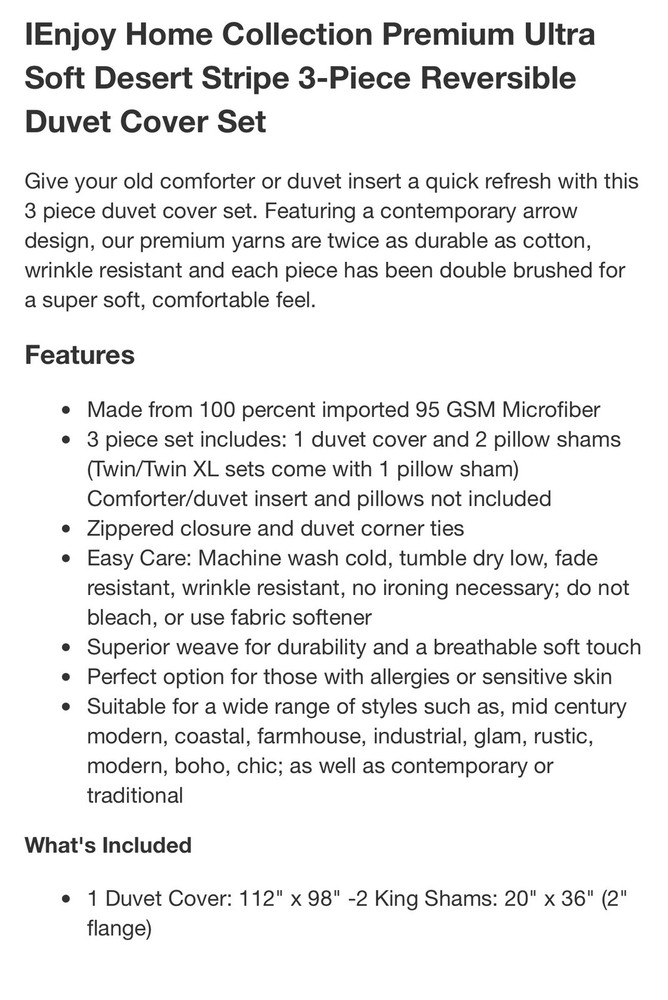 Enjoy Home Collection Premium Ultra Soft Desert Stripe 3-Piece Reversible Duvet Cover Set Give your old comforter or duvet insert a quick refresh with this 3 piece duvet cover set. Featuring a contemporary arrow design, our premium yarns are twice as durable as cotton, wrinkle resistant and each piece has been double brushed for a super soft, comfortable feel. Features • Made from 100 percent imported 95 GSM Microfiber • 3 piece set includes: 1 duvet cover and 2 pillow shams (Twin/Twin XL sets come with 1 pillow sham) Comforter/duvet insert and pillows not included • Zippered closure and duvet corner ties • Easy Care: Machine wash cold, tumble dry low, fade resistant, wrinkle resistant, no ironing necessary; do not bleach, or use fabric softener • Superior weave for durability and a breathable soft touch • Perfect option for those with allergies or sensitive skin • Suitable for a wide range of styles such as, mid century modern, coastal, farmhouse, industrial, glam, rustic, modern, boho, chic; as well as contemporary or traditional What's Included • 1 Duvet Cover: 112" × 98" -2 King Shams: 20" × 36" (2" flange Please message me with any questions you might have, I am more than happy to answer them and help with your purchase! Only reasonable offers will be considered, don’t insult me with a ridiculously low offer, they will be denied. Returns are not accepted