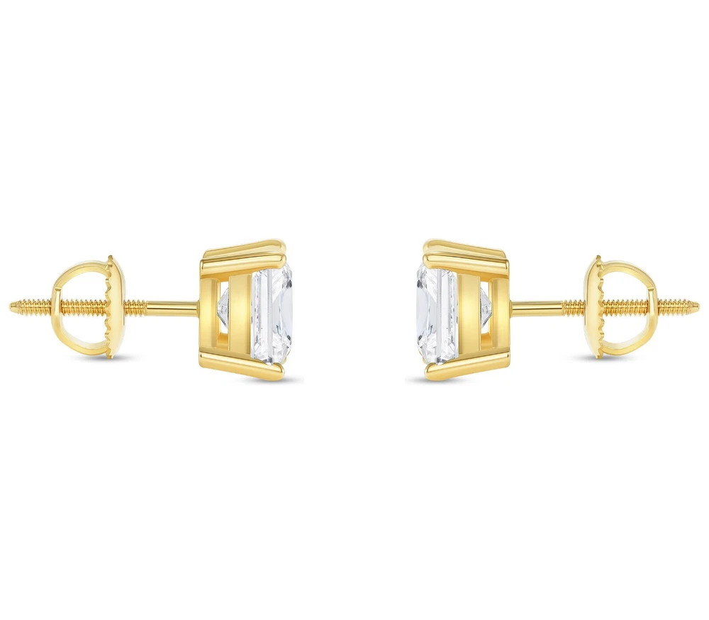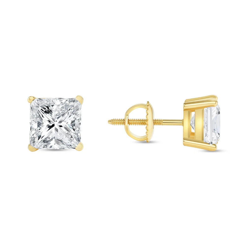 2.5 Ct Princess Cut Lab Grown/Created Diamond Stud Earrings Set in Genuine 14K Yellow Gold These exquisite lab-grown/lab-created diamond stud ear rings are crafted out of solid, genuine 14k yellow gold and brilliant cut diamonds. This design of stud earrings is one of the most desired and classy of all. They are set in a unique, durable, 4-prong basket mounting with a threaded post and screw backs to provide for an optimum closure method and peace of mind while the earrings are being worn. The diamonds emit every shade of light and brilliance that a natural diamond would, and they are chemically, physically, and optically identical to mined diamonds originating from nature. Both have the same chemical composition and atomic structure, producing the very same durability, fire, radiance, and sparkle. Laboratory grown diamonds are a testament to the use of technology and human achievement, and they also play a vital role in reducing our environmental impact and creating truly conflict-free diamonds. And as for the question on everyone's minds regarding the authenticity and legitimacy of l ab-grown diamonds , YES, since these stones are 100% genuine diamonds in every way, they will register as positive (real) when tested with a diamond tester! There's no reason not to jump in! Brand --> Shine Brite With A Diamond Total Carat Weight (TCW) --> 2.5 Carat (1.25 Ct. (Approx. 6 mm x 6 mm) each) Metal --> Real , Genuine , Solid Yellow Gold Metal Purity --> 14K (585) Gem Type --> 100% Lab-Grown/Lab-Created Diamond Design --> Studs Main Stone Shape --> Princess, Brilliant Cut Diamond Color --> F/G Diamond Clarity --> VS1/VS2 Diamond Cut --> Excellent Mohs Hardness --> 10 Setting --> 4-Prong Basket Type of Post or Back --> Screw Back Number of Stones --> 2 Country of Manufacture --> United States Origin of Stones --> State-of-the-Art Laboratory IGI Certification Included? --> Yes Availability --> Limited Quantity So What Will I Be Receiving in the Mail? A Pair of Genuine Solid 14 Karat Yellow Gold Princess Brilliant Cut Lab Grown Diamond Stud Earrings . An Elegant and Luxury Jewelry Box. IGI Certificate for both diamonds & Certificate of Appraisal (orders $500+ automatically qualify for eBay's Authenticity Guarantee!). REFUNDS We guarantee your satisfaction and offer a 30-day money-back return (or exchange) policy. If for any reason you are unsatisfied with your purchase, please contact us first before opening up a case or leaving negative/neutral feedback so that we could make things right! We are here to help YOU! SHIPPING Most items will ship free within 1 business day with USPS Priority Mail for expedited delivery. Please select the FedEx shipping options at checkout for even faster (overnight and 2-day) delivery. CONTACT US We're always available by e-mail through eBay messages. Please feel free to contact us anytime with any questions or concerns you may have, and we will get back to you as soon as possible (typically within 1 business day). Thank you!