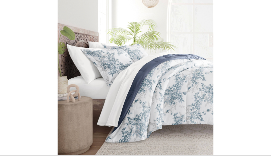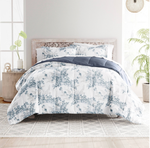 Unwind in the serene embrace of the ienjoy Home Bamboo Leaves Blue 3-Piece Comforter Set, tailored for King or Cal King-sized beds. The set features a comforter and two standard/queen-sized shams, all adorned in an elegant stone hue that brings a touch of nature-inspired beauty to your bedroom decor. Crafted with an eye for style and comfort, this set includes responsibly sourced bamboo viscose, offering a luxurious feel that is both soft and durable. The timeless design, complemented by the serene blue hue, creates a peaceful atmosphere in any sleeping space.