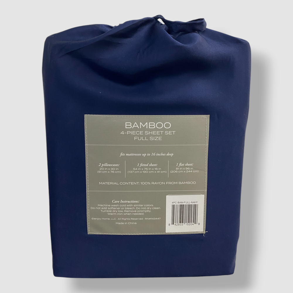 Ienjoy Home Blue Navy Luxury Rayon from Bamboo 4-Pc. Sheet Set, Full Size Description 4-piece set includes: 1 Flat Sheet, 1 Fitted Sheet, and 2 Pillowcases 1 Full Fitted Sheet - 54"W x 75"L, 16" 1 Full Flat Sheet - 81"W x 96"L 2 Standard Pillowcases - 20"W x 30"L Fade Resistant Hypoallergenic and Antimicrobial for allergy sufferers and sensitive skin 16" deep pocket fitted sheets - perfect for oversized mattresses Superior weave for durability and a silky-smooth touch OEKO-TEX® STANDARD 100 certified Rayon from Bamboo Machine wash cold, tumble dry low Imported About Us We sell only 100% authentic clothing from new with tags to gently used. We have a 100% authentic or money back guarantee on every item we sell. Items are listed daily so make sure to put us on your favorite! We have been in business for over 10 years selling tens of thousands of designer items. We strive to meet your designer needs at a quality price! Payment Shipping Returns Payment accepted via paypal, credit/debit card. Shipping is usually within 24 hours of purchase (M-F). Super fast service. Tracked delivery. 100% satisfaction guaranteed. Please review our eBay return policy for more details.