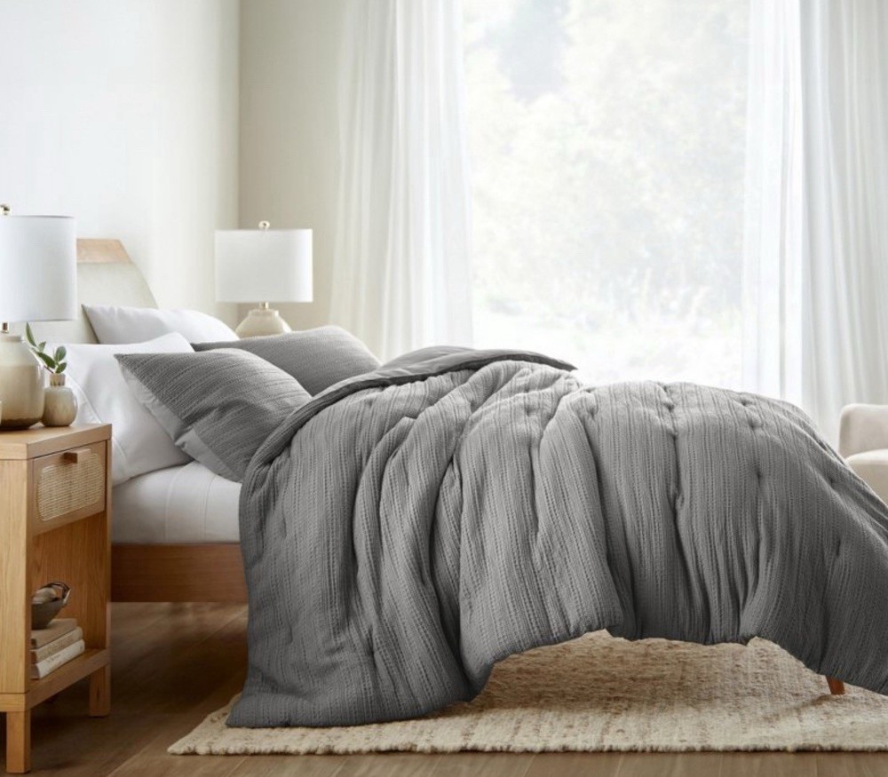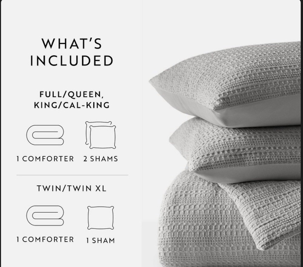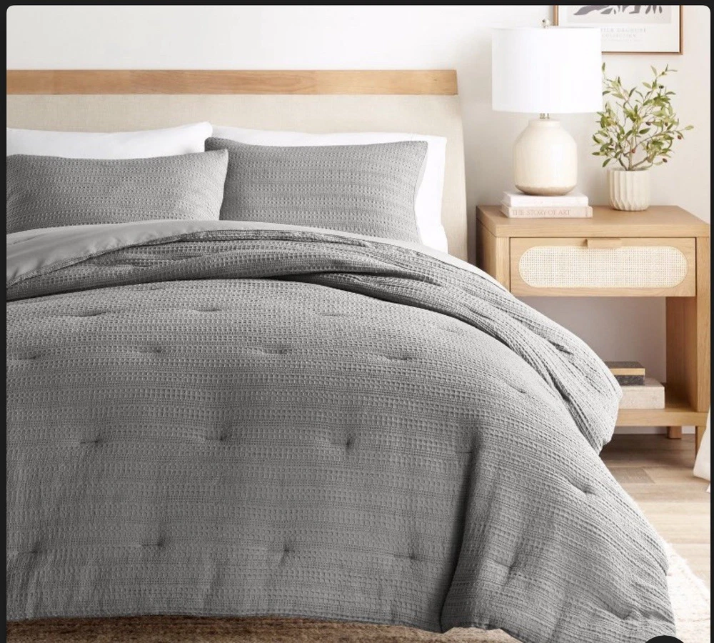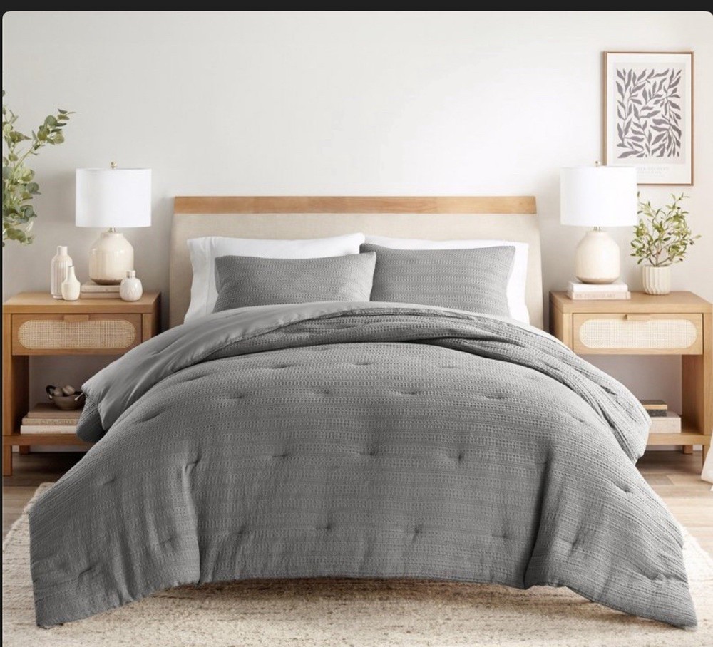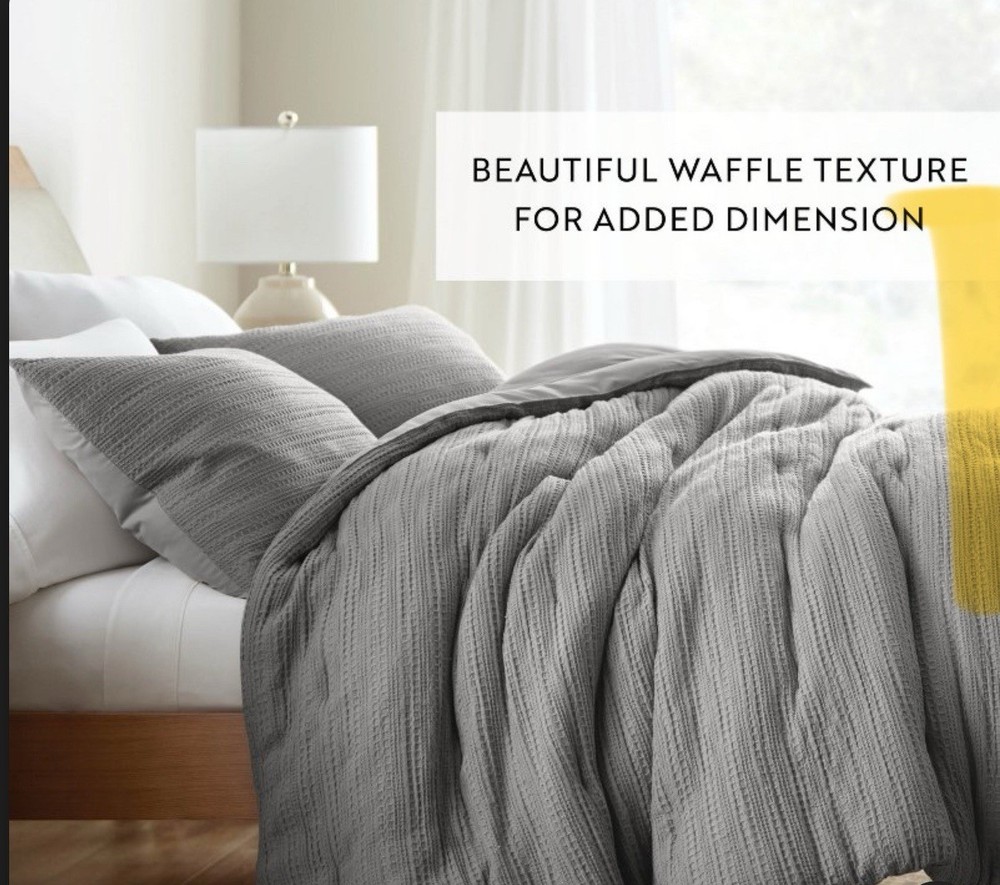 The Ienjoy Home Gray Waffle Textured 2-Piece Comforter Set in size Twin/Twin XL is a stylish and comfortable bedding set perfect for any bedroom. Made of soft polyester material, this comforter set features a cozy design with a waffle texture in a stylish gray color. This set includes a duvet cover and a sham, providing everything you need to add a touch of comfort and style to your bedroom decor. Ideal for a Twin or Twin XL bed, this comforter set is a practical and attractive addition to any home.