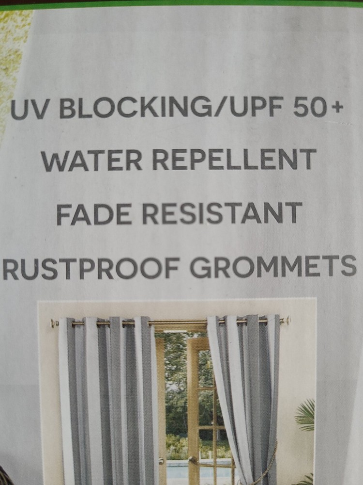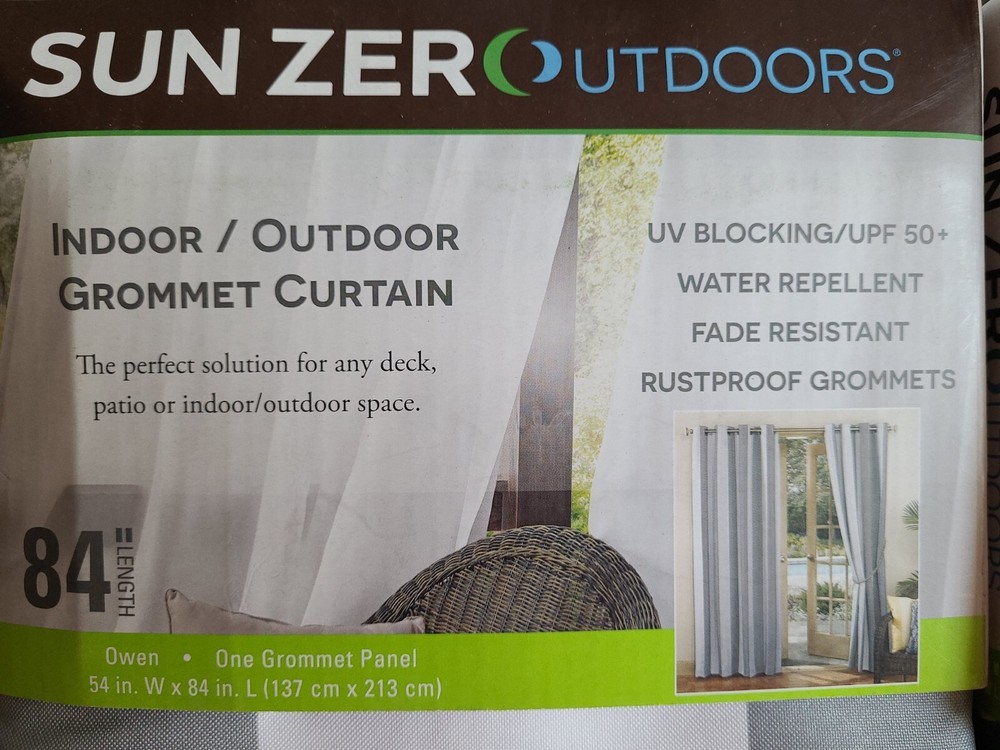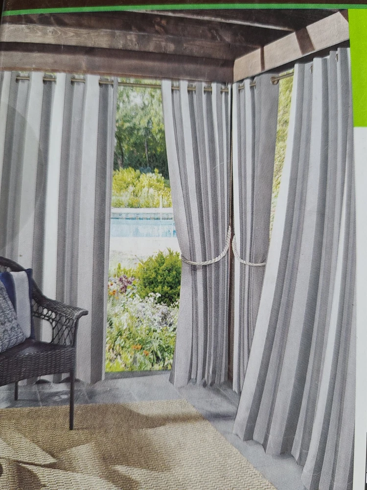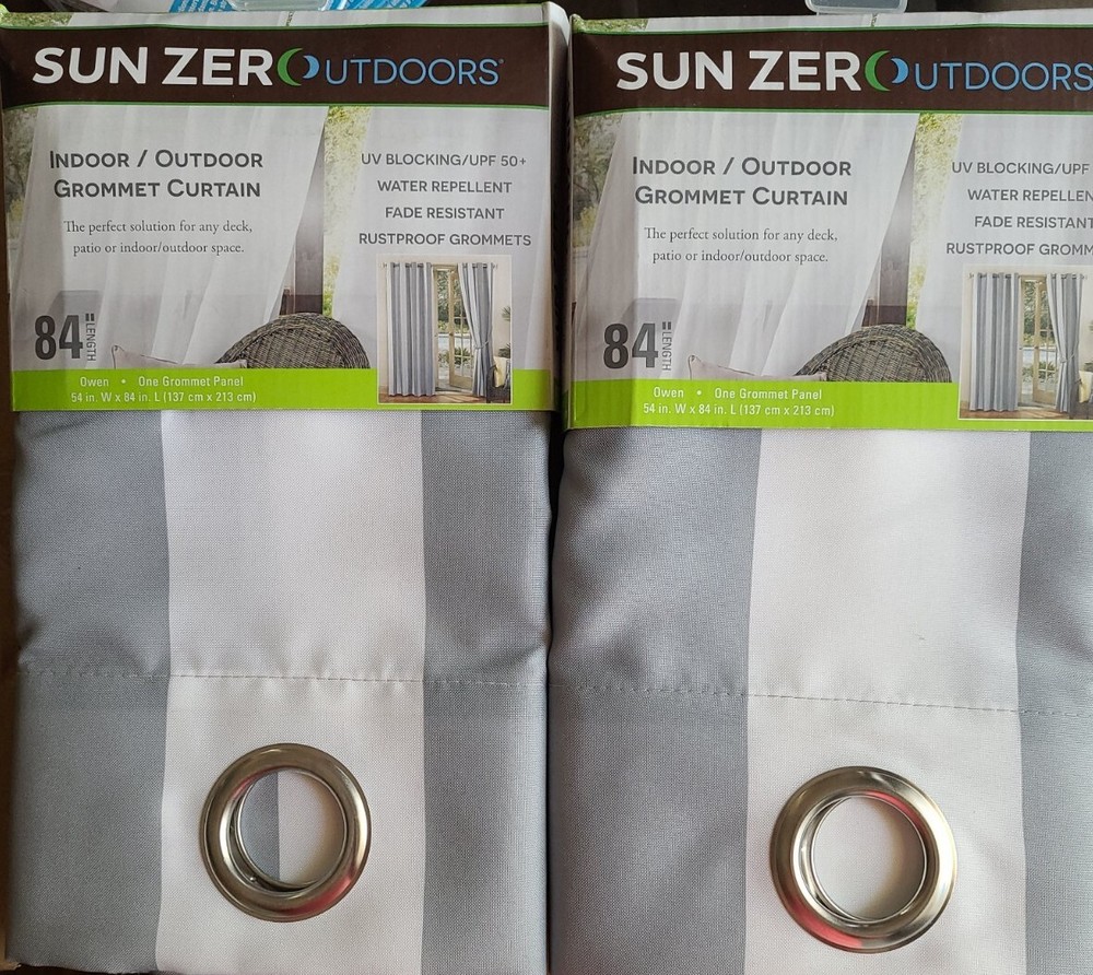 Brand new by SUN ZERO OUTDOORS.. STYLE name is OWEN. These are the perfect Indoor/Outdoor Cabana Grey & White Stripe set of Curtain Panels to make your outdoor & indoor living even more enjoyable. Each panel is 84" x 54". NIP Any pergola or gazebo, deck, or Sun room would be that much more appealing/stylish while adding privacy. They could blend nicely in any room. Sleek & classic. 100% polyester. Mashine wash & dry. Enjoy for years to come. FAST SHIP SAME DAY WHEN POSSIBLE