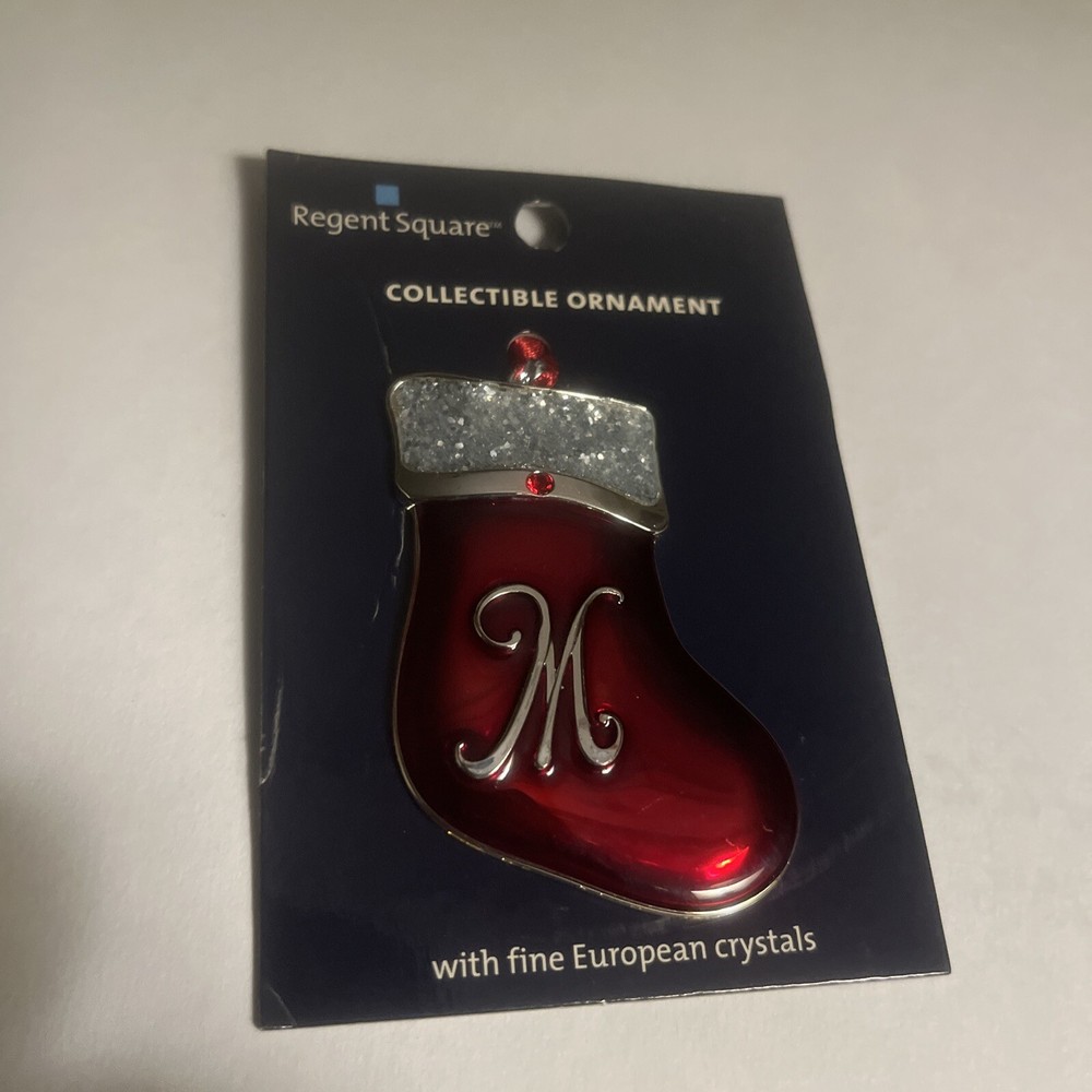 Initial Christmas Ornament "M" Enamel Stocking Studio Design Regent Square. With fine European crystals W
