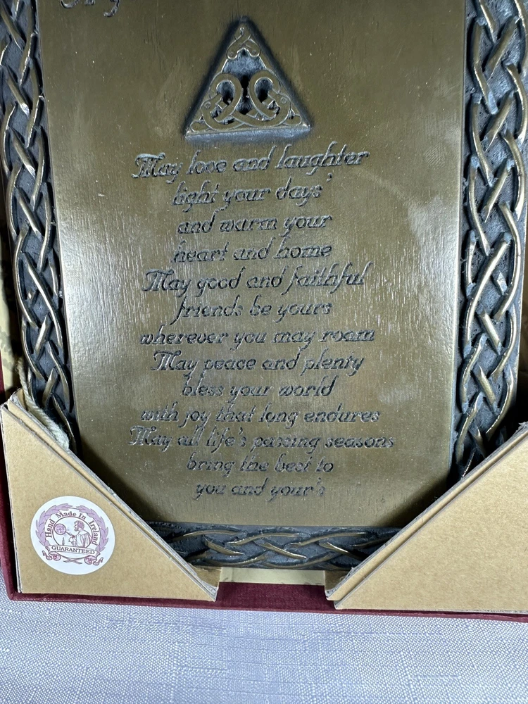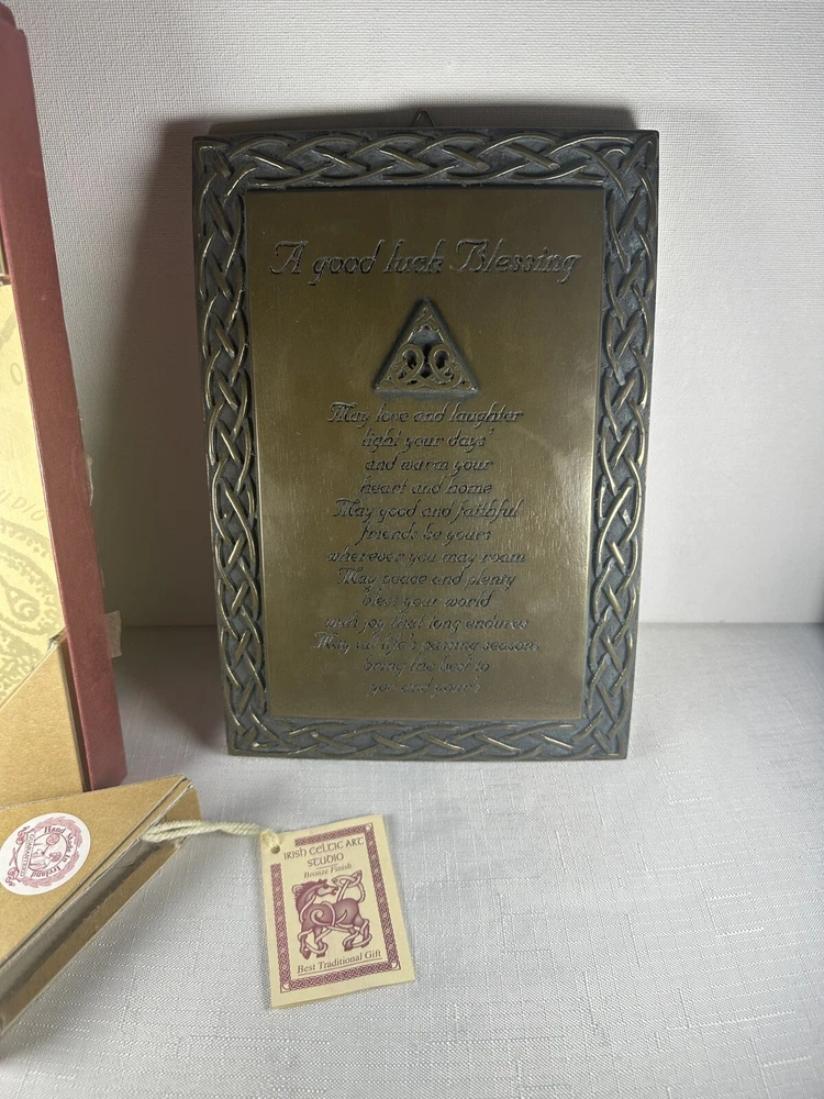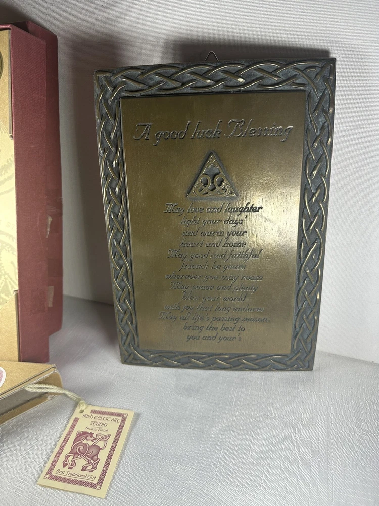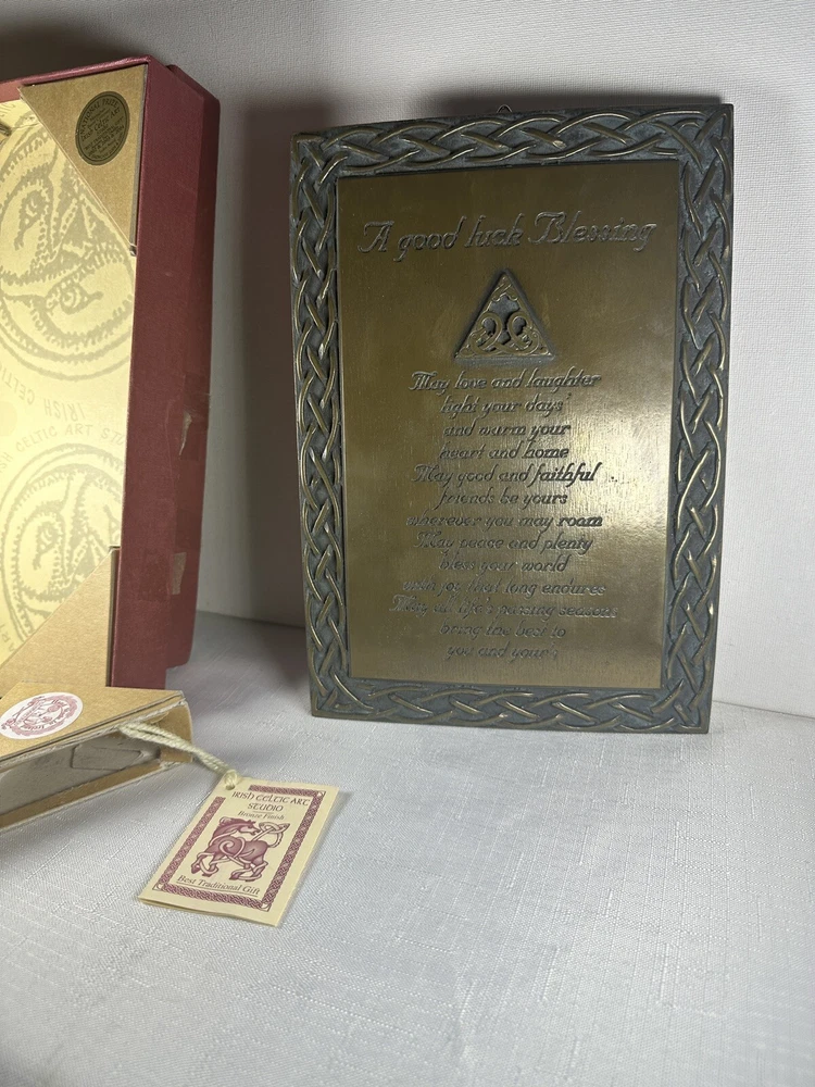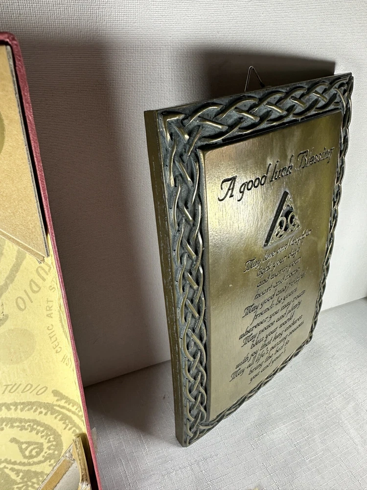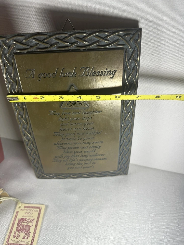 Display the beauty of Ireland in your home with the Irish Celtic Art Studio's bronze finish wall plaque. This exquisite piece features a square shape adorned with a Celtic Knot pattern and a heartfelt Irish Blessing. Handmade in Ireland, it is made of high-quality bronze material and measures 10 inches in length and height, and 7 inches in width. This medium-sized plaque is perfect for any room and can be easily mounted on the wall. Its luminous and textured features add a touch of elegance to your home decor. The plaque does not require any additional parts. Get your hands on this vintage piece from the Irish Celtic Art Studio and add a touch of Irish culture to your home.