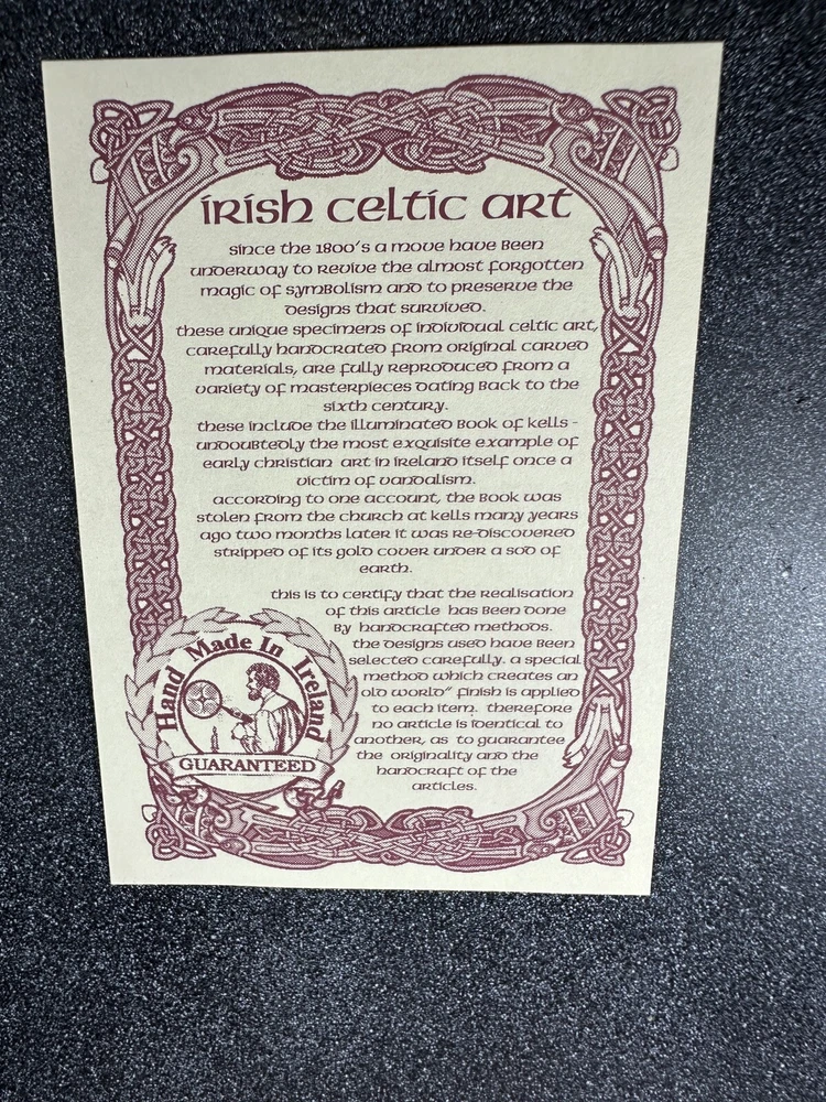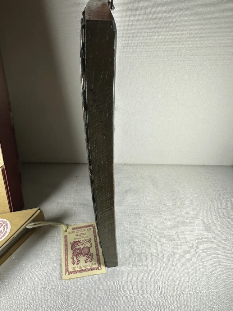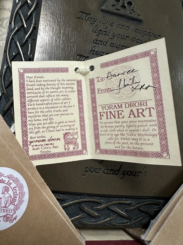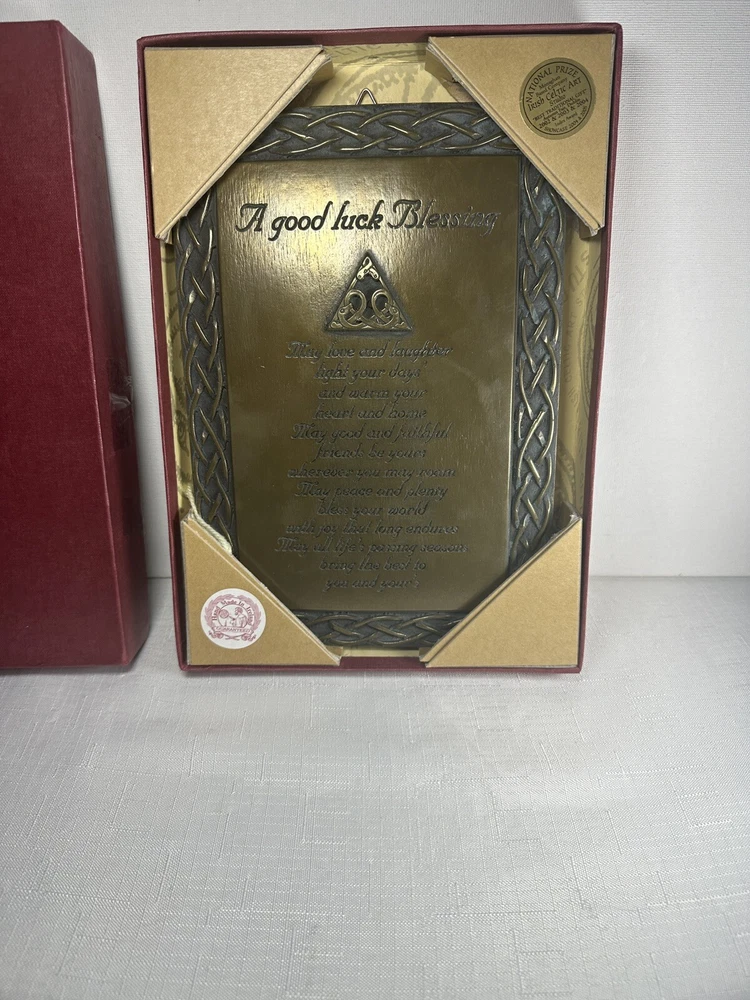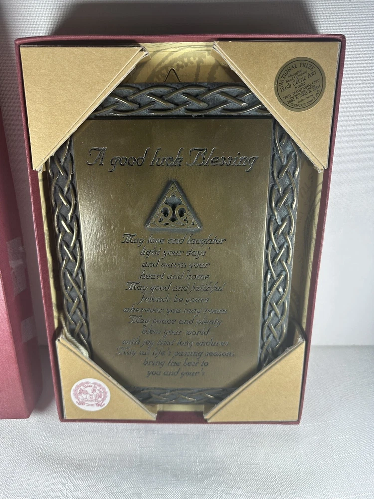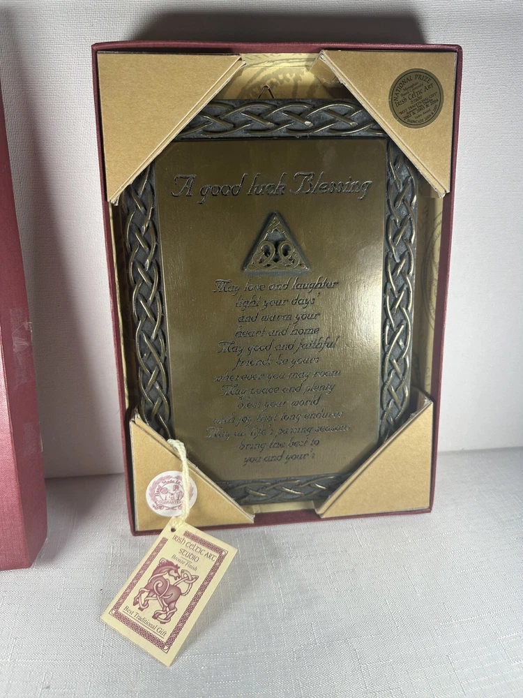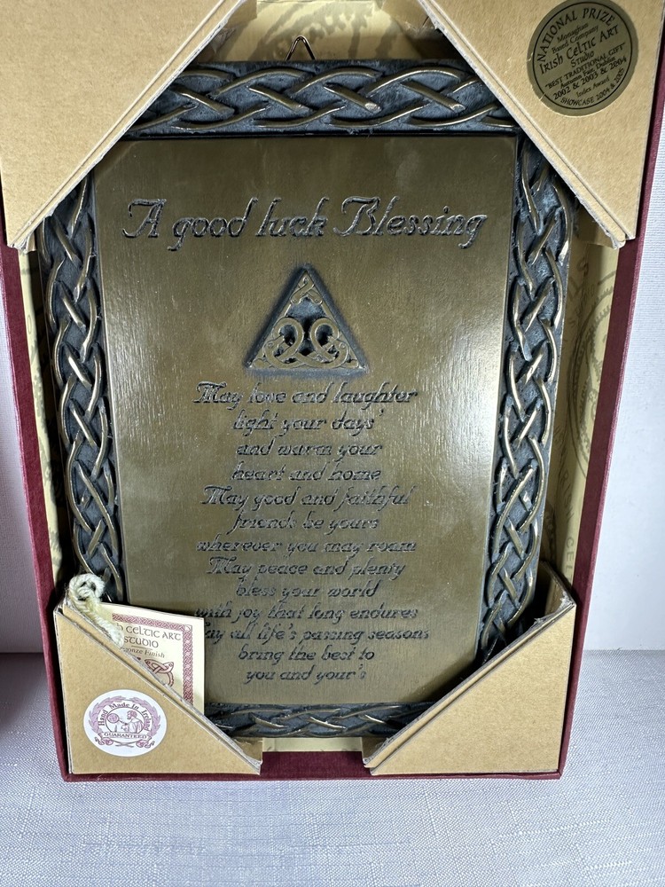 Display the beauty of Ireland in your home with the Irish Celtic Art Studio's bronze finish wall plaque. This exquisite piece features a square shape adorned with a Celtic Knot pattern and a heartfelt Irish Blessing. Handmade in Ireland, it is made of high-quality bronze material and measures 10 inches in length and height, and 7 inches in width. This medium-sized plaque is perfect for any room and can be easily mounted on the wall. Its luminous and textured features add a touch of elegance to your home decor. The plaque does not require any additional parts. Get your hands on this vintage piece from the Irish Celtic Art Studio and add a touch of Irish culture to your home.