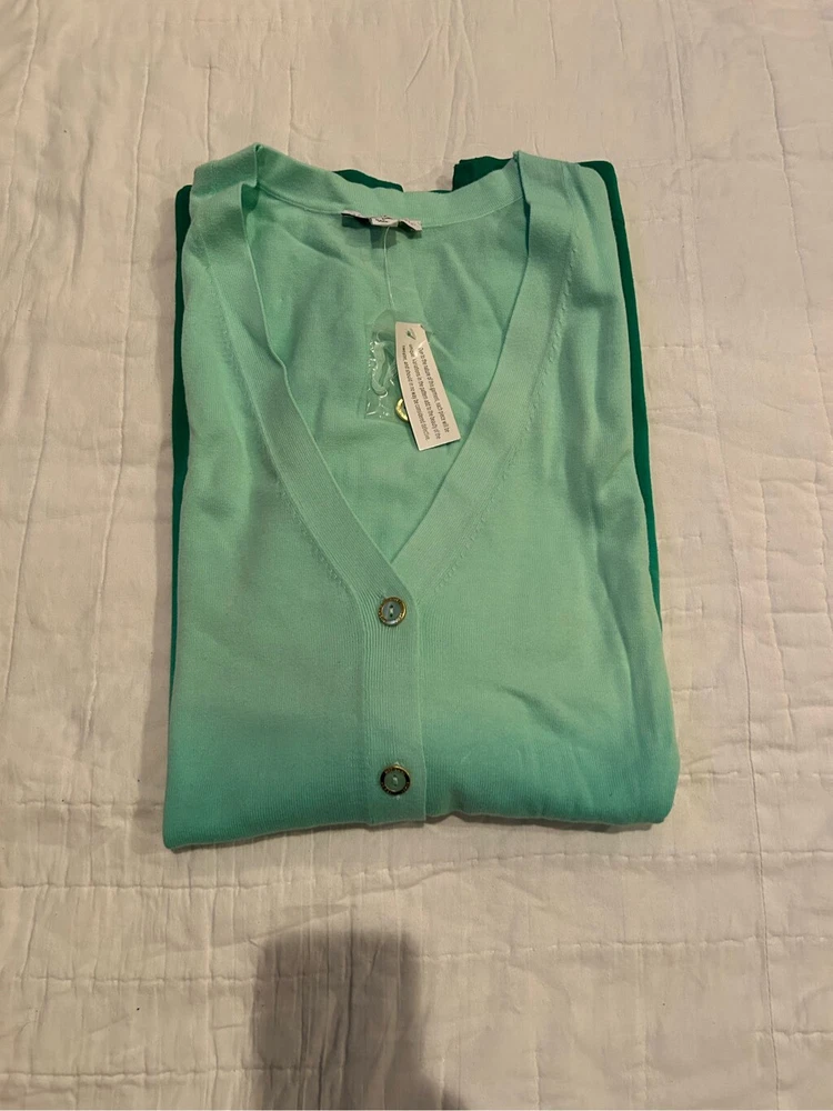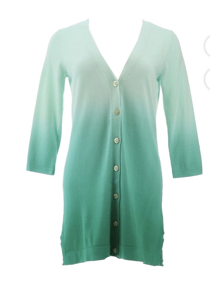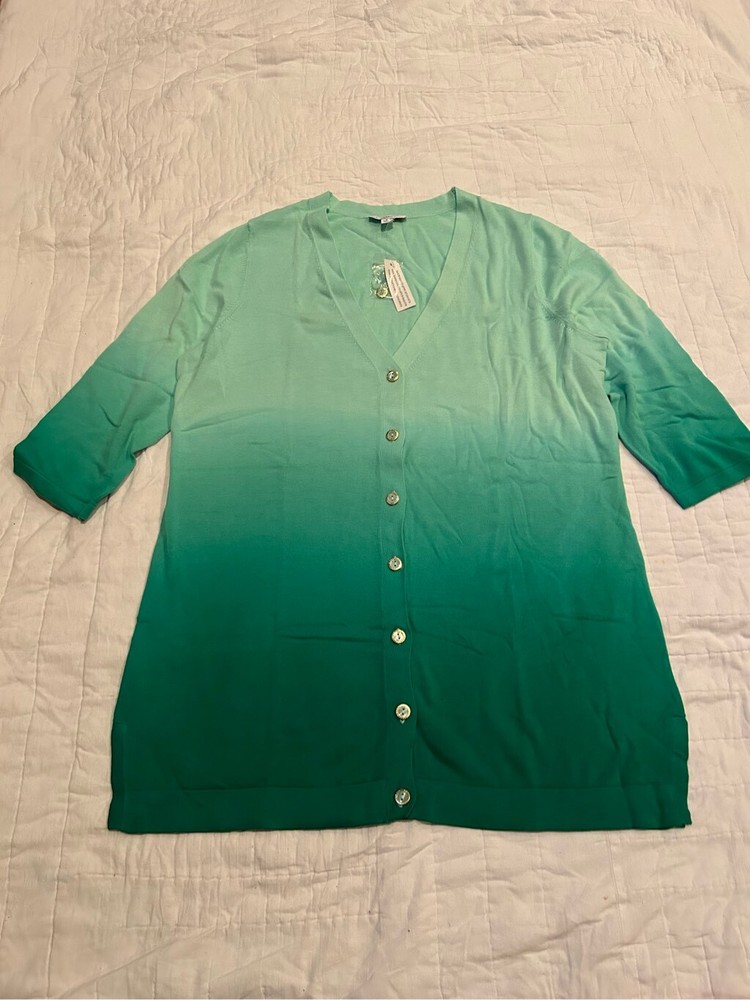 Isaac Mizrahi dip dye boyfriend fit cardigan Hold rimmed buttons V neck Sorbet like hues ready for spring 3/4 length sleeves Semi fitted Approximate measurements 21.5” pit to pit 22” waist/hip bottom laying fit 32” in shoulder to hem laying flat NWOT Green hues Cross listed Please ask any questions Thank you for bidding