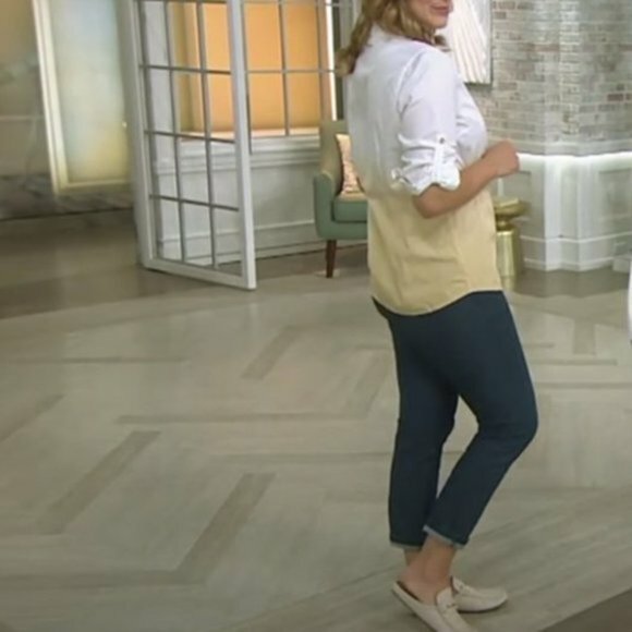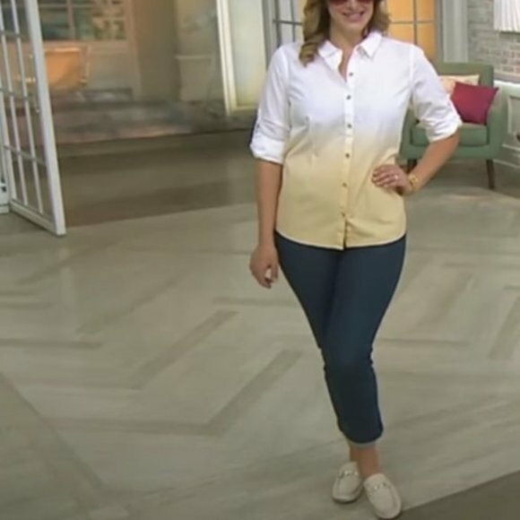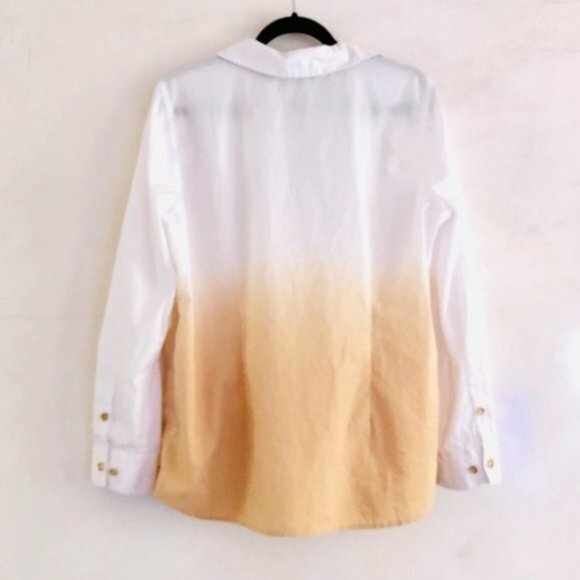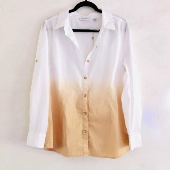 Woven button down white blouse with a beige ombre dip-dye by Isaac Mizrahi Live! Size L, new with tags! A dip-dye sandstone design enhances this button-front shirt with a vivid flourish. Collared neckline, matching buttons, and cuffed sleeves with roll tabs. Fitted. Gold & cream hardware. A great gift for your favorite fashionista! Measurements are approximate (laying flat): Bust: 23" Length: 26" Fabric: 100% cotton