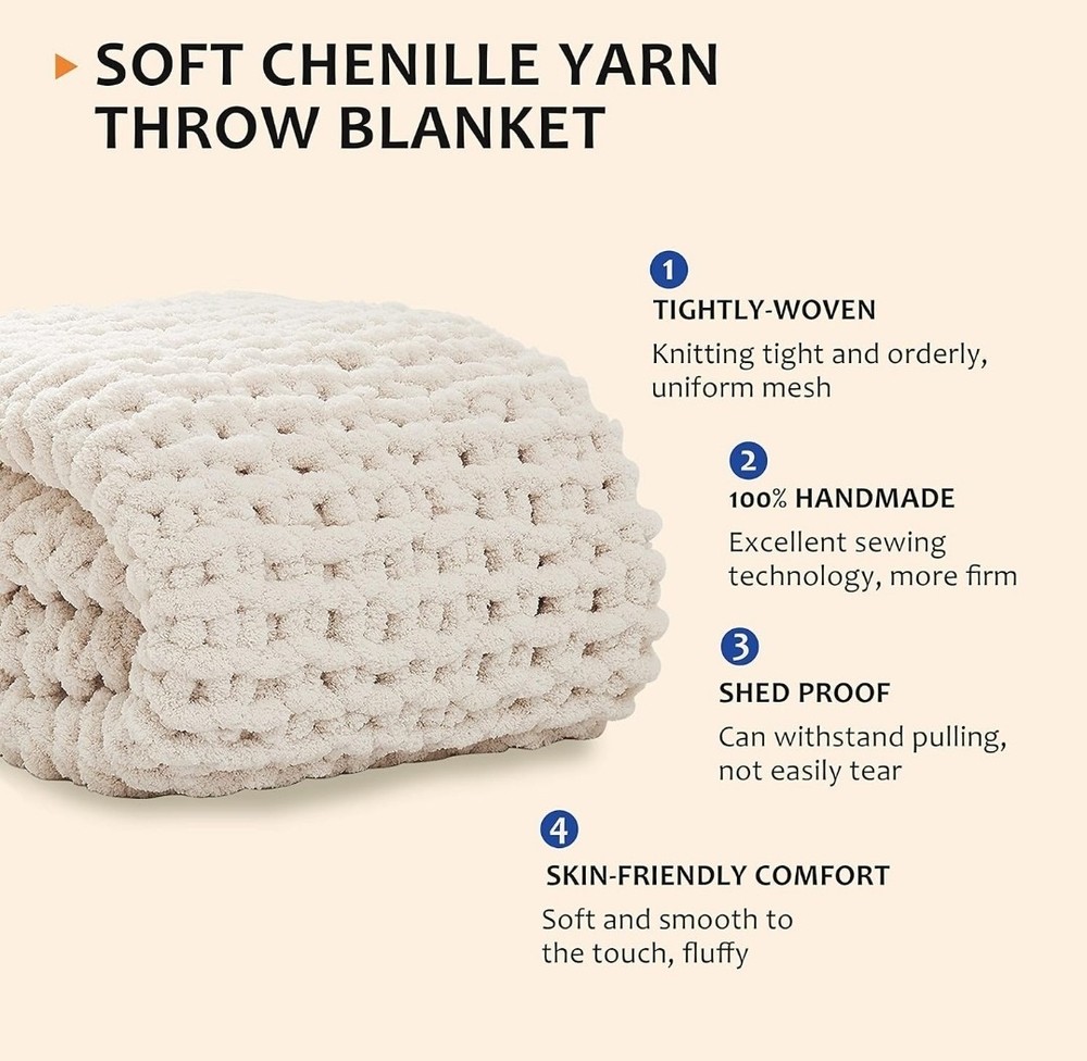 Brand New. Vacuum packed. Description 100% Handmade Chunky Knit Blanket: Our knit blanket throw is made from 100% hand-woven fabric with premuim Chenille yarn, excellent handcrafted knitting improves yarn density to create a warm and soft touch, full body hug to immerse you in tenderness Long-Lasting: Soft chenille throw blanket has been pulled and tested many times to ensure that is not easy to shed, pilling, tear into pieces, or even wear! The handmade cable knit crochet blanket is neatly arranged with small holes, breathable and warm Chenille Chunky Knit Blanket: Our cable knit blanket offers a variety of sizes and colors for you to choose from. The smallest size chunky crochet blanket can be used for kids and pets, and the large size knitted blanket chunky is suitable for adult use