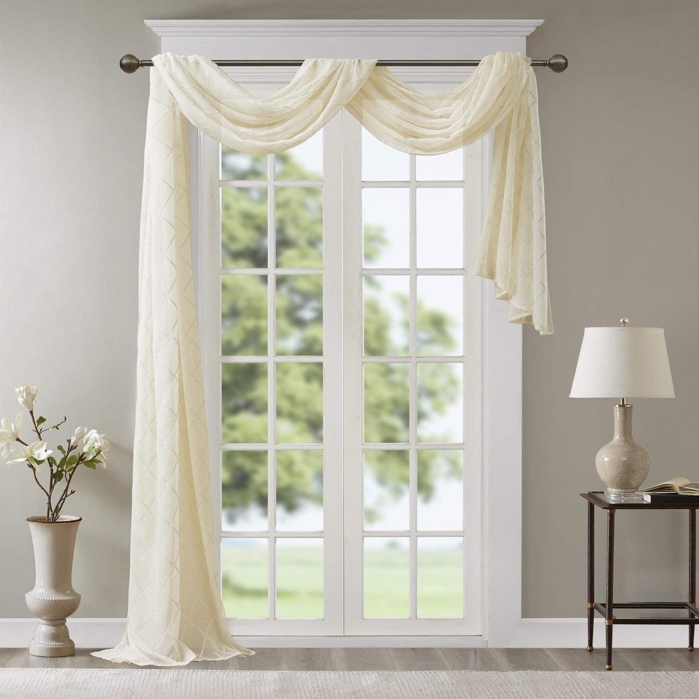 ’s Irina Diamond Sheer Window Scarf provides an alluring update to your home. An elegant diamond pattern is beautifully embroidered on a soft sheer fabric, adding grace and charm to your décor. The neutral colours and light fabric helps create a delicate look to soften any room. Perfect on it's own as a beautiful drape to frame any window, or complete the look with coordinating window panels, sold separately. All over diamond embroidery design Lightweight sheer base fabric Coordinate with window panel for complete look DIY and drape to best fit your window Layer for custom look 100% Polyester Sheer 1 Window Scarf:50"W x 216"L Machine Washable