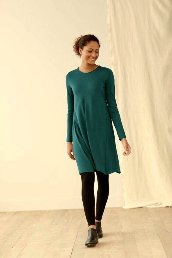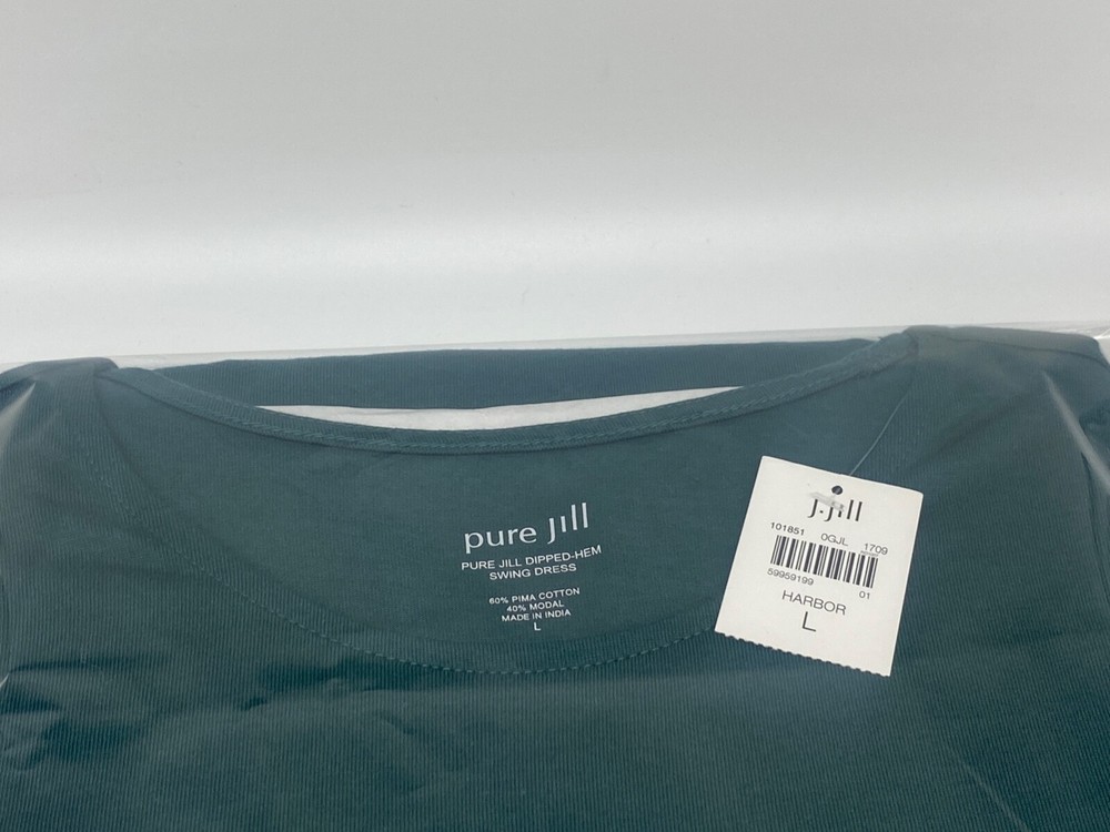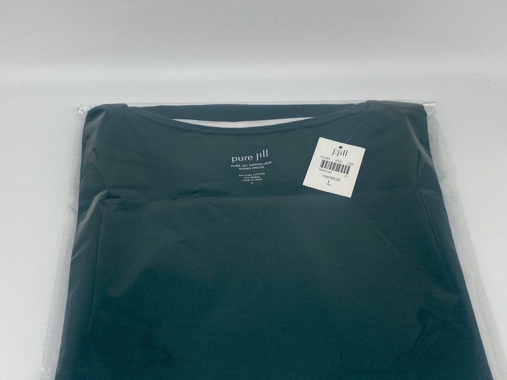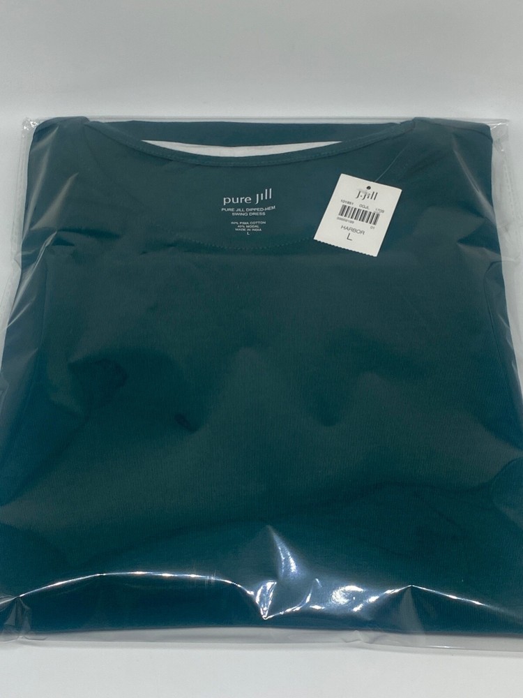 Our soft knit dress dips to soft points at the front and back hemline. Slight A-line shape. On-seam pockets. Above-knee length: 38" Bust: 44 1/2" Hip: 51"(A-line) Long sleeves: 25" 60% pima cotton and 40% modal rayon knit Machine wash or dry clean, tumble dry, low Imported Color: harbor Size: L(16) may fit XL(18) see measurements. NEW with TAG! Perfect new condition, first quality, NEWER worn ! Comes from a clean, smoke free home! ~ 1B4 ~