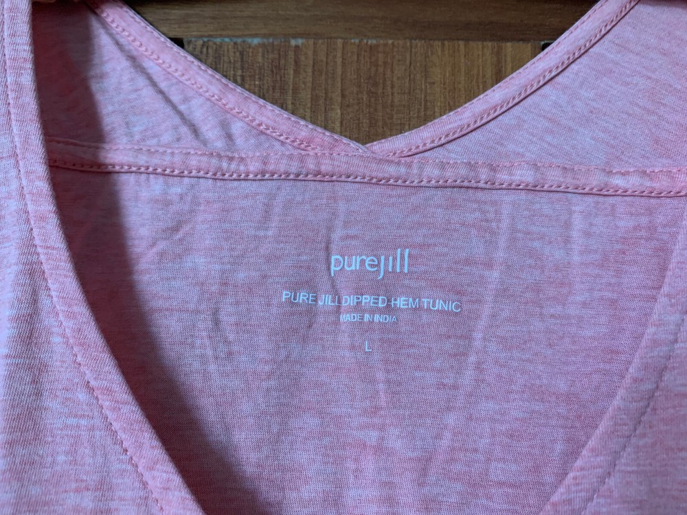 JJILL PUREJILL DIPPED HEM SLEEVELESS TUNIC SIZE L COLOR IS A ROSY Peach PINK 20" ARMPIT TO ARMPIT 31" LONG FROM SHOULDER TO HEM 24" ACROSS AT HIPS 100% PIMA COTTON EXCELLENT CONDITION--NO STAINS, TEARS Really Nice!!!