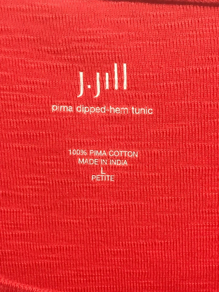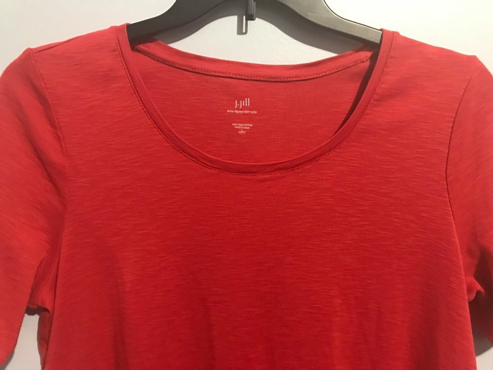 J Jill Pima Dipped Hem Tunic Knit Top Size Large Petite Red - More of a tomato red Side Slits Scoop Neck Shark Bite Hemline 100% Pima Cotton Approximate Measurements Taken Flat: Chest: 21" Length: 27-29" Shoulders: 16.5"