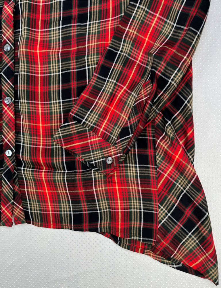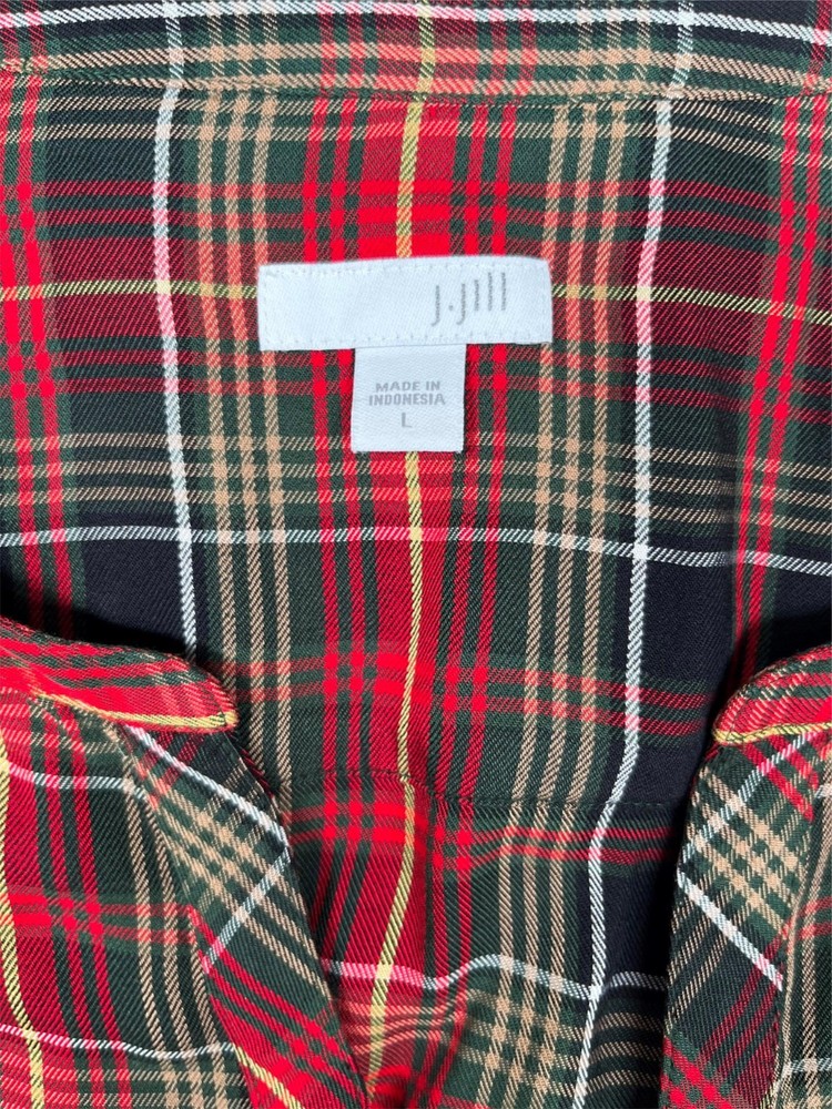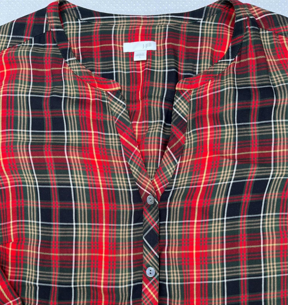 Excellent used condition Refer to the measurements in the photos for accurate sizing. Some variation in sizing happens with pre-loved clothing. The J. Jill Women's Plaid Button Down Dipped Hem Tunic in red, black and white, size L, offers a perfect blend of comfort and classic 90's Retro style. Designed with a relaxed fit, dipped hem and button cuffs, this tunic drapes effortlessly, making it a great choice for casual outings or layering over leggings. The soft fabric and timeless plaid print add a cozy, laid-back feel, while the button-down front allows for versatile styling. Whether worn alone or layered, this tunic is a must-have for effortless everyday wear Long Sleeve 90's Retro Style Button Cuff Plaid Pattern Relaxed Fit Henley Neck Dipped Hem 100% Rayon Made in Indonesia Imported Approximate measurements: Pit to Pit: 22" Length: 28" Listing and template services provided by inkFrog