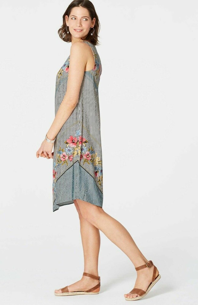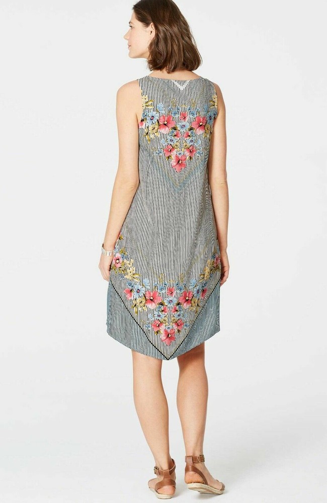 Scarf-Print Dipped-Hem Dress from J.Jill NEW with TAG in J.Jill packaging! Size: XL Our sleeveless A-line dress has allover vertical stripes and a multicolored floral print at the neckline and border. Knee length: 38 1/2 '' Bust: 46" Hip:52" Hemline:54" Sleeveless 100% rayon woven Machine wash, line dry Imported Perfect new condition, first quality, in J.Jill packaging, never worn! Gorgeous addition to your wardrobe! Comes from a smoke free home. ~ 2J7 ~