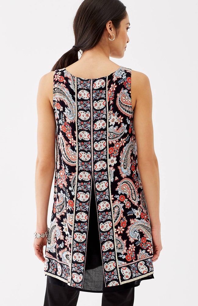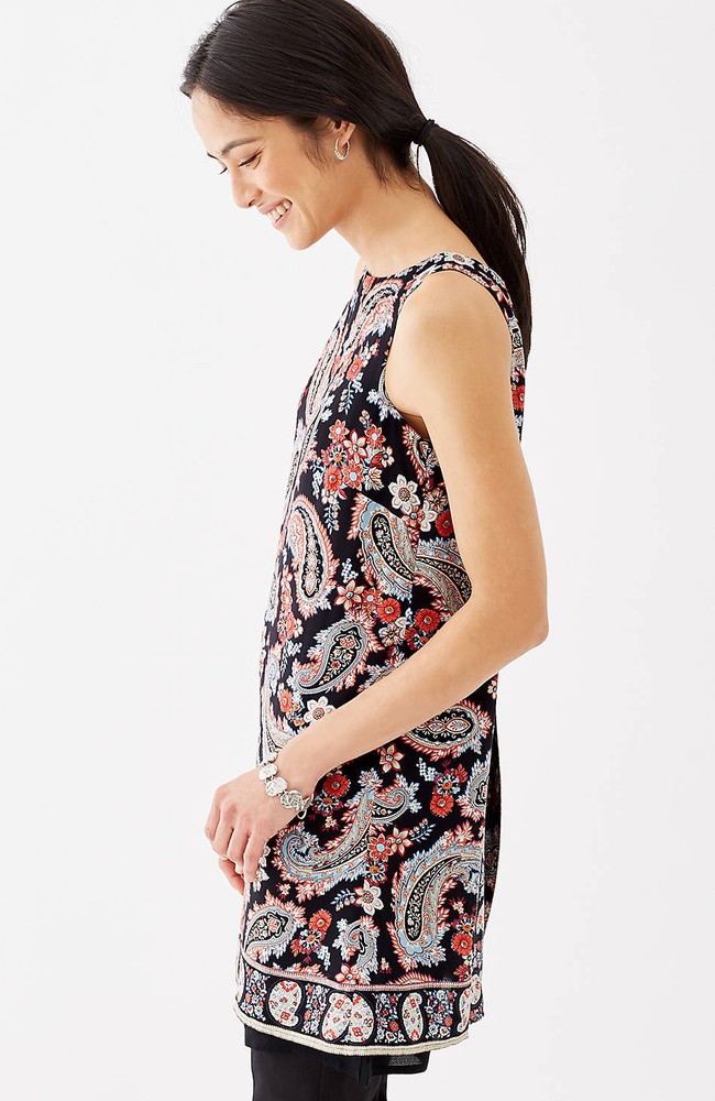 The top layer of our sleeveless tunic has a soft, silky feel and an easy A-line shape. Boat neckline. Bust darts. Allover paisley and floral print. A small paisley border traces the hemline and center back vent. Solid black bottom layer is slightly longer. Thigh length: 32½" Bust: 42" Hip: 48" Sleeveless 100% rayon woven Machine wash, line dry Imported NEW with TAG in J.Jill packaging! Perfect NEW condition, first quality, NEVER worn! Directly from J.Jill! Comes from a clean, smoke free home! MSRP: $89 $69.99 final sell! ~ 1K5 ~