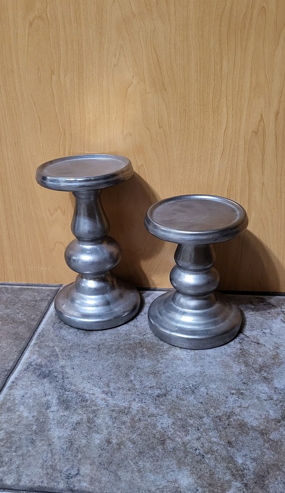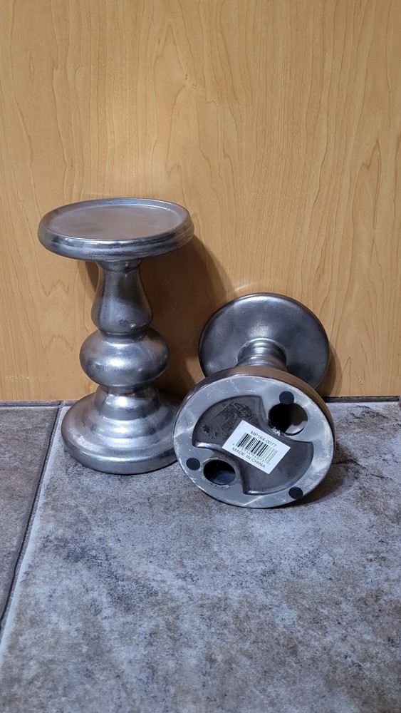 Brand New Brighten up a mantel or table setting with this set of Madison Park Leighton ceramic candle holders, each featuring a luxurious silver-tone finish. Includes one small and one large candle holder Small candle holder, approx. dimensions: 4.5"Dia. x 5.9"H Large candle holder, approx. dimensions: 4.5"Dia. x 7.5"H Each holds up to a 4"Dia. candle Ceramic; electroplated silver finish Gently wipe clean with a damp cloth; handle with care Imported Item will be shipped from a clean, smoke & pet free home. Shipping to the 48 contiguous states in the United States ONLY. I've been buying/selling on eBay since 2003. Feel free to email with any questions. Thank You! Check out all my other listings!