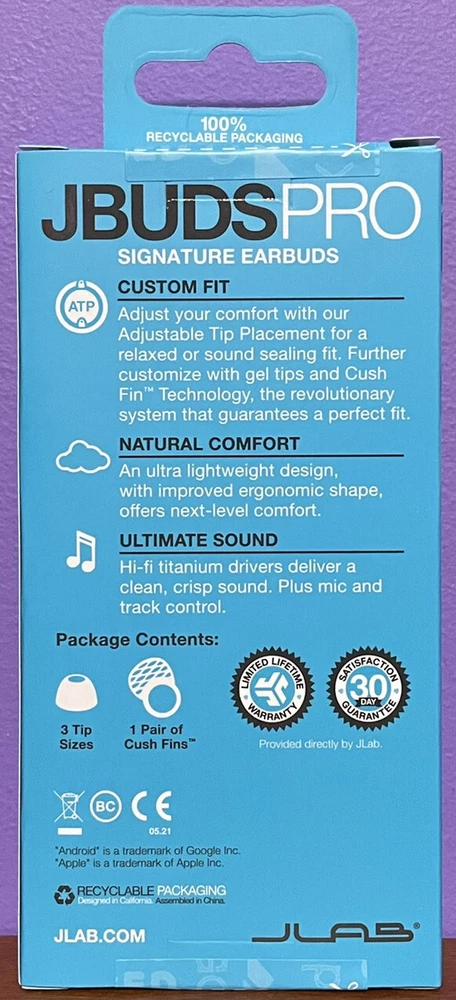 JLAB JBuds Pro Signature Earbuds Titanium 10mm Drivers Music Control WIRED JBuds Pro Signature Earbuds 3 Sets soft silicone gel tip sizes 1 Set Cush Fins Nickel-plated 3.5mm audio jack Universal mic with track controls