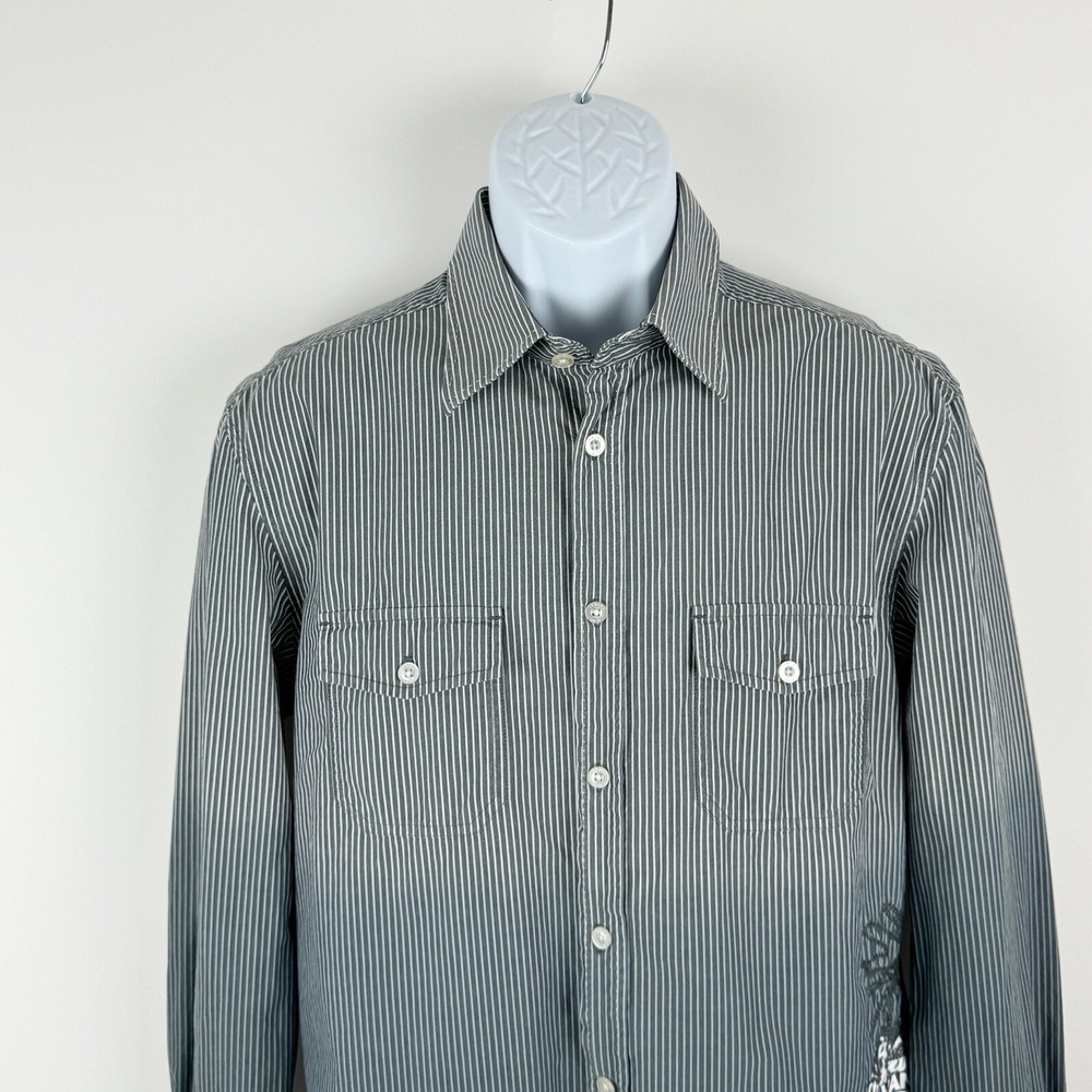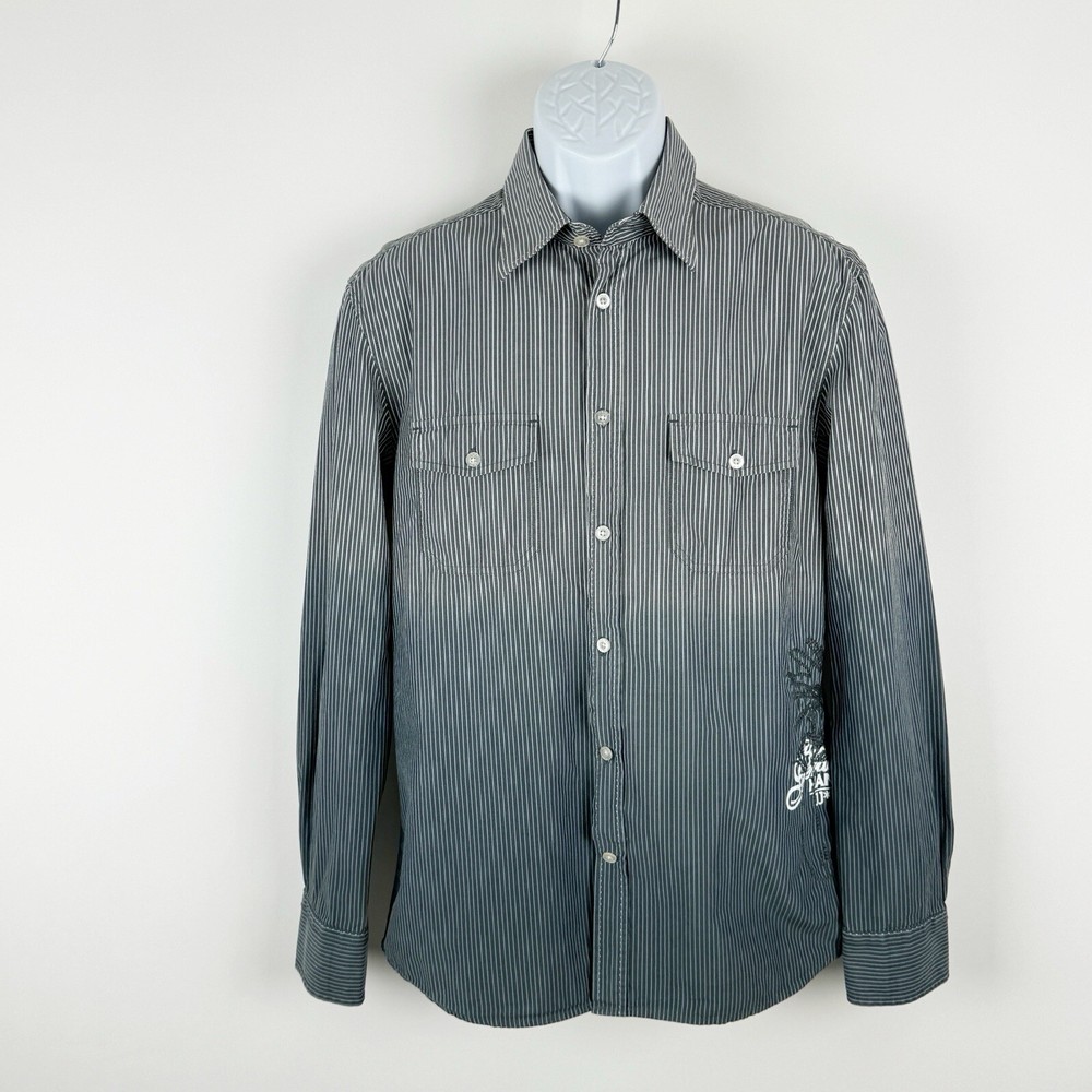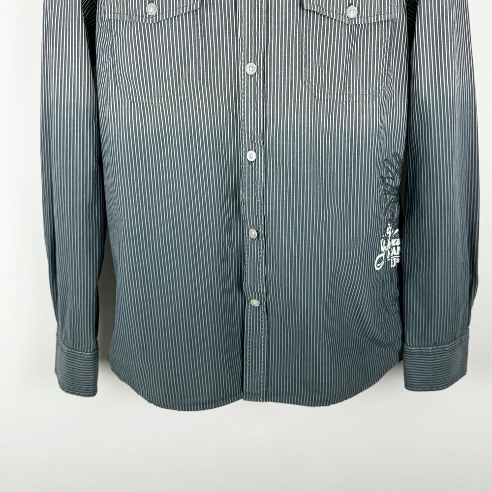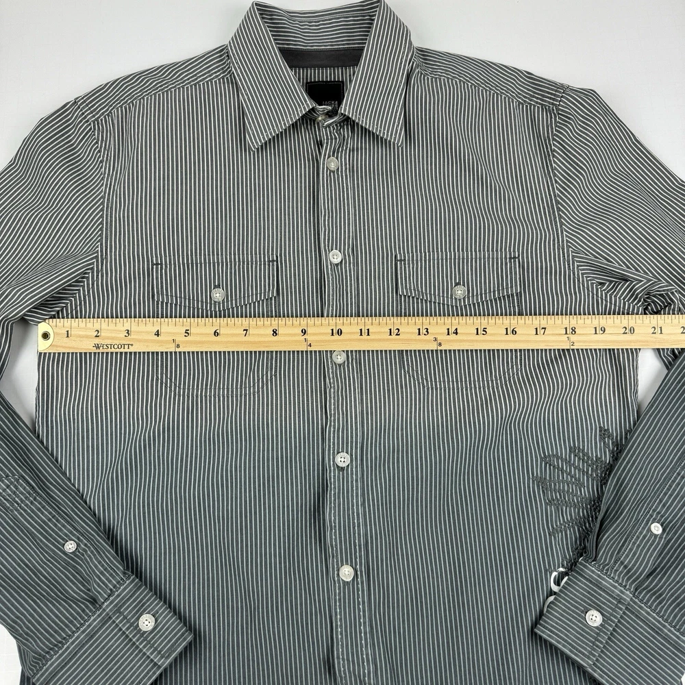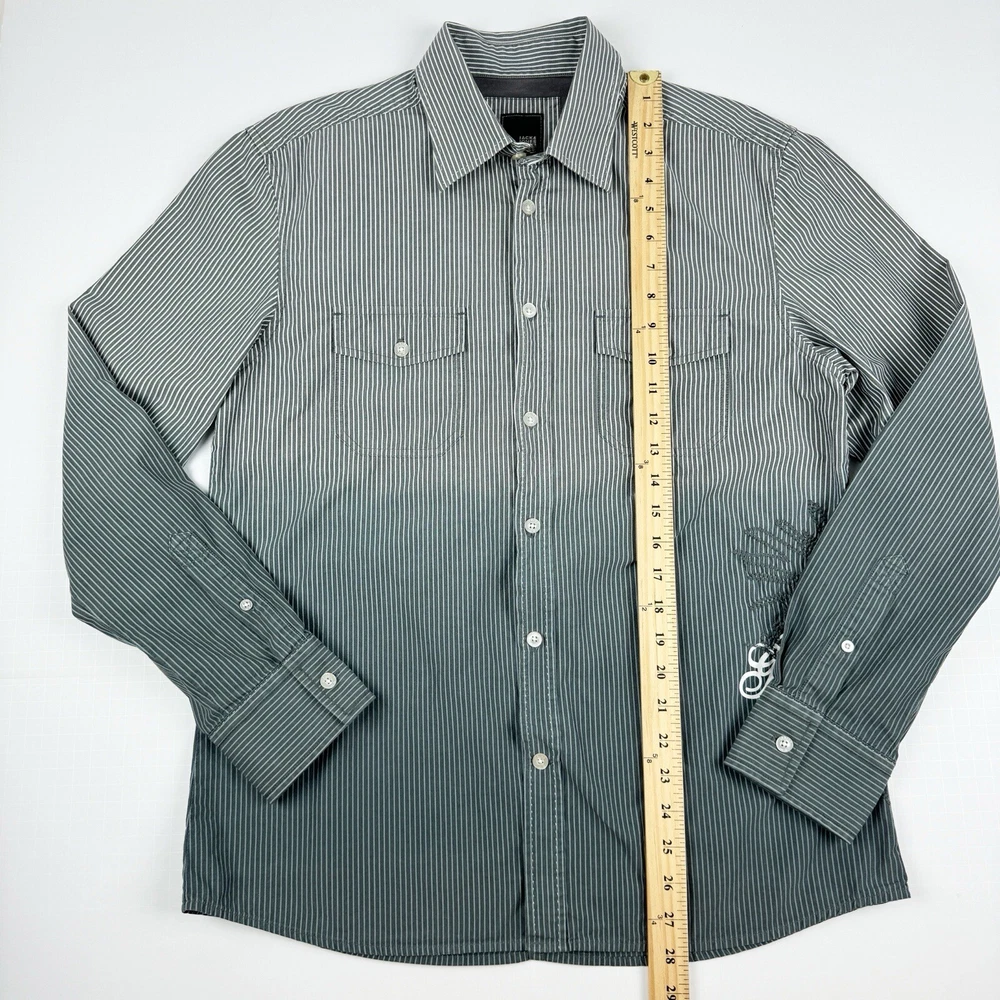 Jack Jones Men's Gray Striped Dip Embroidered Long Sleeve Shirt Size 180/100A 100% Cotton Pre-owned in good condition Underarm to Underarm: 20.5" Length: 28" Questions? Please ask! 0403...