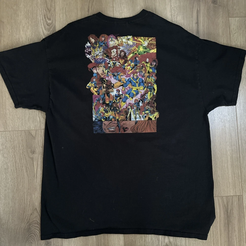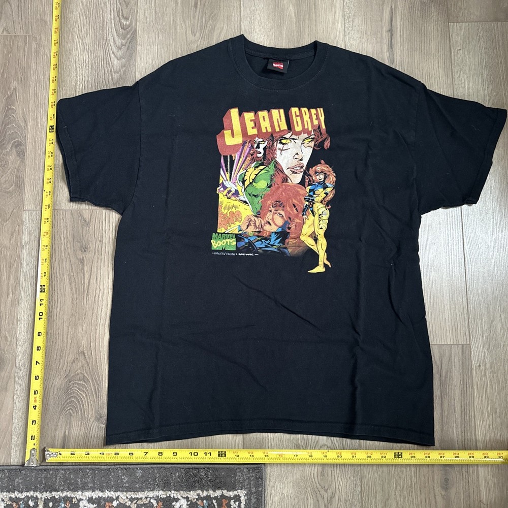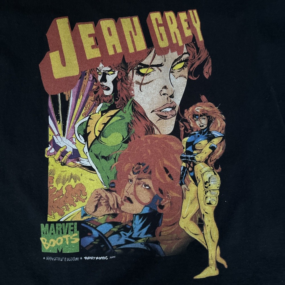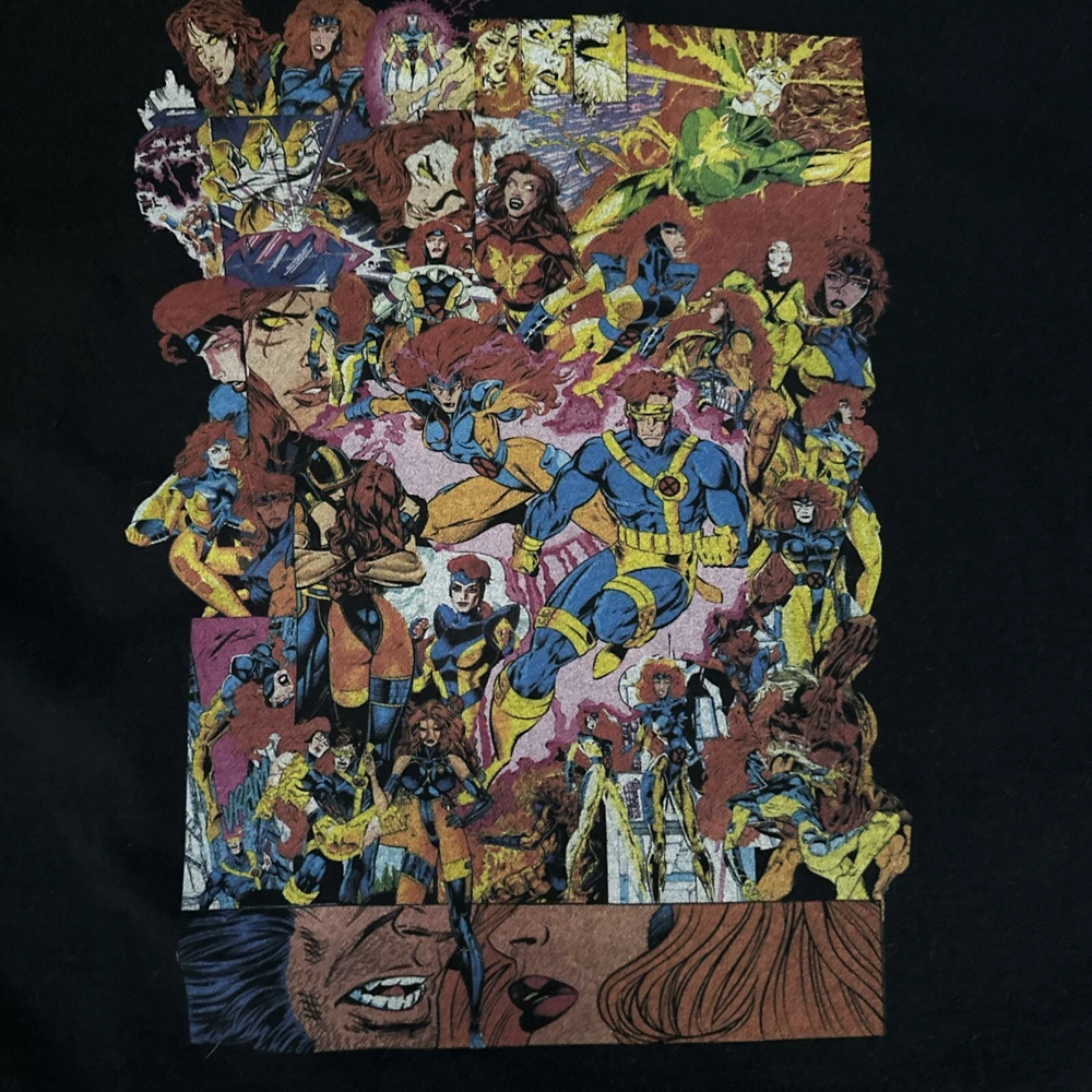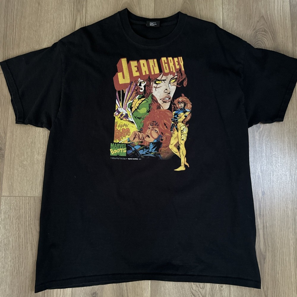 The Marvel X-Men Jean Grey Dark Phoenix Shirt is a graphic print t-shirt featuring characters from the Marvel Universe such as Storm, Deadpool, Iron Man, Cyclops, Spider-Man, Jean Grey, and Wolverine. Made from cotton with a crew neck and short sleeves, this shirt is in size XL and comes in a gray color. The design is inspired by the X-Men comics and movies, with themes of art, retro, and hip hop. This regular fit t-shirt is part of the Bootleg Recording brand and is preshrunk for added durability. Perfect for fans of the X-Men franchise looking to show off their favorite characters.