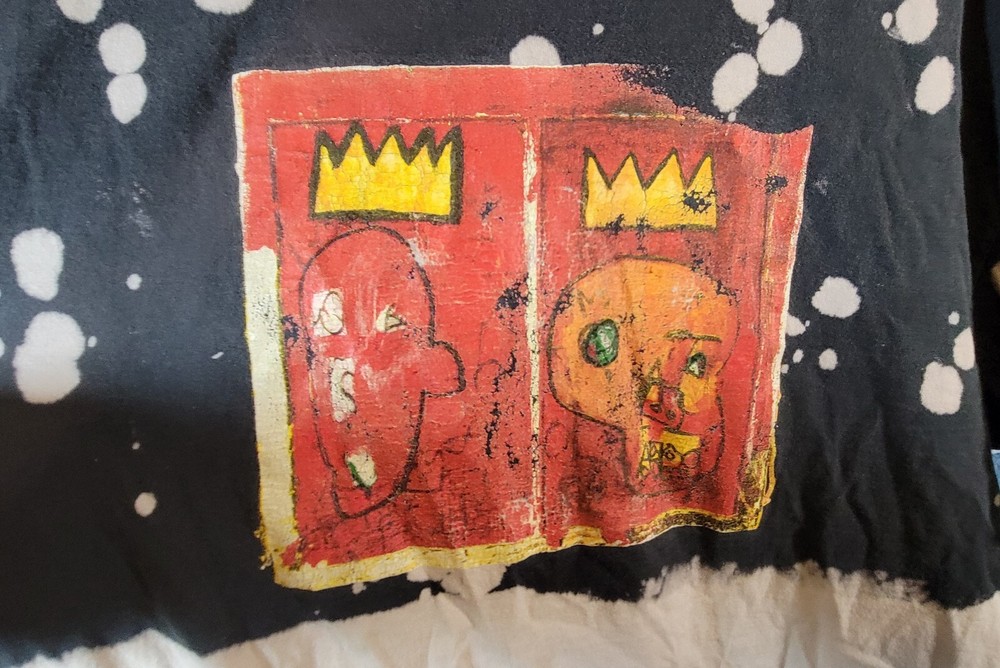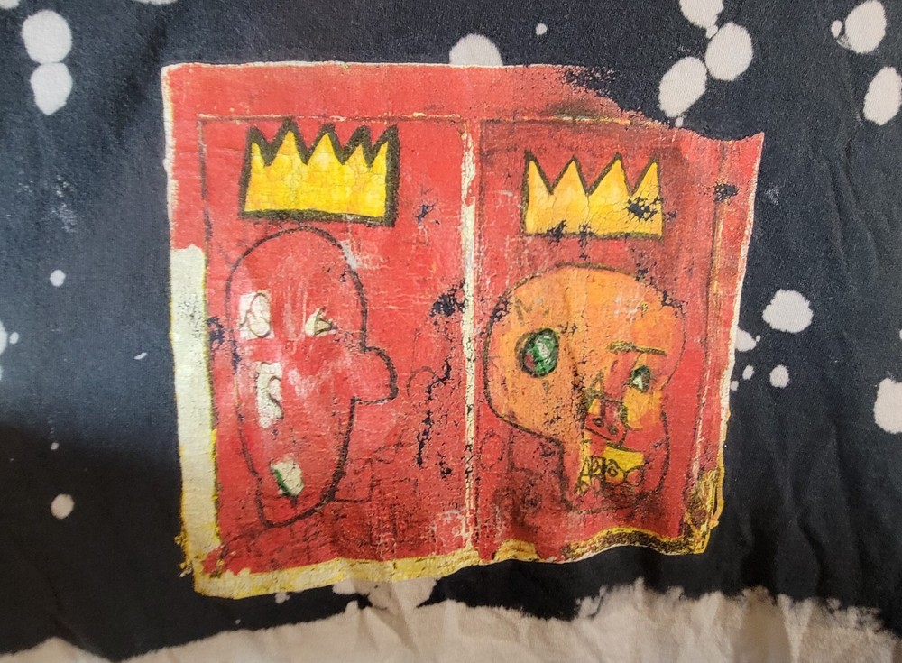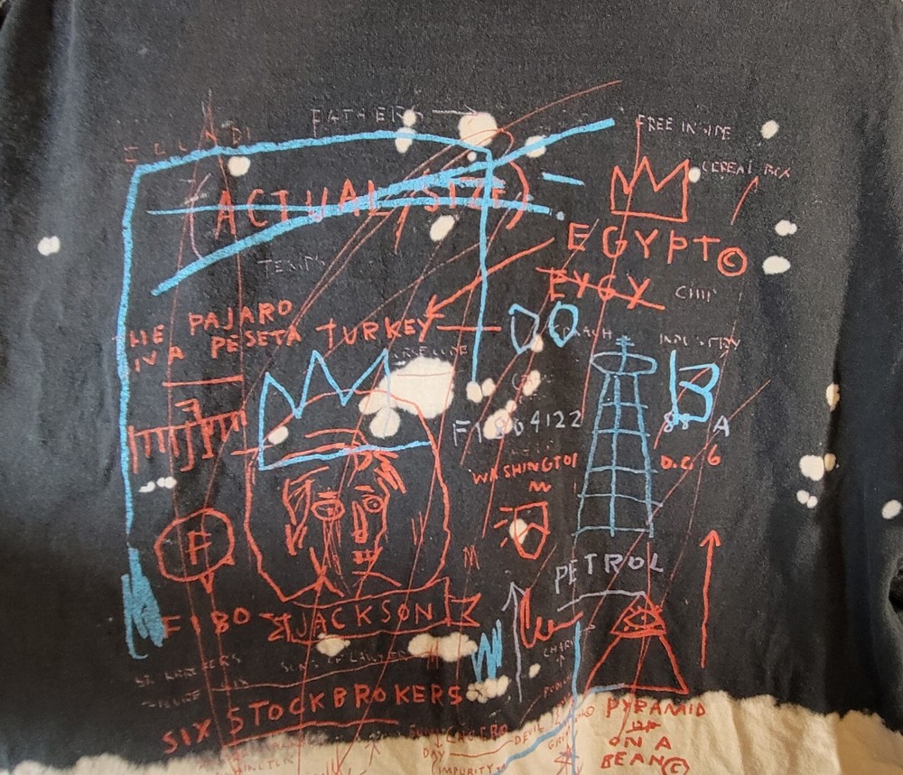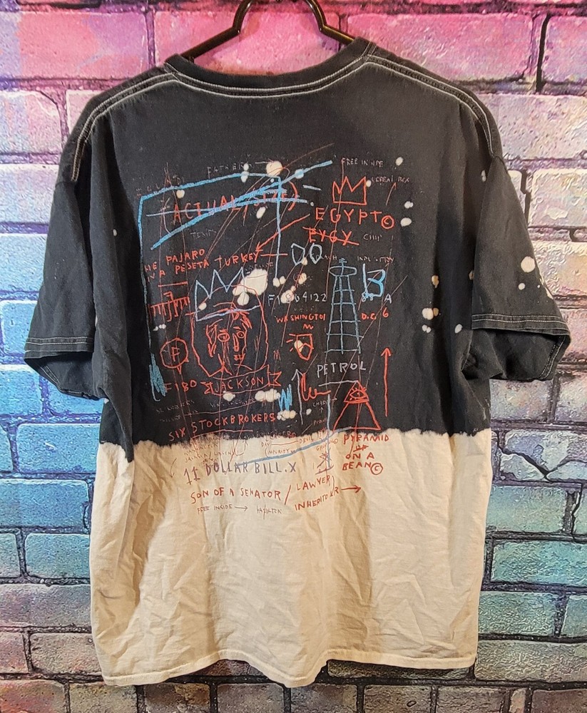 Introducing the Jean-Michel Basquait Dip Dye Tee, a limited edition t-shirt featuring a colorful graphic print. This shirt is made of breathable cotton jersey fabric and has a regular fit with short sleeves and a crew neck. The shirt is machine washable and was manufactured in Haiti in the 2020s. The tee is perfect for fans of Pop Art, Streetwear, Punk, and Hip Hop. It features the iconic Jean-Michel Basquait logo and is part of the Jean-Michel Basquait Dip Dye Tee product line. The shirt is suitable for all seasons and is available in XL size. Don't miss out on this classic and retro piece that will surely make a statement.