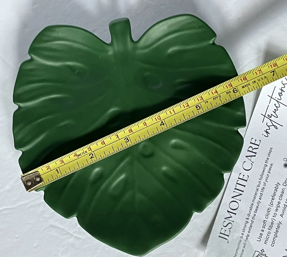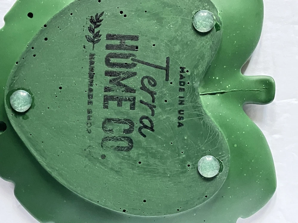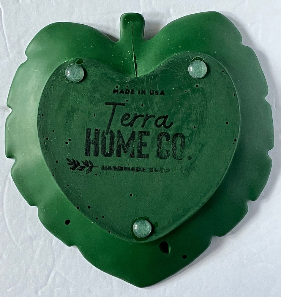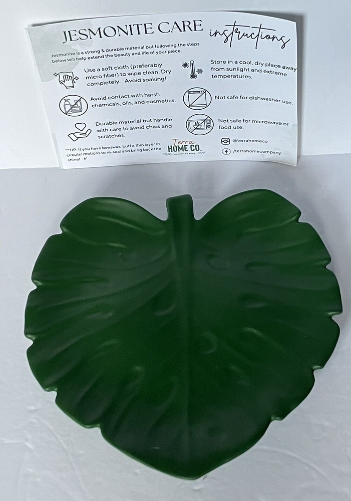 Add a touch of nature to your home with this beautiful handmade trinket dish from terra home co.The green leaf shape is perfect for any season and adds a pop of color to any room. The dish is made with high-quality materials and features a matte finish, making it both decorative and functional. With its unique design and studio-crafted production technique, this trinket dish is an original piece of art .It is perfect for holding small items, such as jewelry or paper clips, and will add a touch of style to any space. Whether you're a collector or simply looking for a unique addition to your home decor, this Jesmonite trinket dish is sure to impress.