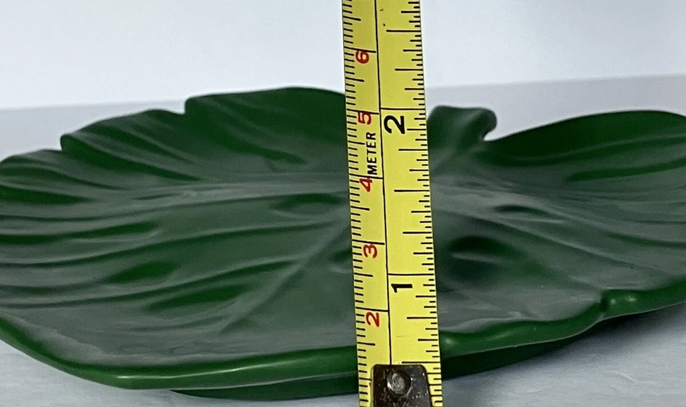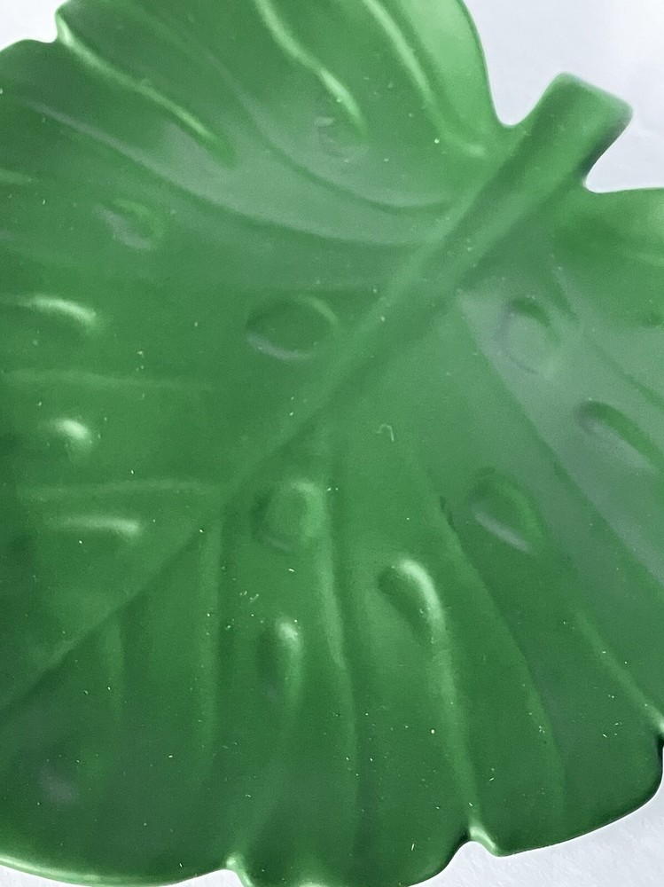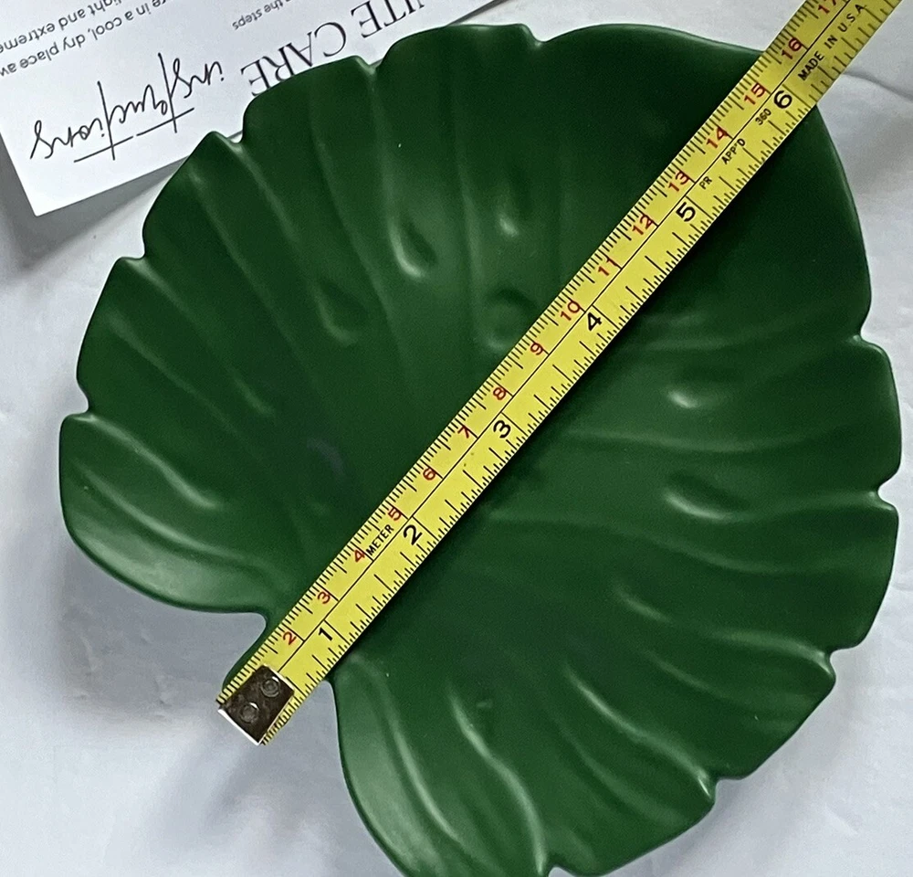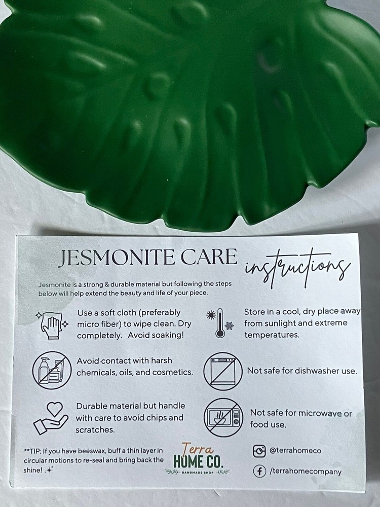 Add a touch of nature to your home with this beautiful handmade trinket dish from terra home co.The green leaf shape is perfect for any season and adds a pop of color to any room. The dish is made with high-quality materials and features a matte finish, making it both decorative and functional. With its unique design and studio-crafted production technique, this trinket dish is an original piece of art .It is perfect for holding small items, such as jewelry or paper clips, and will add a touch of style to any space. Whether you're a collector or simply looking for a unique addition to your home decor, this Jesmonite trinket dish is sure to impress.