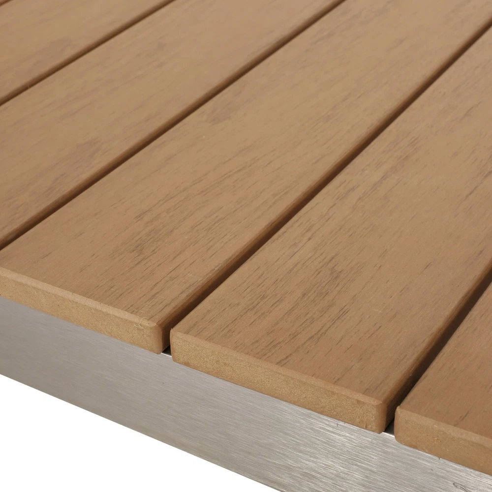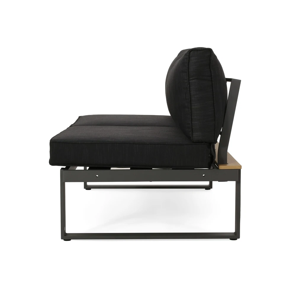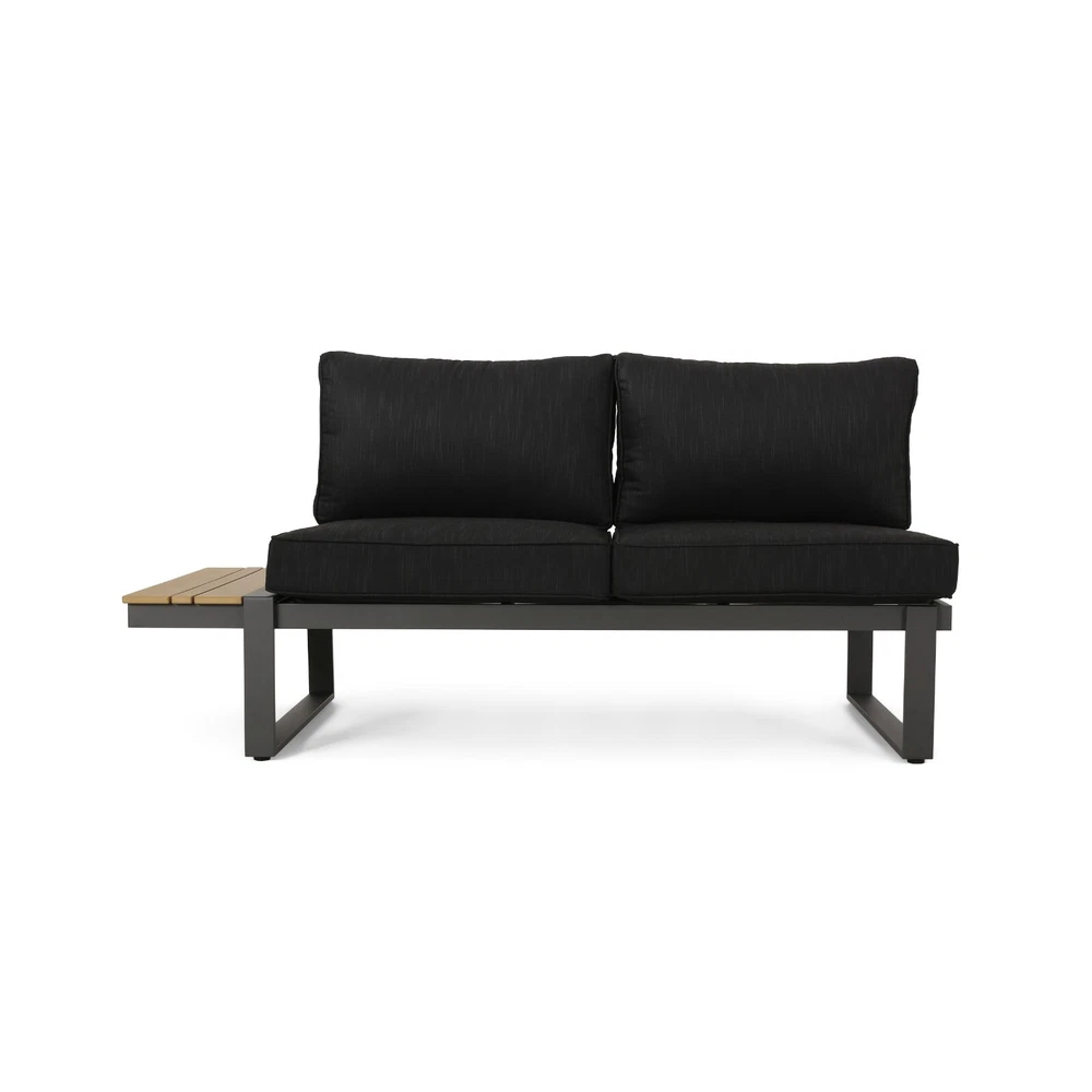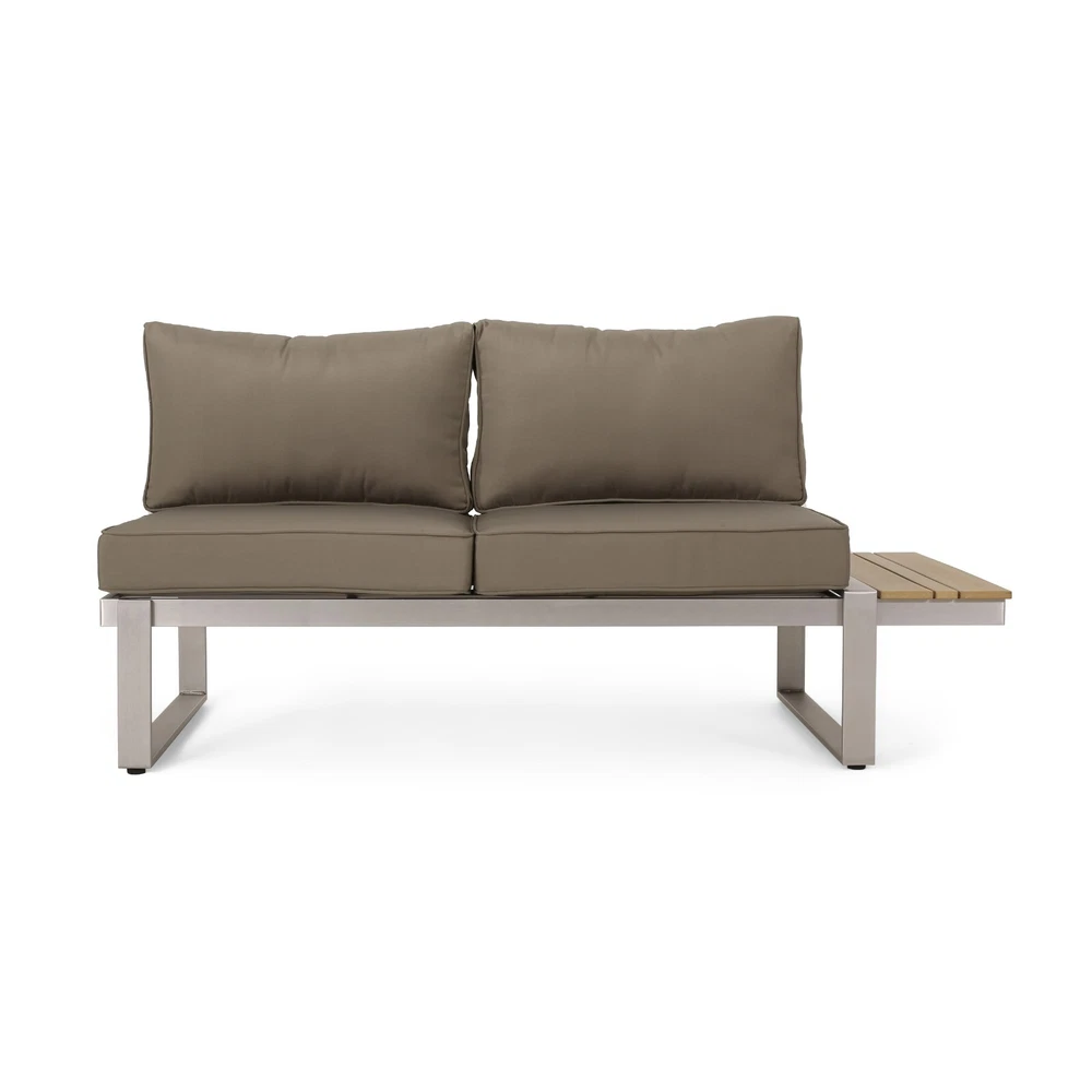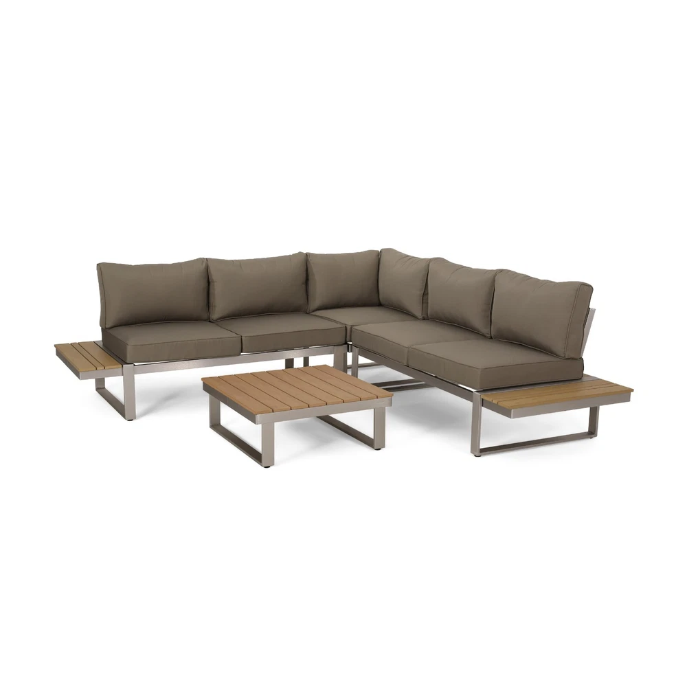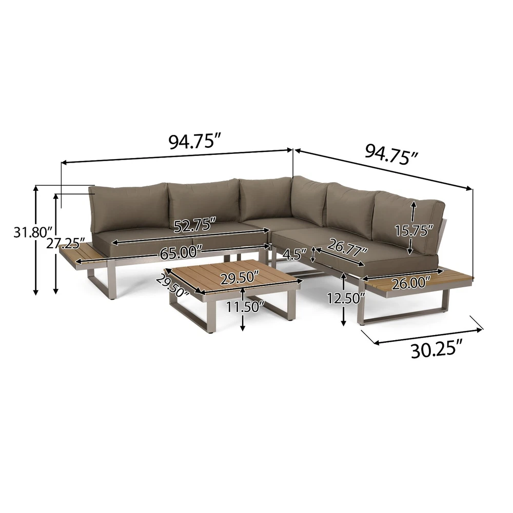 Prepare your summer with a sectional set that will bring a whole new look to your outdoor space. Featuring beautiful faux wood accents atop an aluminum frame, this set brings unparalleled style to your outdoor space as well as convenient space with its built-in side tables. Not only does this set offer a convenient space to set a refreshing drink or a bowl of snacks but it also offers plush water-resistant cushions that provide ultimate comfort for you and your guests, allowing you to enjoy summer to the fullest. ALUMINUM FRAME: This set is built with aluminum, creating a lightweight and stable frame. This material is rust-resistant which will further extend the life of your product. FAUX WOOD ACCENTS: This set features built-in side tables, offering extra space to set down drinks or other items. Made from a wood alternative, these accents are engineered from recyclable materials to give the appearance of a beautiful wood look without the high upkeep. WATER-RESISTANT CUSHIONS: Our cushions are covered with a non-porous material that makes cleaning any spill a breeze. Please note that these cushions are water-resistant and not waterproof. Please do not submerge in water. DIMENSIONS: Choose an accessory that is the perfect size for you and your furniture. This sectional is 94.75” W x 94.75” D x 27.25” H with a coffee table of 29.50” W x 29.50” D x 11.50” H. You will love how much your space can transform with the simple addition of this charming sectional sofa. ASSEMBLY REQUIRED: Some assembly is required for this set. All of the instructions and tools needed for assembly are included. This set includes one left arm sectional, one right arm sectional, one corner seat, and one coffee table. Includes: One (1) Left Sofa;One (1) Right Sofa;One (1) Corner Chair;and One (1) Table Frame Material: Aluminum Accent Material: Faux Wood Cushion Material: Water Resistant Fabric Fabric Composition: 100% Polyester Multiple Color Options Hand-Crafted Details Assembly Required Left Sofa Dimensions: 30.25 inches deep x 65.00 inches wide x 27.25 inches high Left Seat Dimensions: 26.00 inches deep x 52.75 inches wide x 12.50 inches high Right Sofa Dimensions: 30.25 inches deep x 65.00 inches wide x 27.25 inches high Right Seat Dimensions: 26.00 inches deep x 52.75 inches wide x 12.50 inches high Corner Chair Dimensions: 29.75 inches deep x 29.75 inches wide x 27.25 inches high Corner Seat Dimensions: 26.00 inches deep x 26.00 inches wide x 12.50 inches high Table Dimensions: 29.50 inches deep x 29.50 inches wide x 11.50 inches high