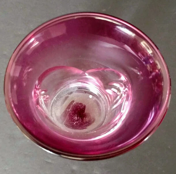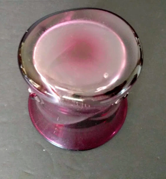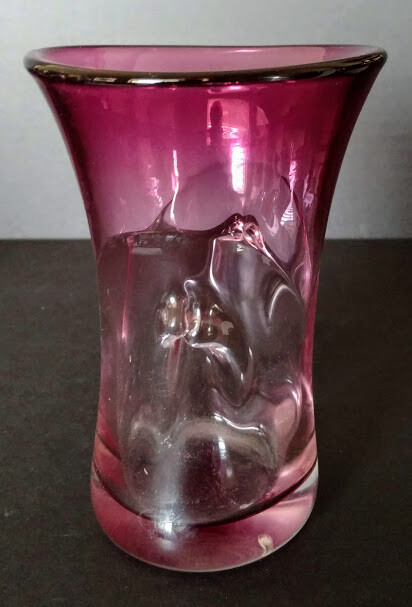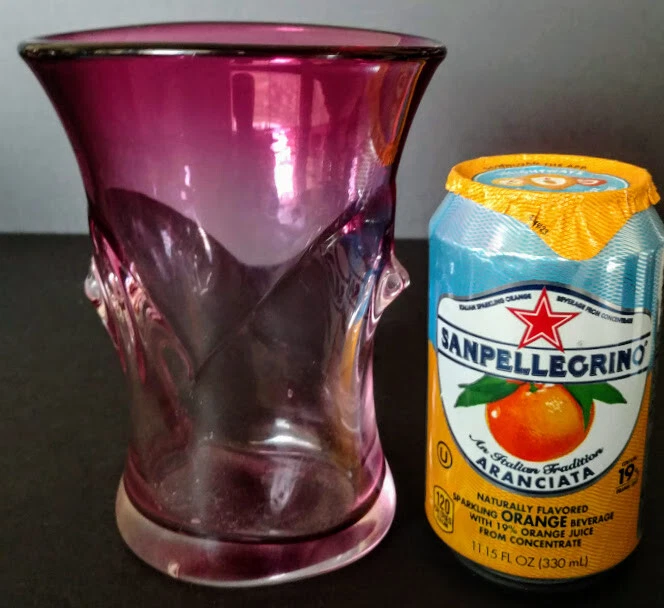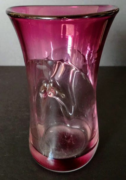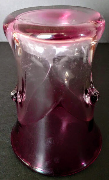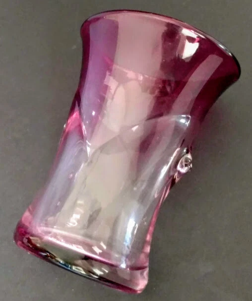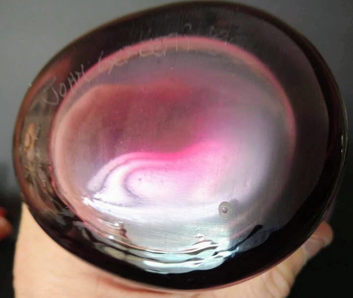John Gerletti Hand Blown Art Glass Amethyst Clear Amethyst Unique Design-Rare One of One piece. Made in Studio in Ventura, CA. Art Glass by John Gerletti's Studio 1985 piece, very unique design, could be a vase, or with it's pseudo handle sculpted design it could be a very classy beer glass! Incredibly shaped while hot, goes wide flared top of dark amethyst glass down to almost clear where the sculpted center goes in kind of a "V" shape which results in to tips of the same design and appear as handles of a sort, then flares open again and gets back to darker amethyst to base, signed John Gerletti 85 on rim of base, clearly. Never seen another in out travels. Measures: 6 inches tall, 5.5 inches deep (vase or beer!) 4.5 inches across at top by 4 inch, slightly oval design, 3.5 inch by 2.75 inch base, thick, weighty piece, well done, beautiful, functional, gorgeous rarer piece by JG back in the hay day! Very unusual, unique, beautiful glass art piece by a master dude!