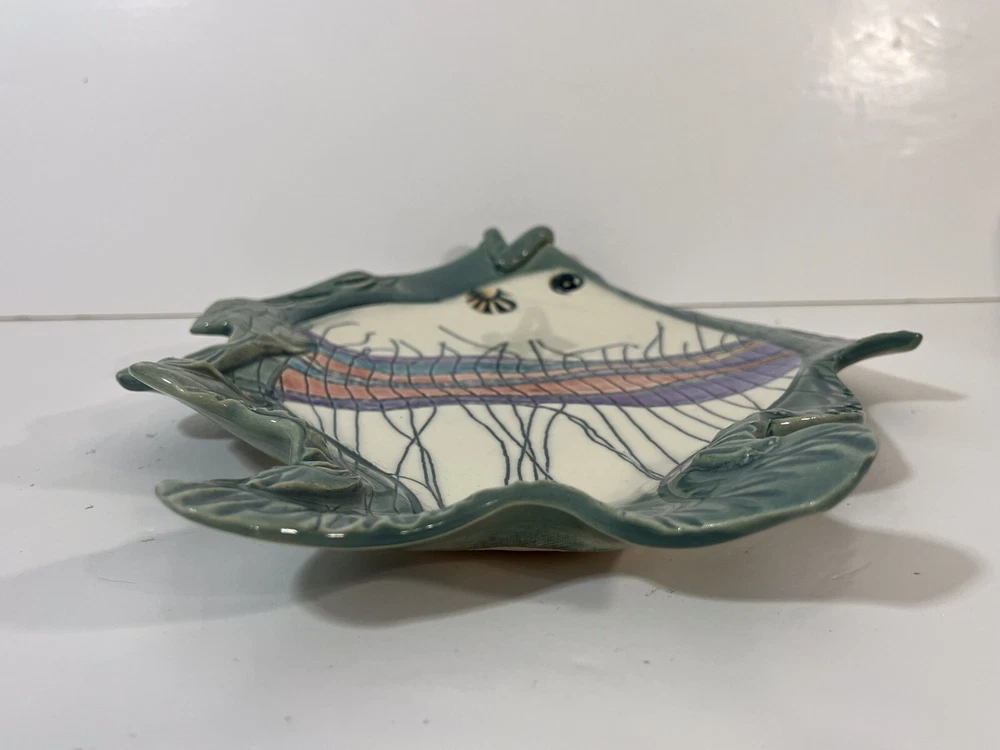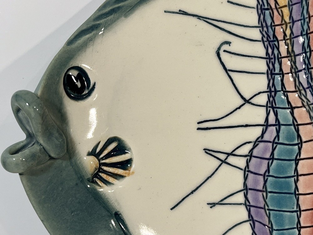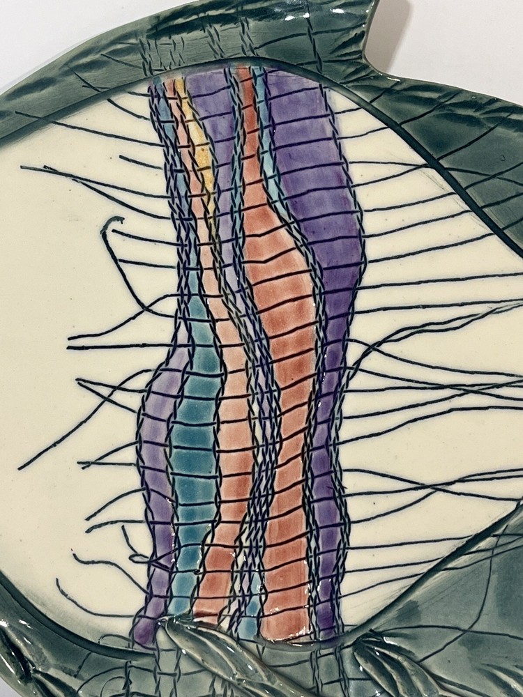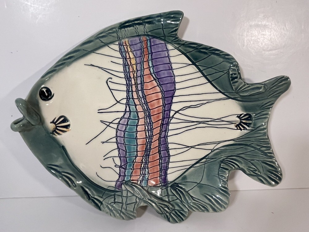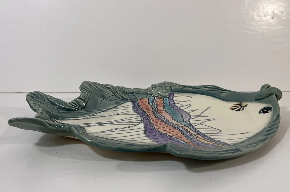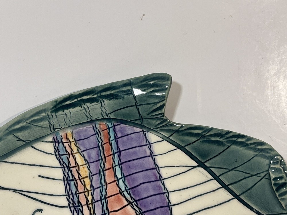 This cute colorful fish bowl/plate was made by John and Jan Myers of Myers Art Studio in Hickory Grove, North Carolina. The fish is sage green and cream with black, purple, salmon, turquoise and yellow accents. It is signed on the bottom of the bowl. The fish is 11.5 long, 9” wide, and 1.5” tall. Very good condition.