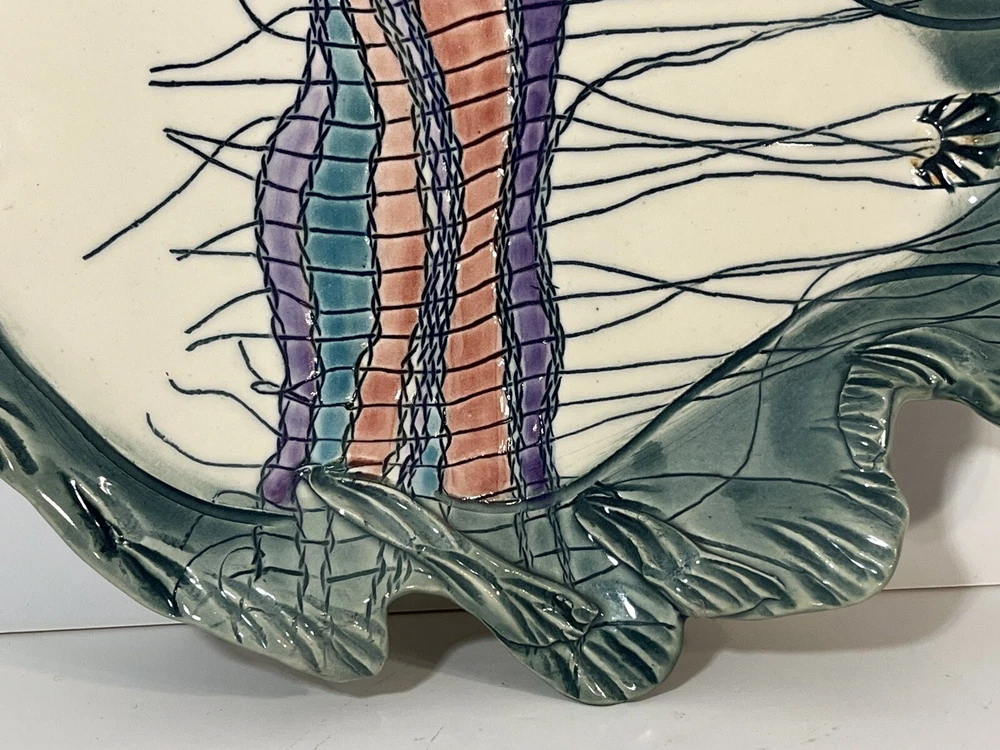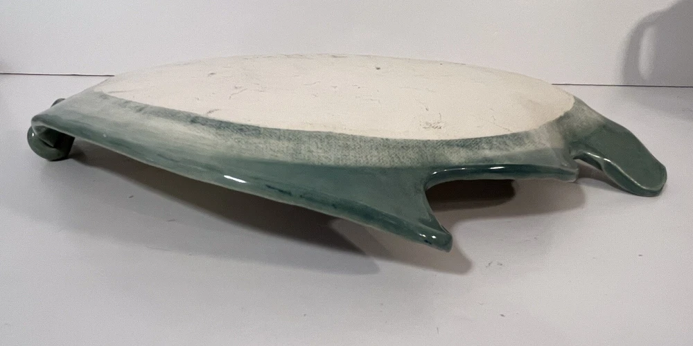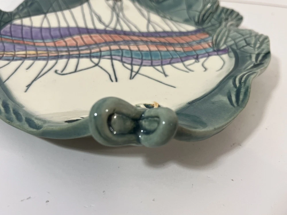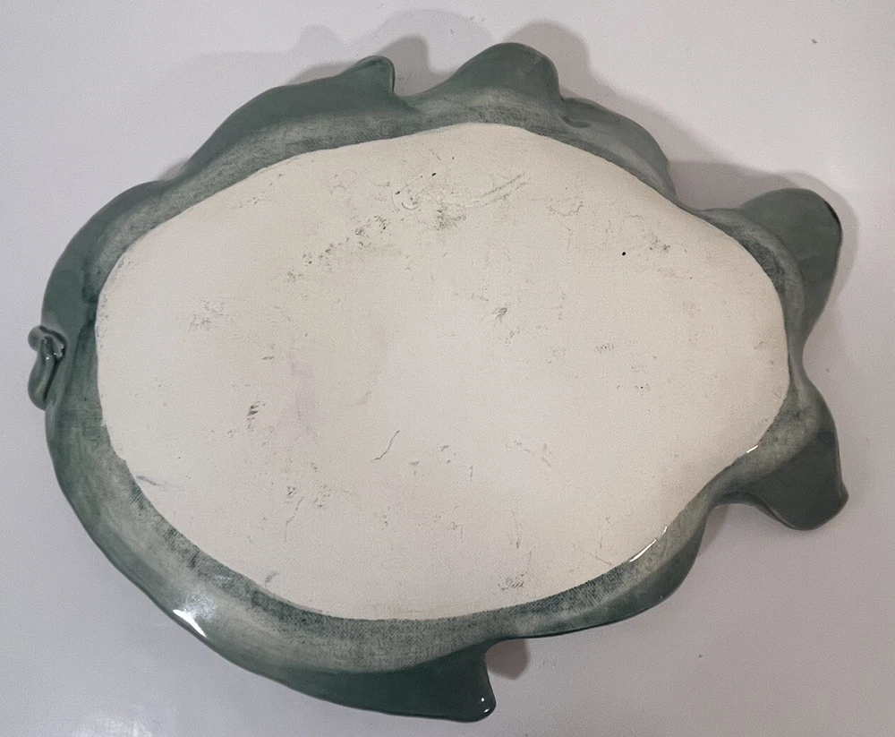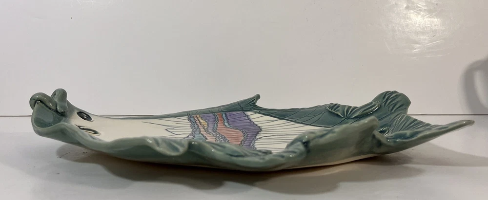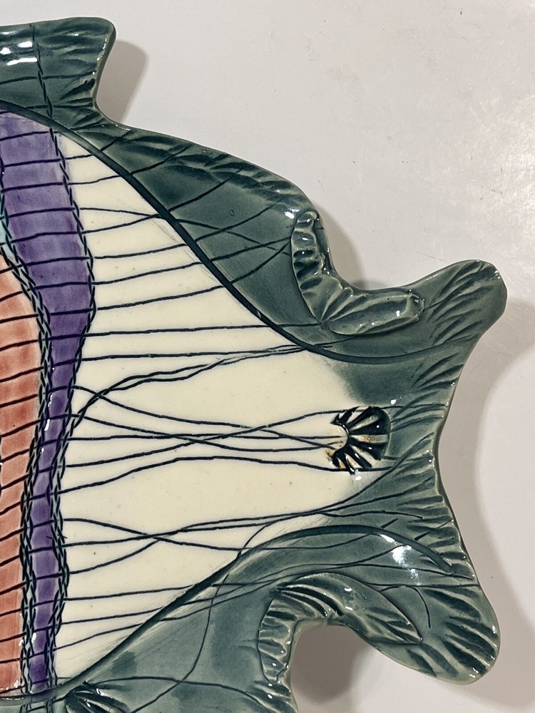 This cute colorful fish bowl/plate was made by John and Jan Myers of Myers Art Studio in Hickory Grove, North Carolina. The fish is sage green and cream with black, purple, salmon, turquoise and yellow accents. It is signed on the bottom of the bowl. The fish is 11.5 long, 9” wide, and 1.5” tall. Very good condition.